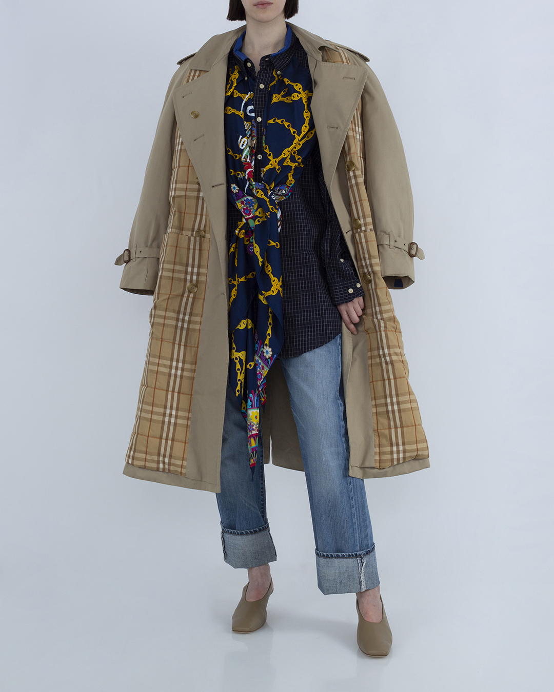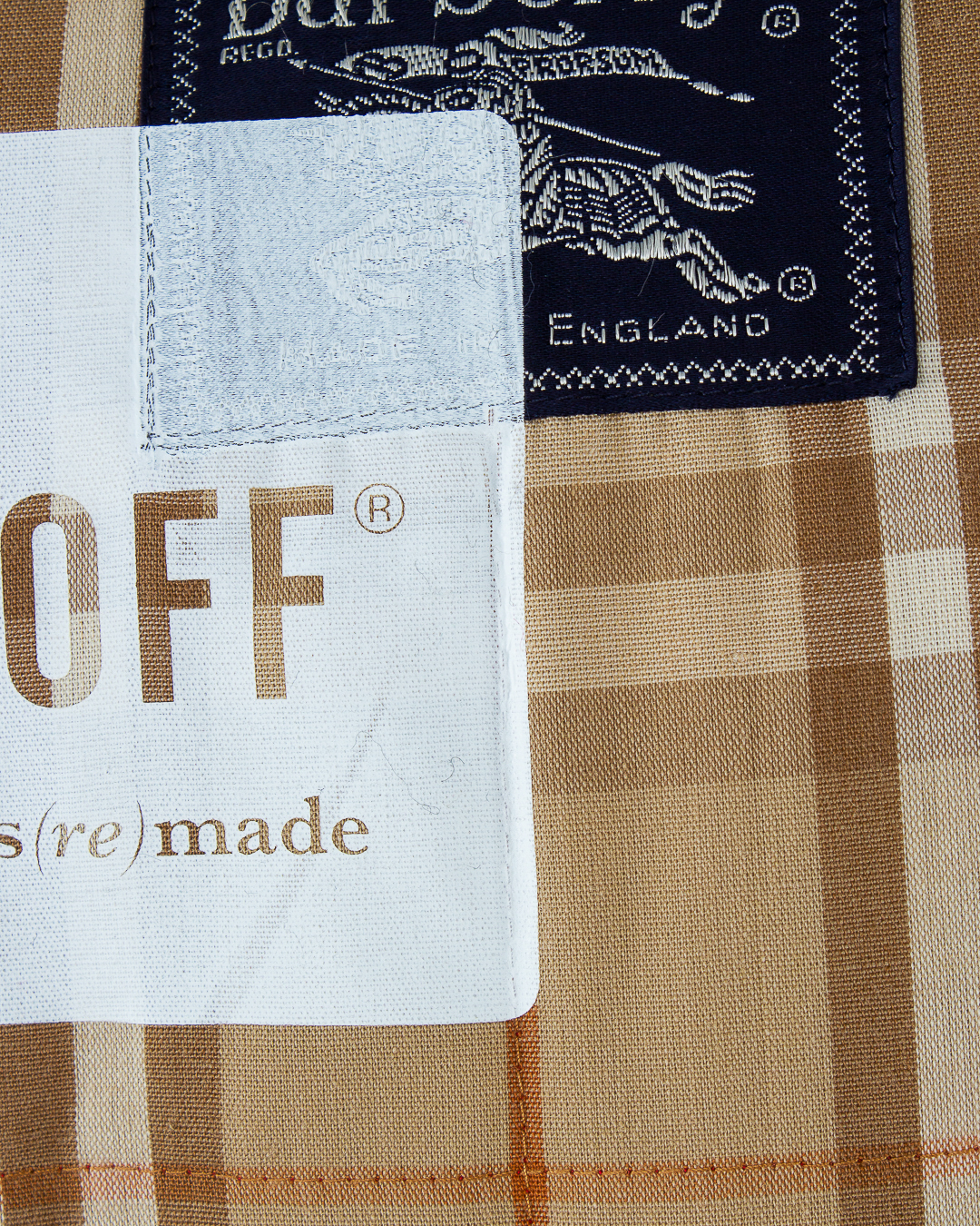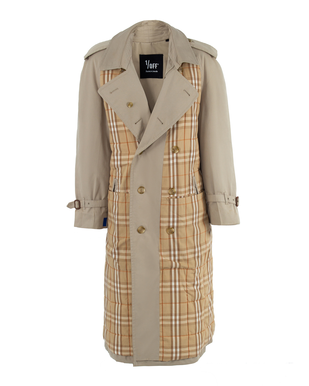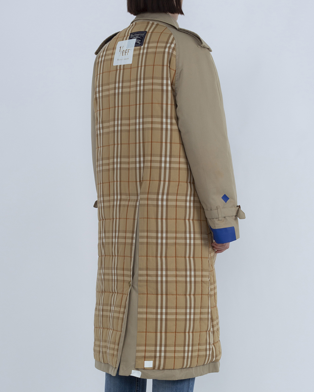Винтажный стеганый тренч наизнанку 1/OFF представляет собой переосмысление легендарного тренча Burberry, добавив культовый клетчатый рисунок на внешнюю часть изделия. В дизайне есть дополнительный слой стеганой набивки для создания теплой альтернативы классическому плащу. Тренч Burberry с логотипом 1/OFF на спине выполнен из хлопка бежевого оттенка, прямой силуэт дополнен двубортной классической застежкой на пуговицы и двумя накладными карманами. Обратите внимание, что винтажная одежда является бывшей в употреблении и может иметь незначительные дефекты. Каждая вещь в коллекции уникальна и создана в единственном экземпляре.