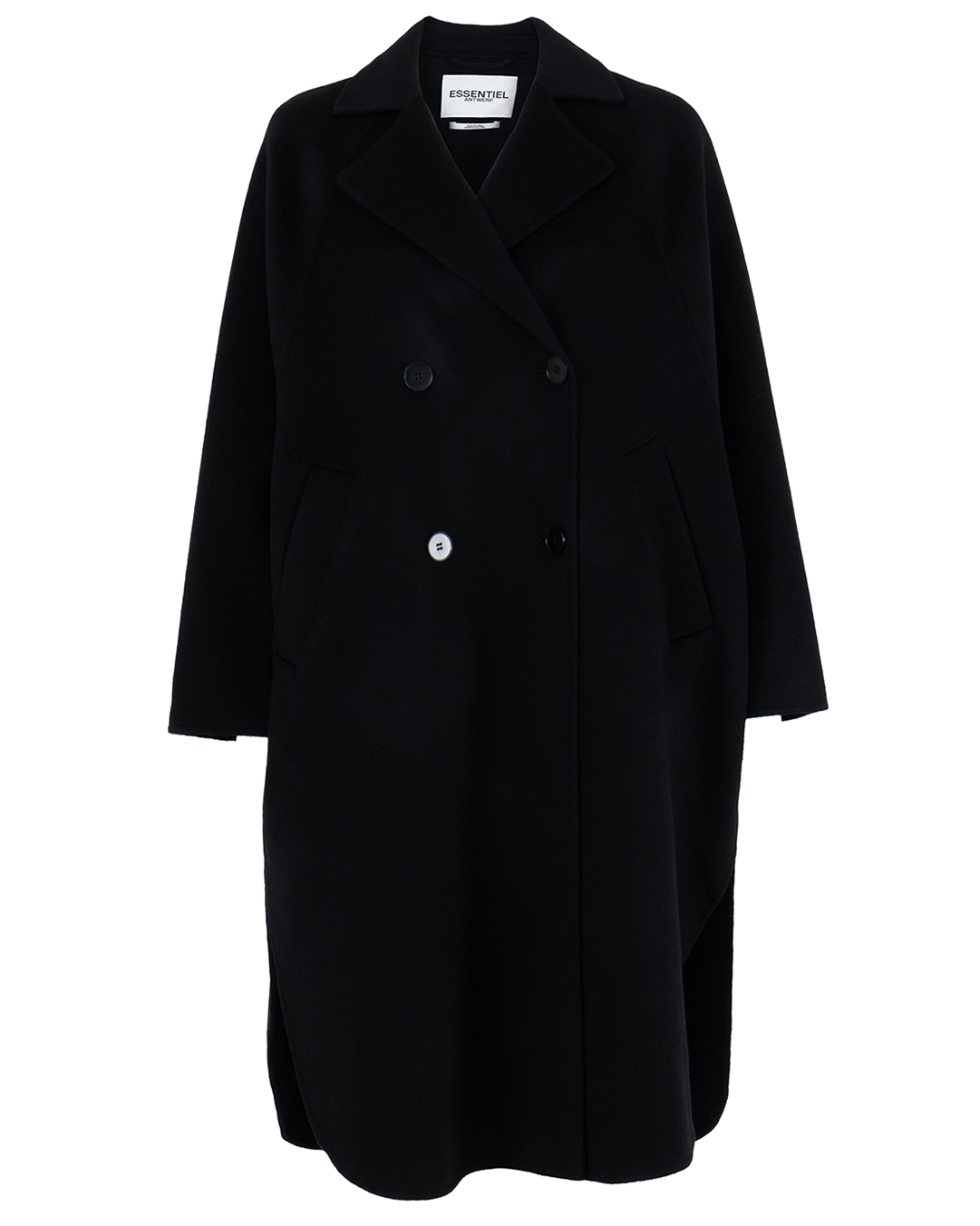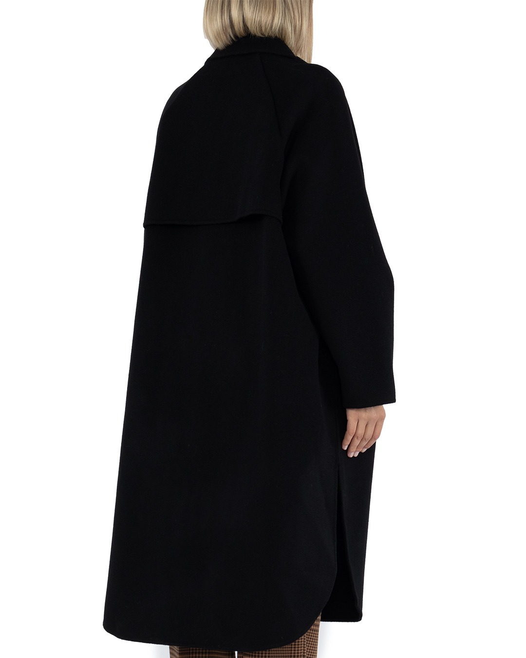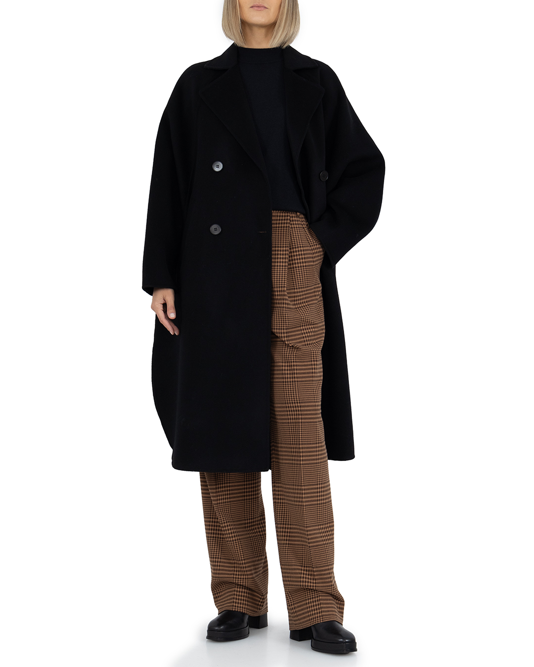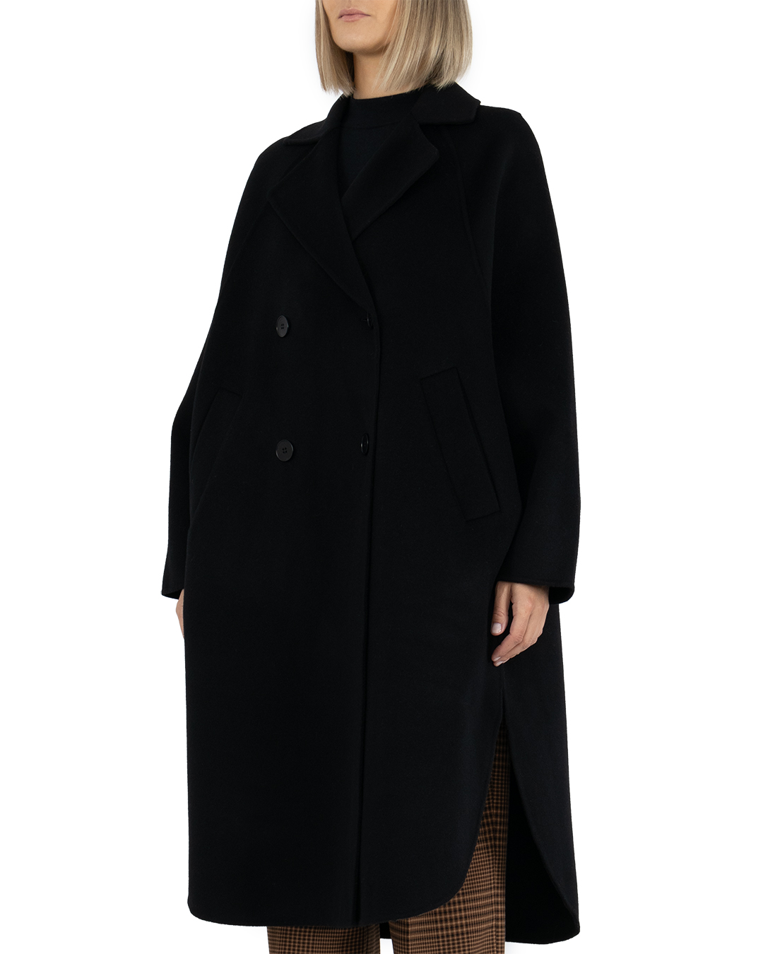 Двубортное свободное пальто с лацканами, выполнили из шерсти. Материал прекрасно держит тепло и создет комфортный микроклимат. Модель безупречно садится по фигуре, а высокие закругленные вырезы по бокам создают особый шарм изделию.