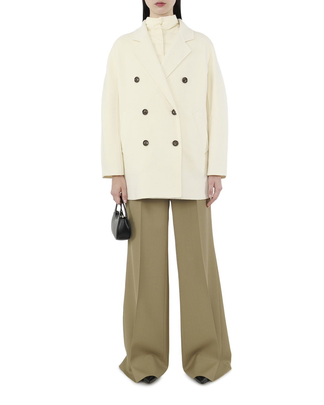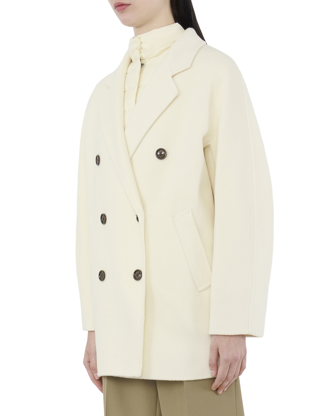 Это превосходное сочетание пальто и куртки демонстрирует идеальный баланс между классикой и современными тенденциями. Выполненное из высококачественной шерсти и дополненное утеплённой вставкой из нейлона, оно обеспечивает комфорт и стиль в любую погоду. Классический двубортный крой с широкими лацканами придаёт модели структуру и строгость, а светлый кремовый оттенок добавляет нотку элегантности и свежести. Эффект многослойности достигается за счёт интеграции куртки с воротником-стойкой, что добавляет изделию функциональности и тепла. Крупные пуговицы контрастного оттенка служат акцентом, подчеркивая изысканные линии пальто и придавая завершённость образу. Карманы с клапанами добавляют практичности, не нарушая общей гармонии дизайна. Это пальто-куртка станет идеальным выбором для тех, кто ценит изысканный стиль и высокое качество, позволяя оставаться в центре внимания в любой ситуации.