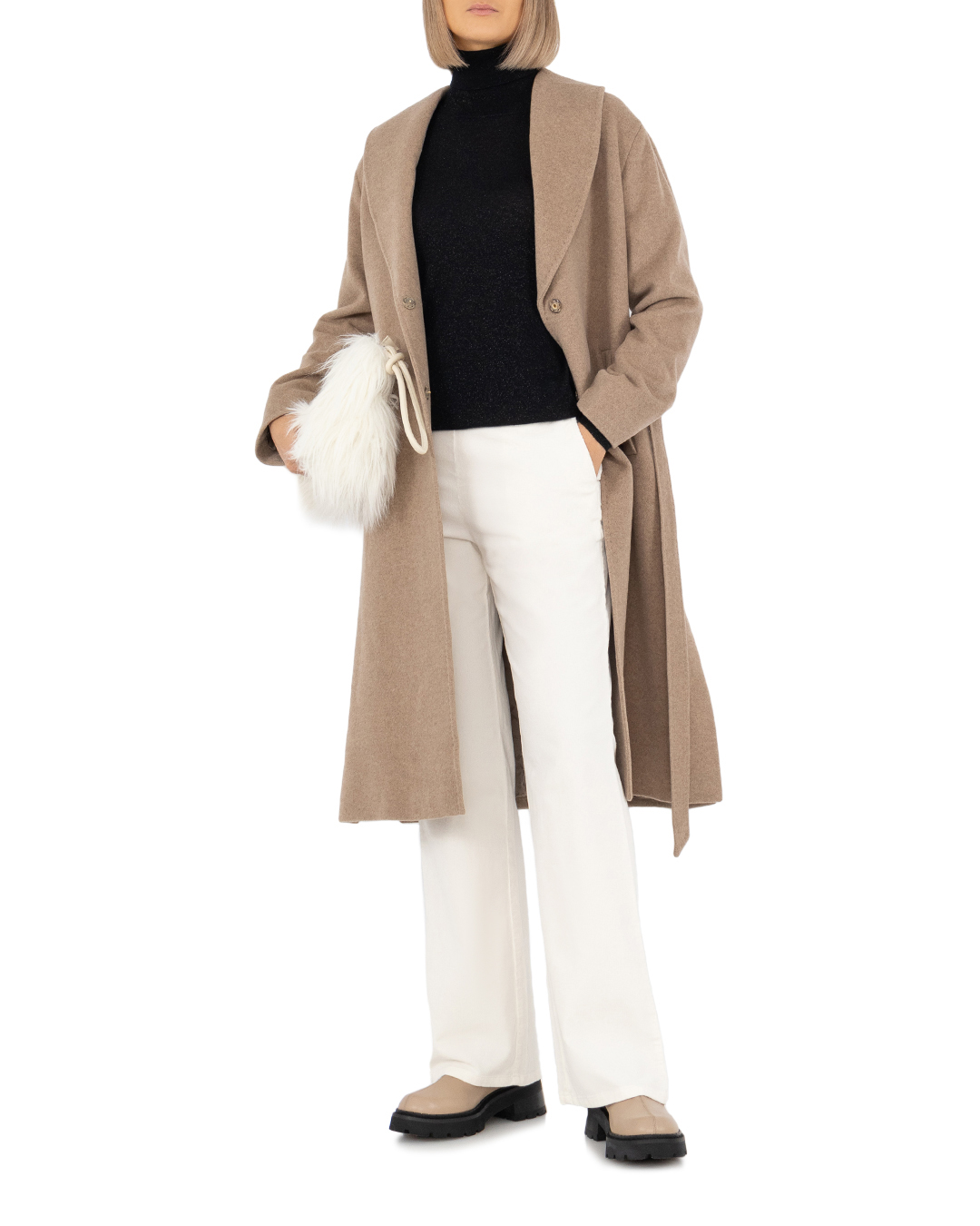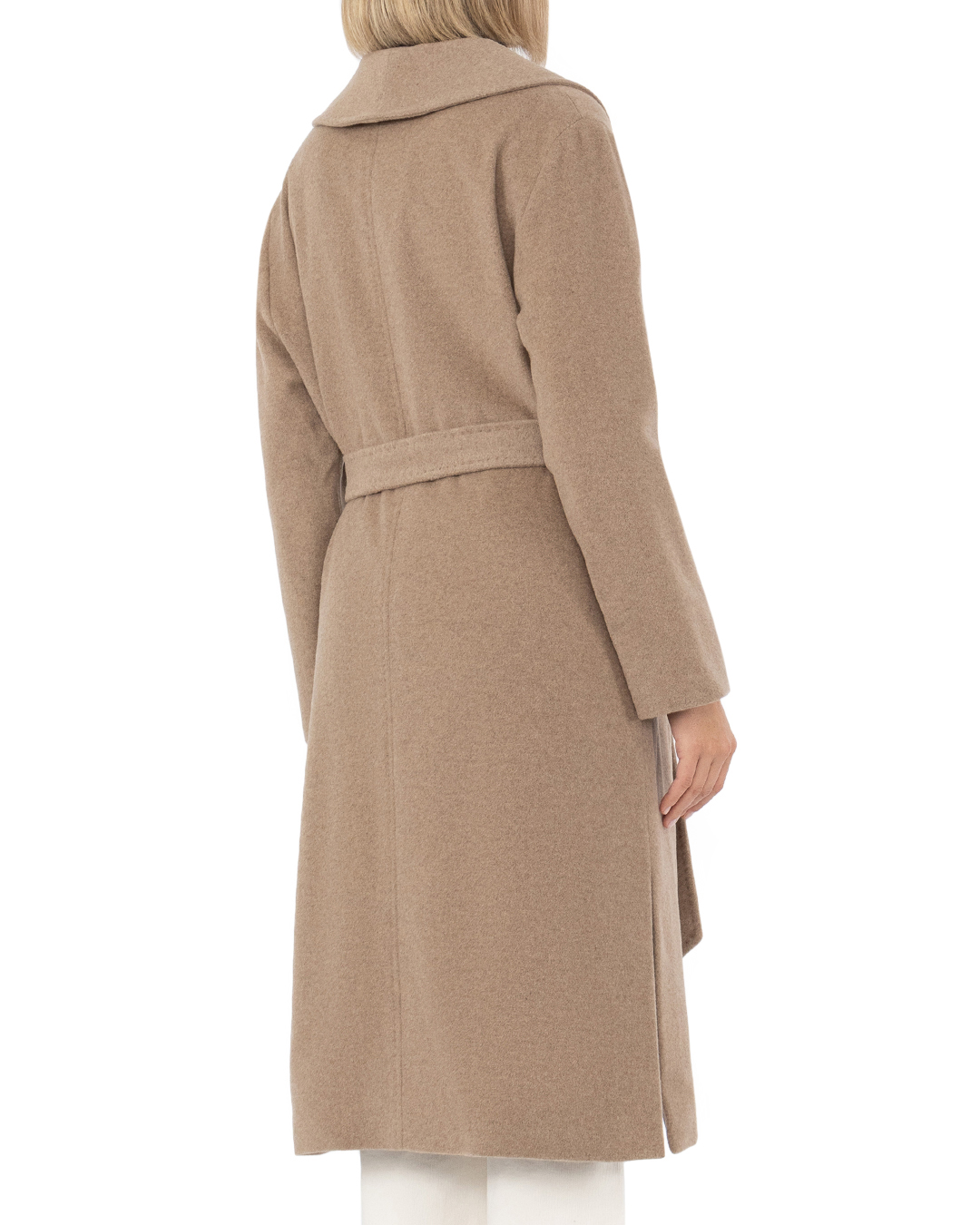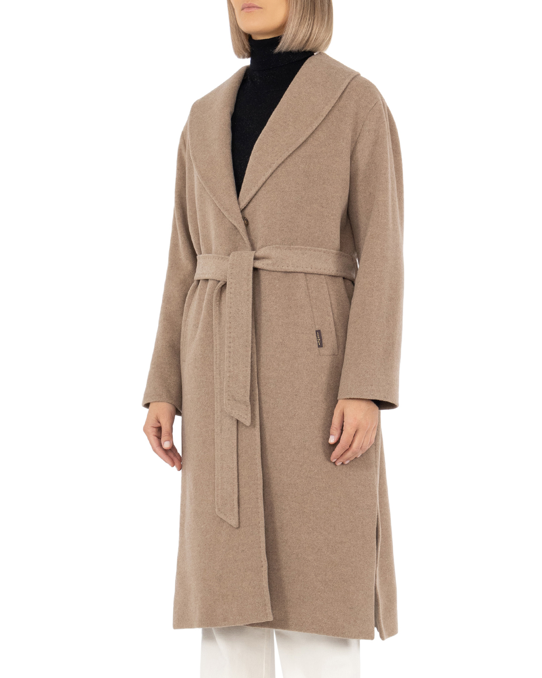 Пальто на запах с поясом выполнено из шерстяной ткани с добавлением кашемира. По бокам два врезных кармана. Прямой крой и пояс эффектно подчеркнут элегантный силуэт.