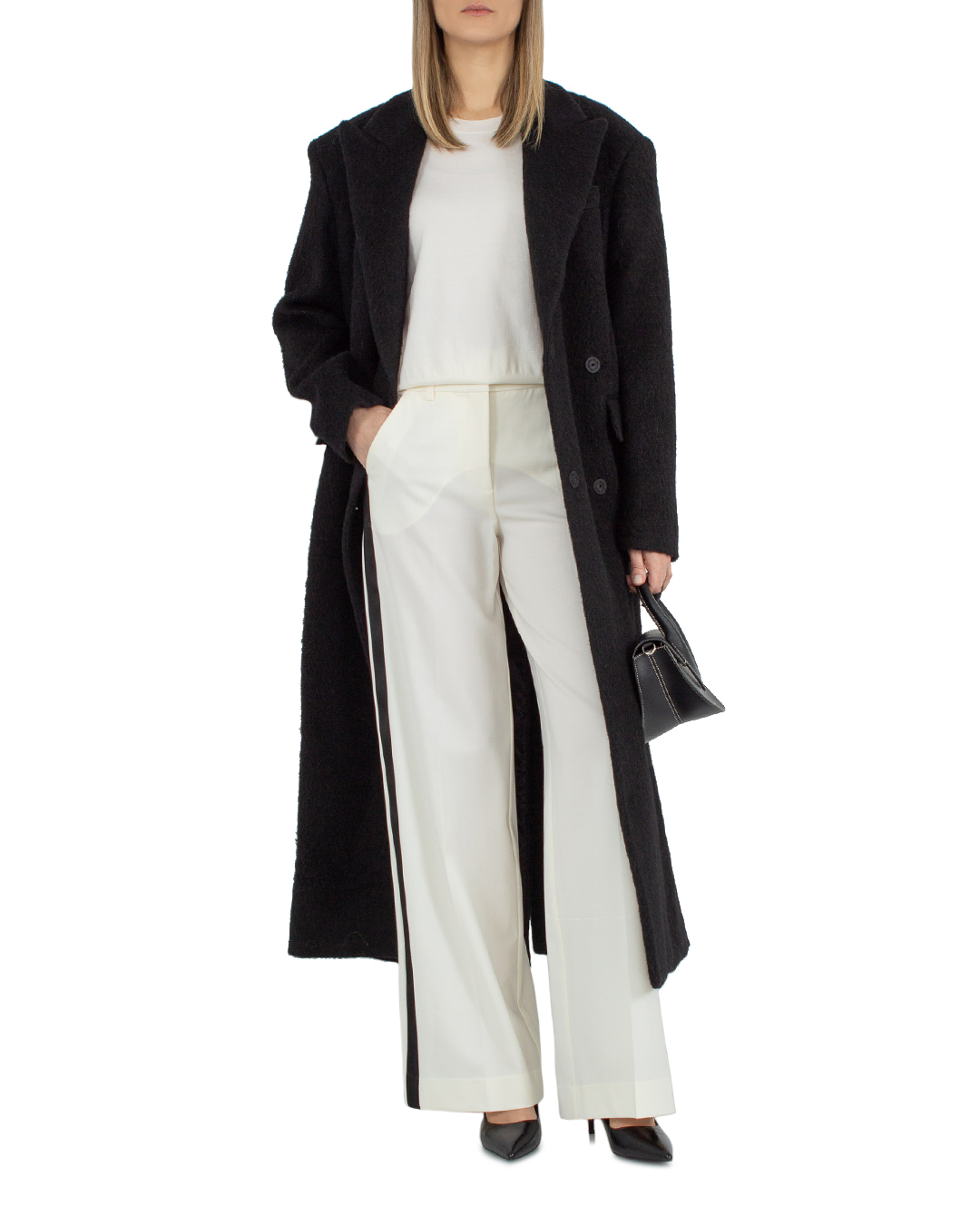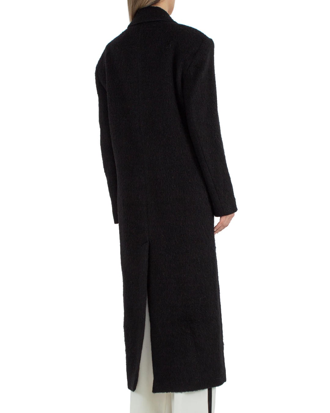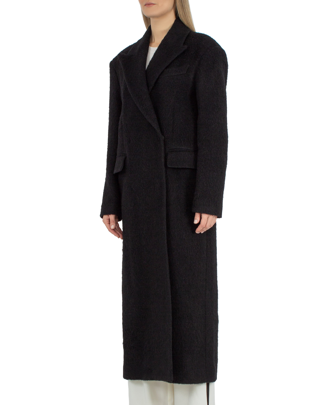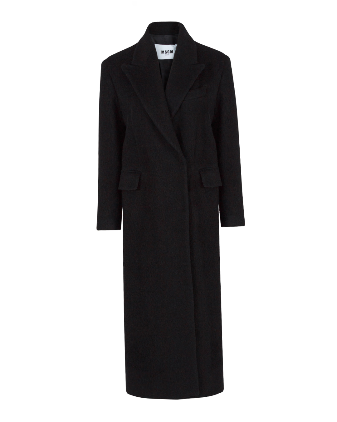 Пальто MSGM сшито из мягкой ворсистой шерсти. Модель длины макси прямого слегка приталенного силуэта с двубортной застежкой на пуговицы дополнена отложным воротником и двумя прорезными карманами с клапанами по бокам.