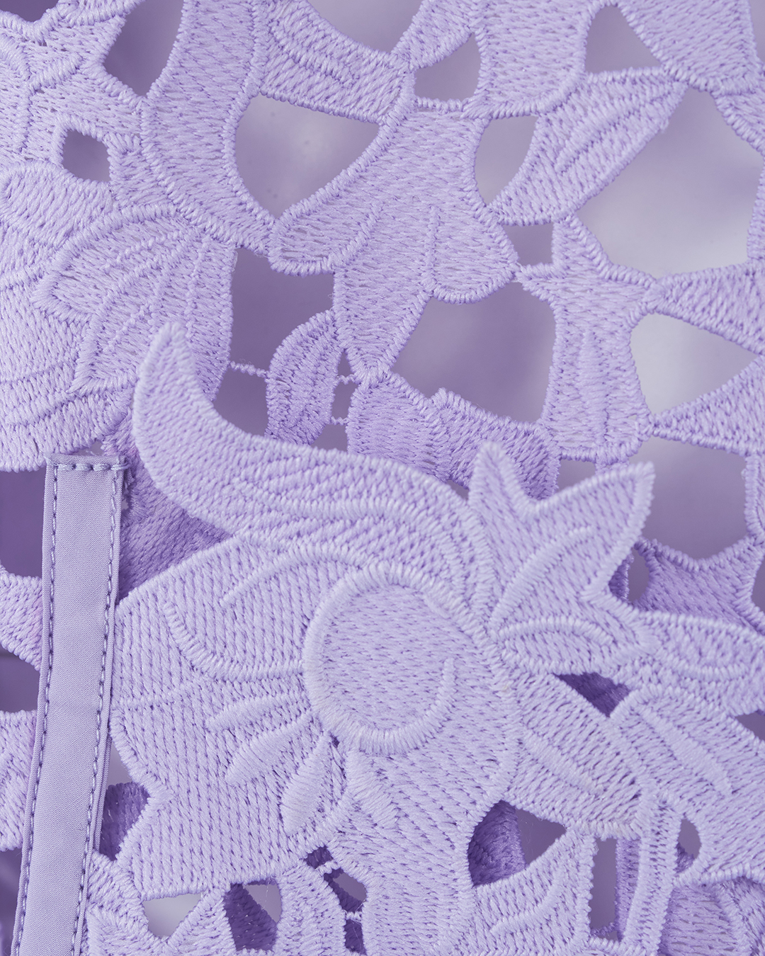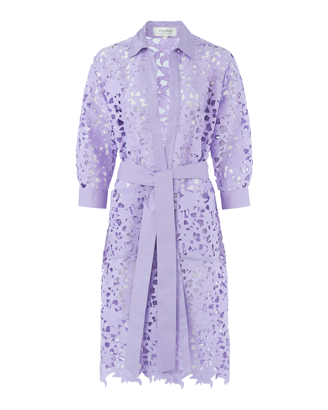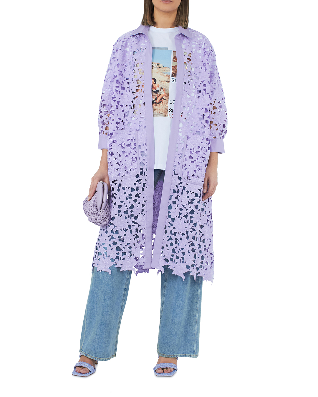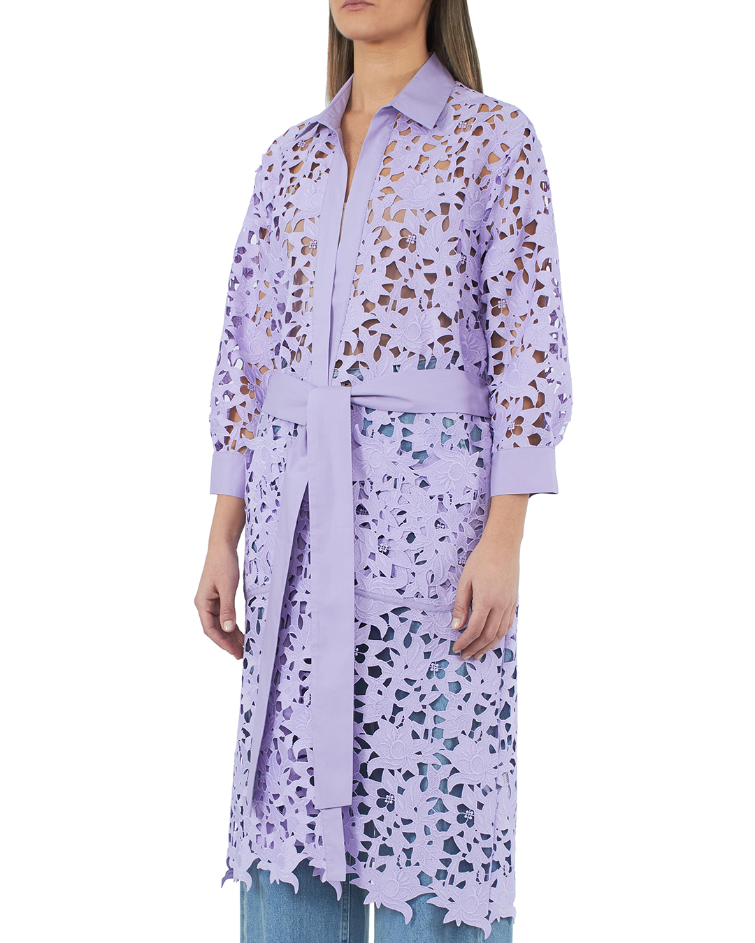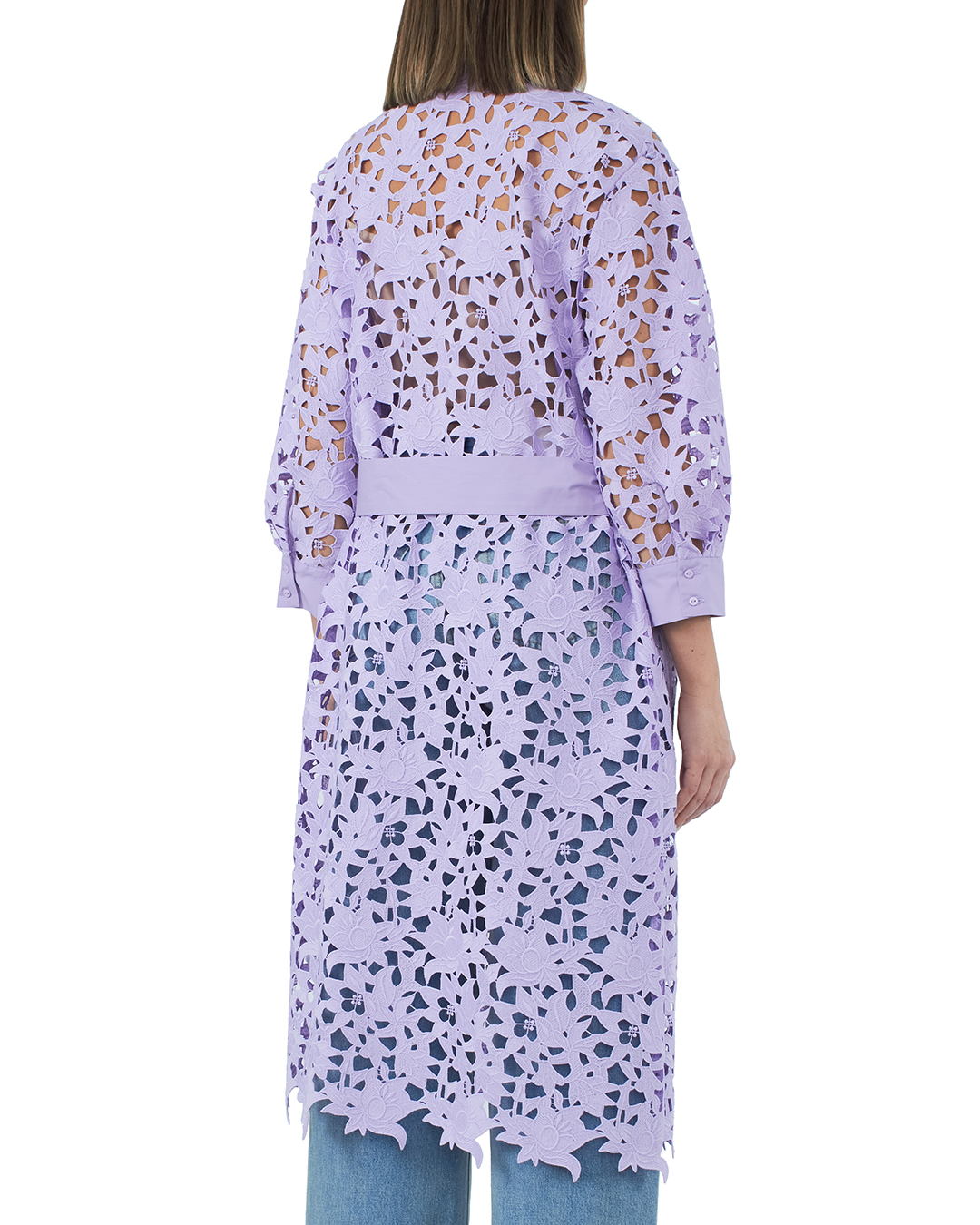 Летнее пальто резной вышивки фиолетового оттенка. Модель прямого силуэта без застежки с поясом.