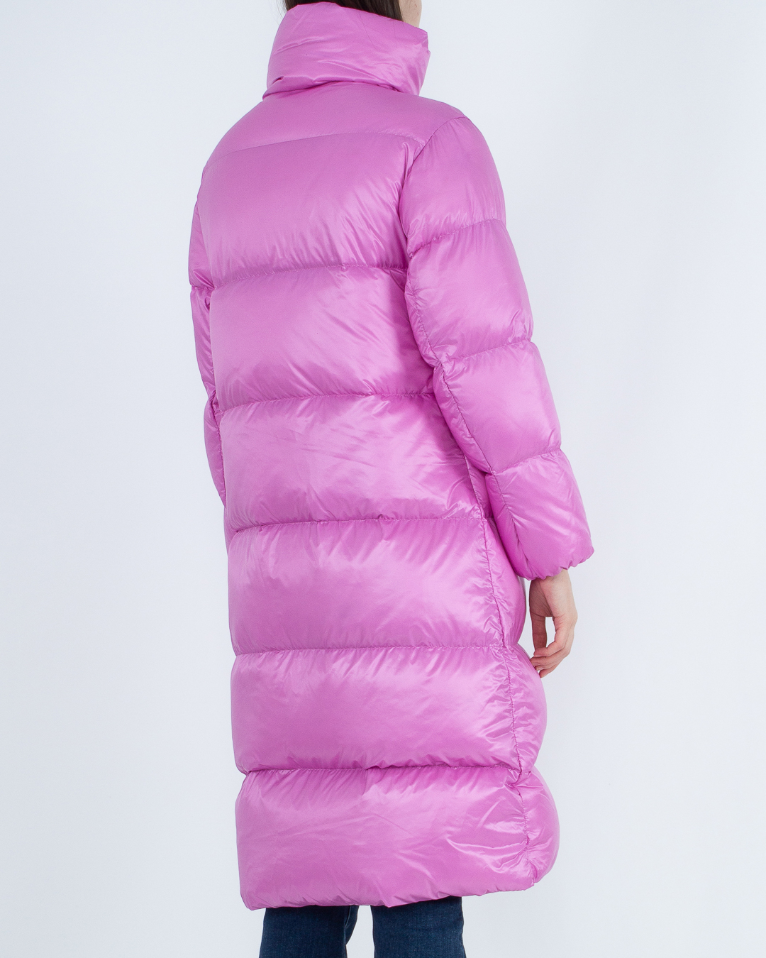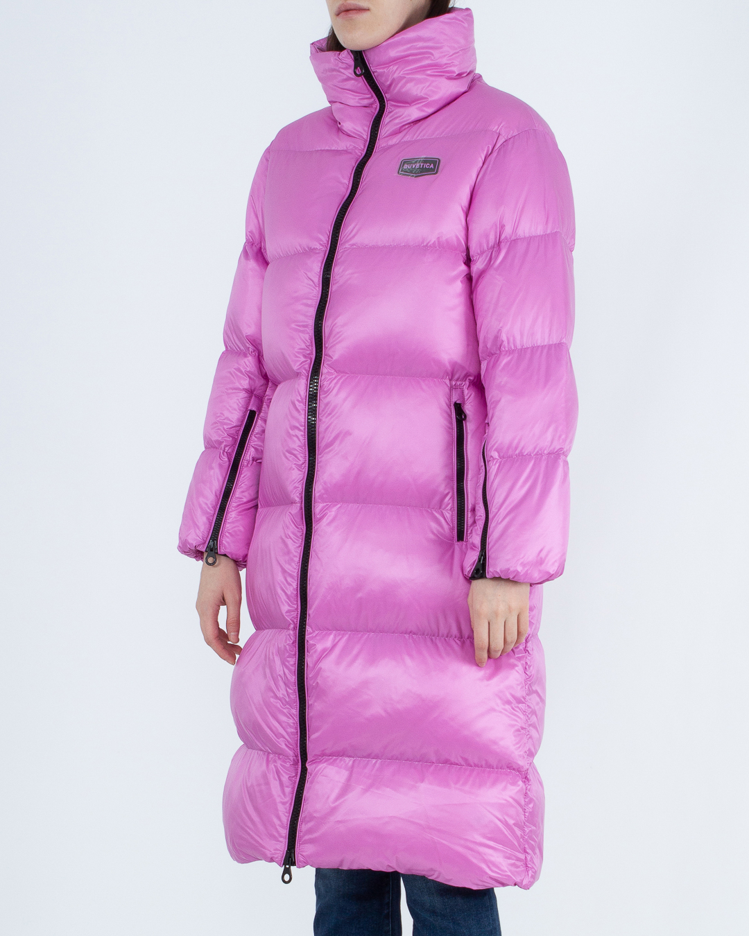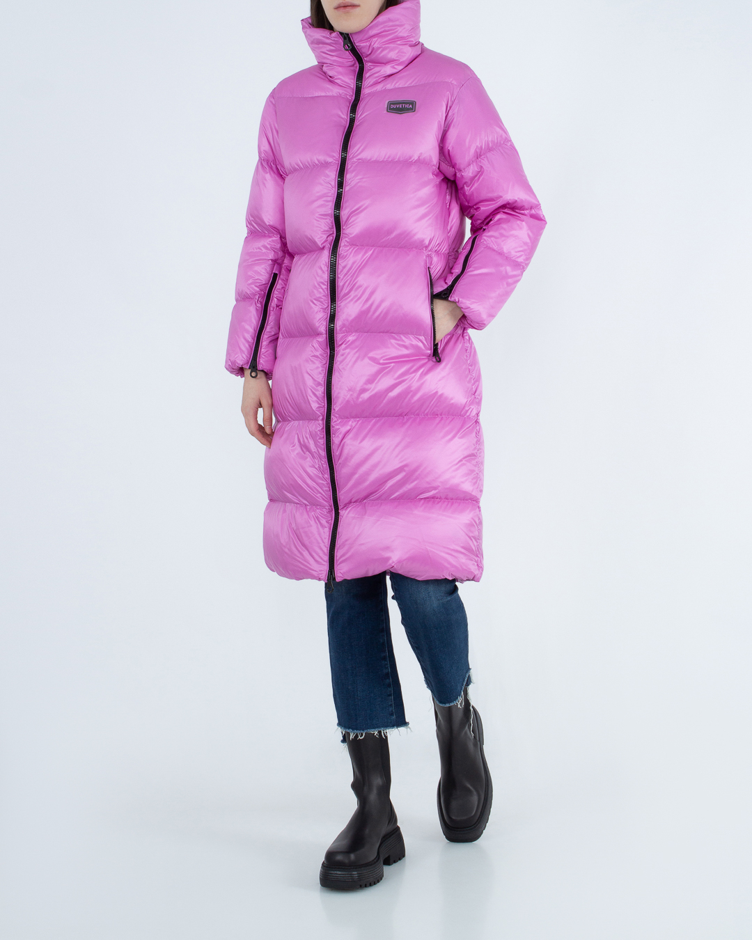 Женский пуховик из прочного влагоотталкивающего нейлона. Модель прямого силуэта длиной до колена с застежкой на молнию и двумя карманами по бокам. Пуховик дополнен объемным воротником-стойкой.