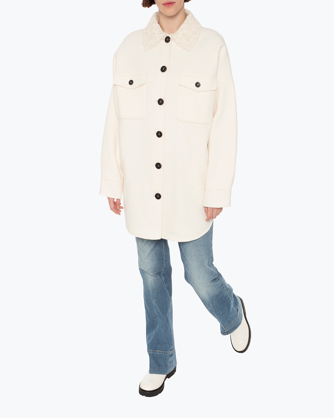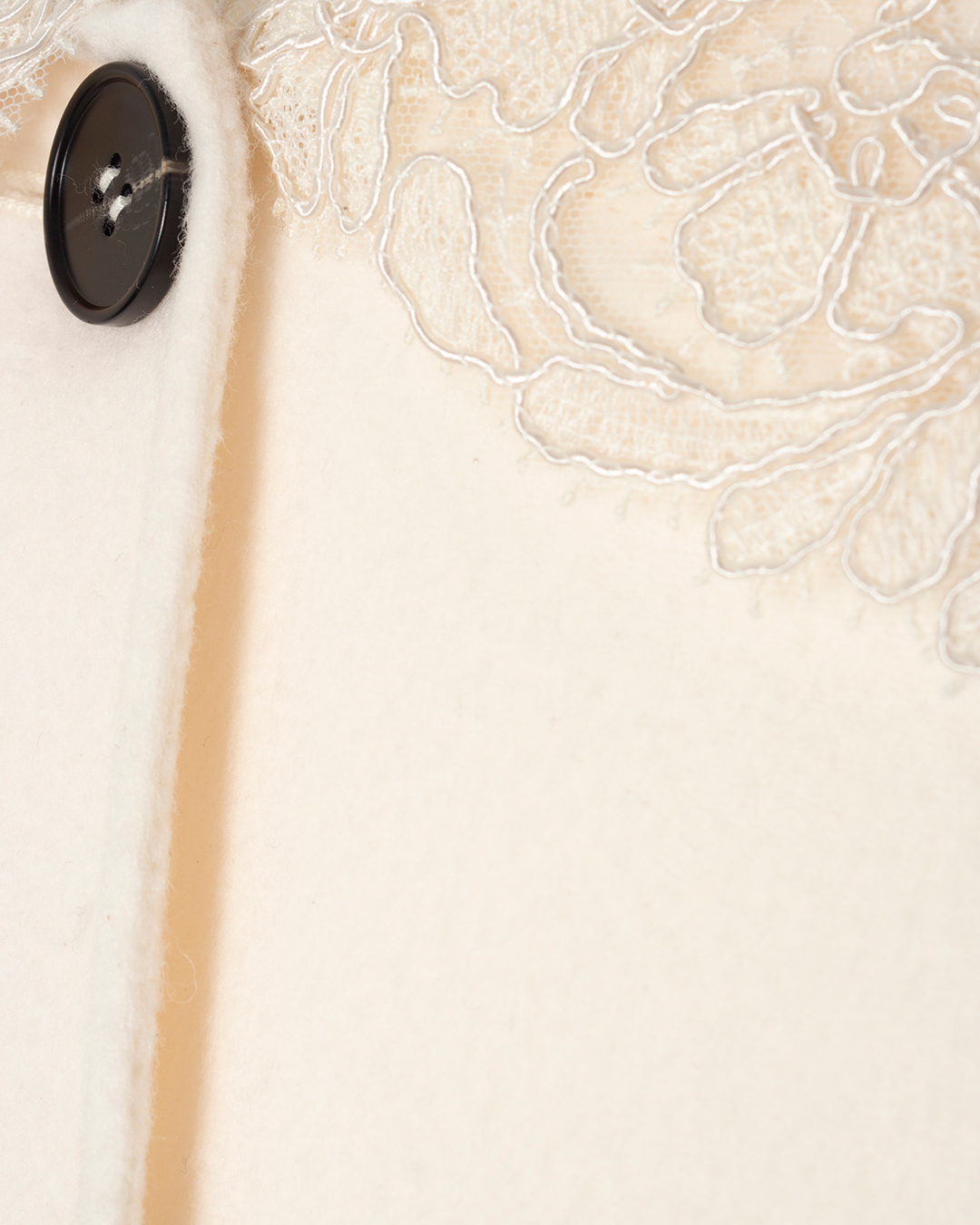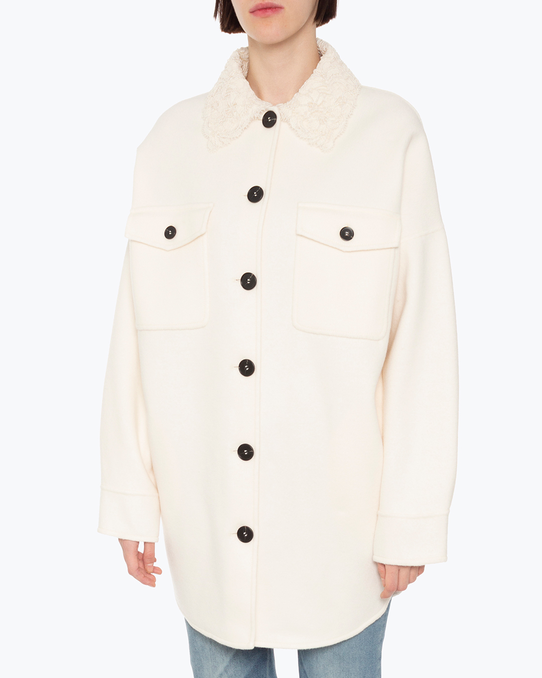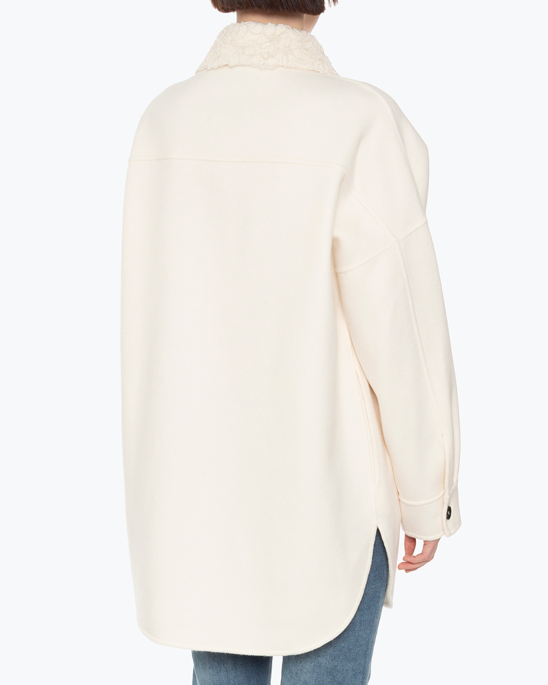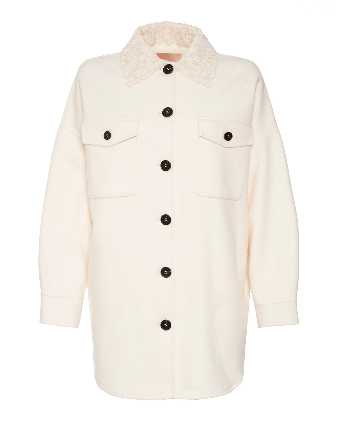 Куртка рубашечного кроя выполнена из мягкой молочной шерсти. Прямой свободный силуэт с застежкой на пуговицы дополнен спущенной линией плеч и широкими рукавами. Отложной воротник дополнен ажурной отделкой. Накладные карманы и закругленная лини низа.