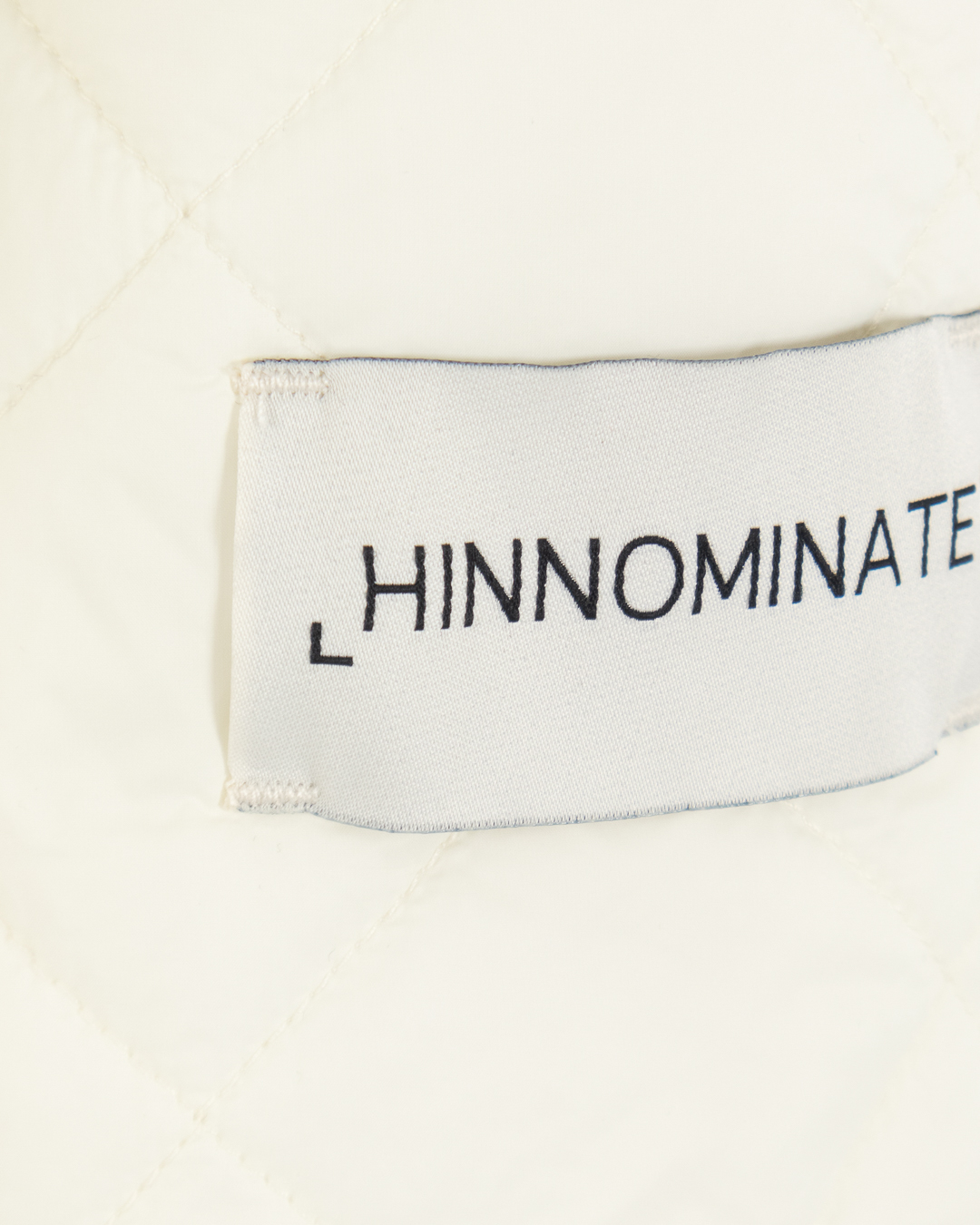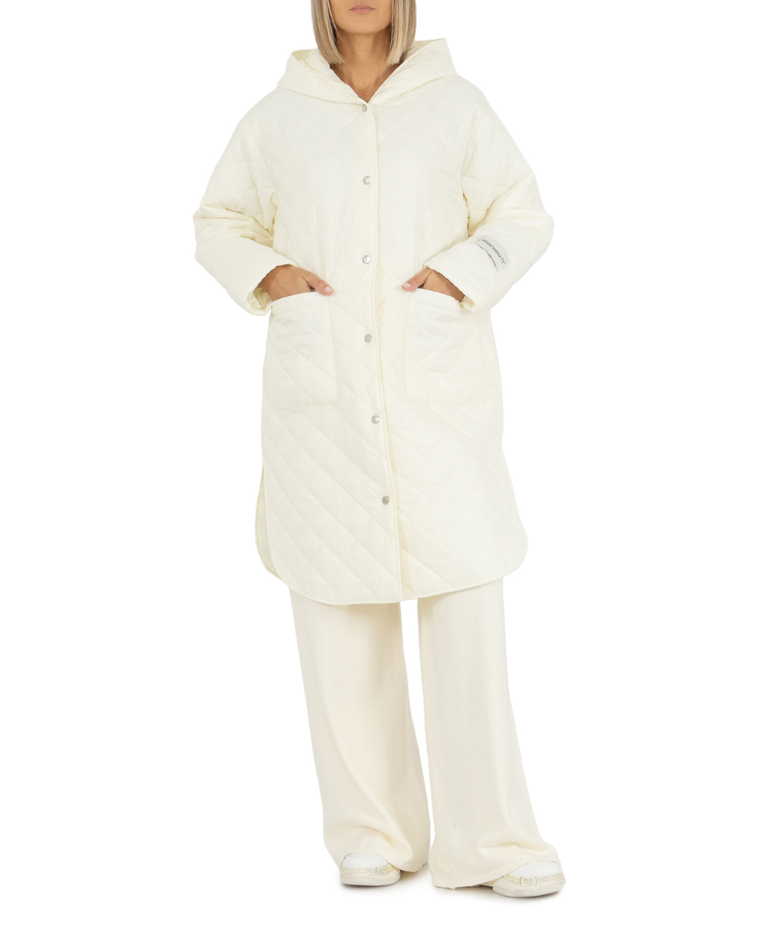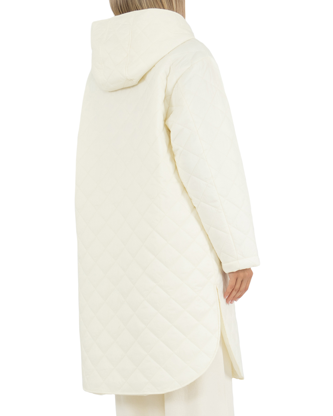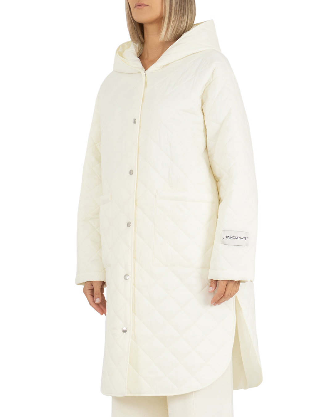 Пальто HINNOMINATE из стеганого нейлона молочного оттенка с застежкой на кнопки. Модель прямого силуэта рубашечного кроя дополнена капюшоном и двумя карманами.