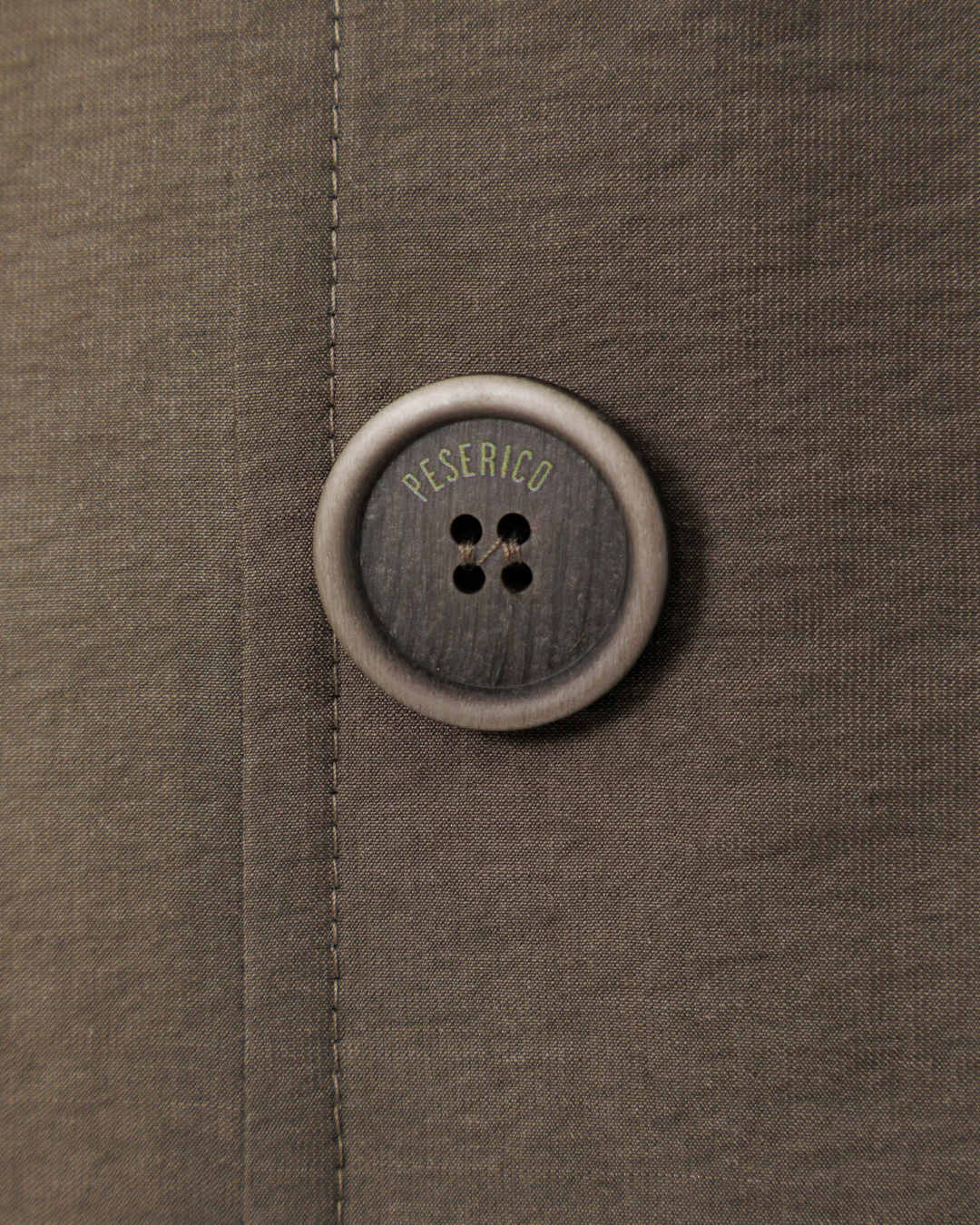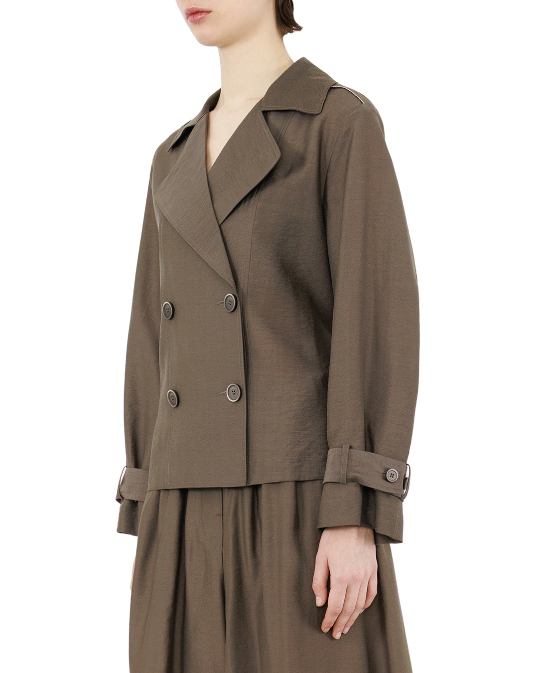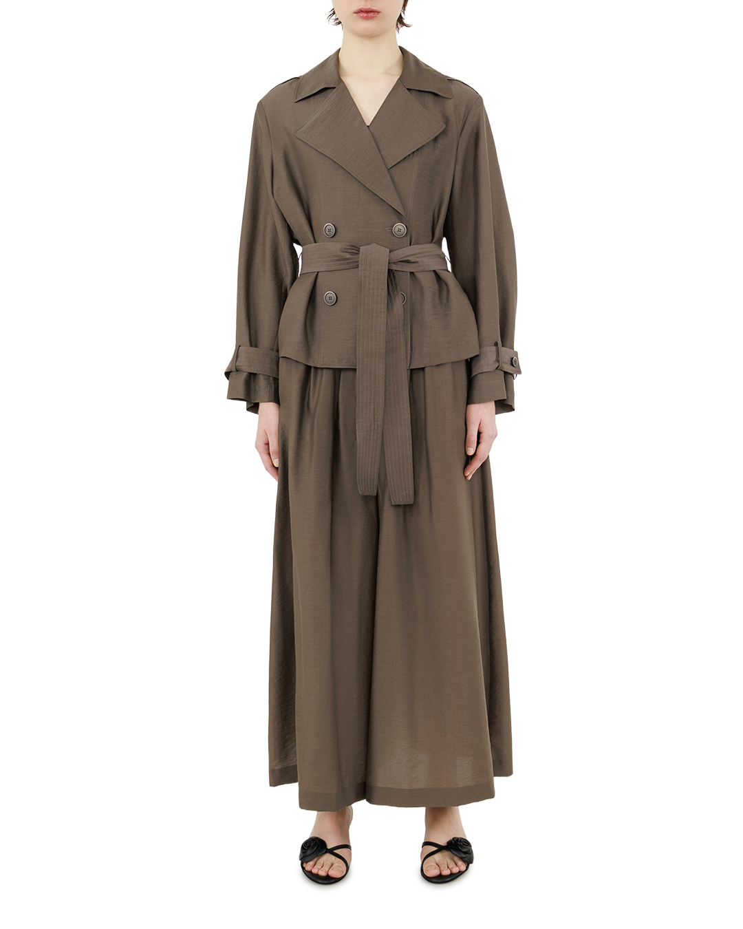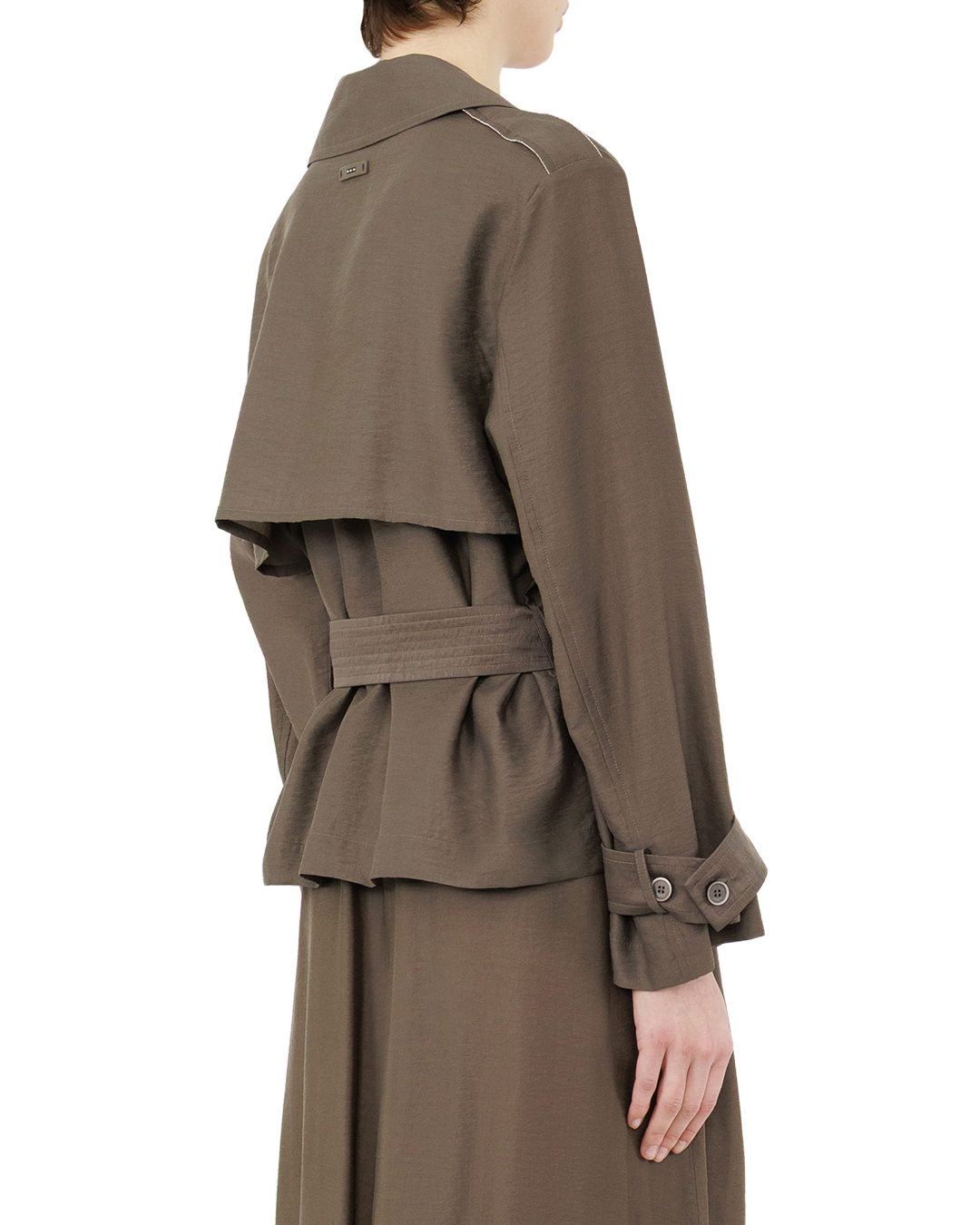 Этот изысканный укороченный плащ — воплощение сдержанной элегантности с отсылкой к классике. Двубортный крой с чётко выверенными линиями создаёт выразительный силуэт, подчёркивая талию и придавая облику благородную собранность. Широкий лацкан с аккуратной отстрочкой структурирует верхнюю часть изделия, визуально вытягивая линию шеи и добавляя модели графичности. Пояс, совпадающий по оттенку с основным полотном, становится ключевым элементом композиции — он изящно подчёркивает талию, придавая силуэту женственность и утончённость. Крупные пуговицы, расположенные симметрично, не только выполняют практическую функцию, но и служат выразительным декоративным акцентом, усиливающим классическую эстетику плаща. Манжеты рукавов оформлены с особым вниманием к деталям: они дополнены регулируемыми хлястиками на пуговицах, что позволяет адаптировать посадку под индивидуальные предпочтения, сохраняя при этом безупречную аккуратность линий. Чёткие рельефные швы подчёркивают форму изделия, делая его более выразительным и структурированным. Сдержанный оливковый оттенок придаёт плащу универсальность — он легко впишется как в деловой гардероб, так и в повседневные образы. Этот плащ способен преобразить любой лук, добавив ему интеллигентной строгости и лёгкой аристократичности, оставаясь при этом практичным и удобным в носке.