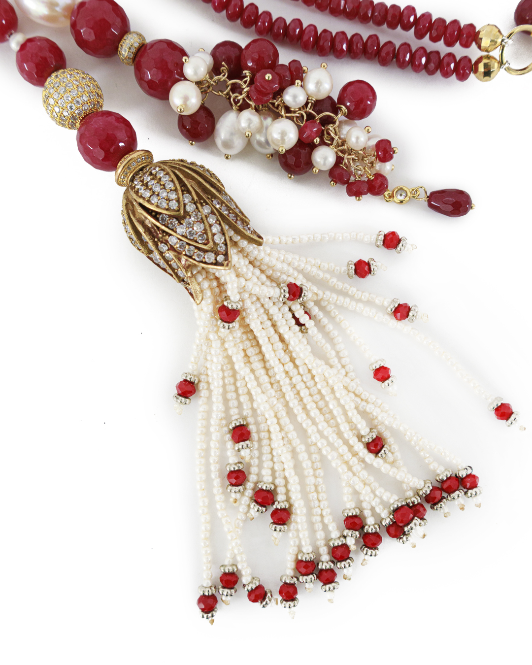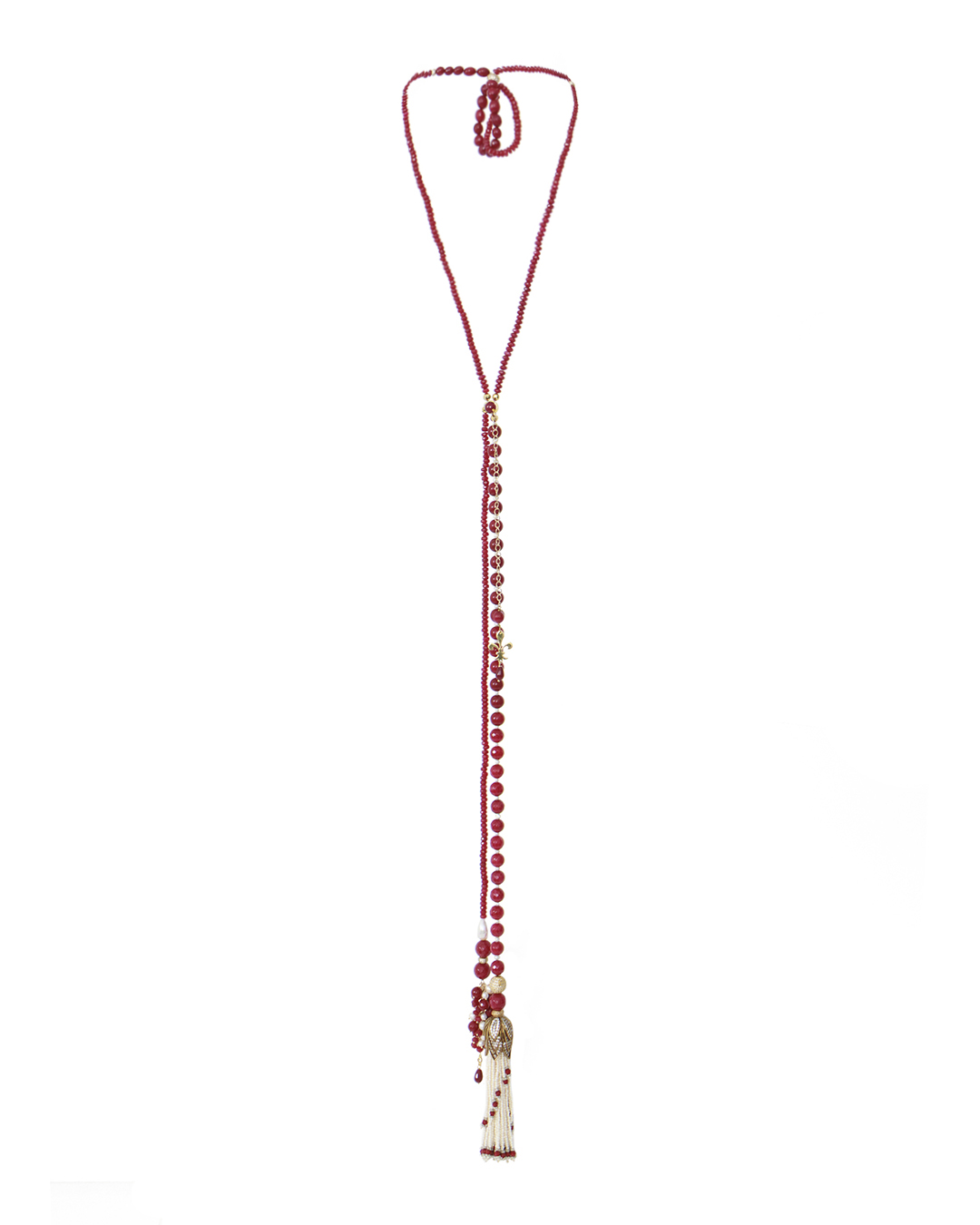 Это ожерелье представляет собой великолепное сочетание утонченной элегантности и этнической роскоши. Длинная цепочка из насыщенно-красных бусин создает изысканный силуэт, который плавно струится вдоль фигуры, придавая образу выразительность и глубину.  Центральный акцент ожерелья — эффектная кисточка, выполненная из мелких бусин и украшенная искусной золотой фурнитурой, которая придает изделию величественный блеск и изящество. Легкое покачивание кисточки добавляет динамику и оживляет каждое движение.  Детали отделки включают элементы ручной работы, такие как миниатюрные золотистые вставки, которые добавляют текстурность и акцентируют внимание на богатстве композиции. Переплетение различных размеров и фактур создает визуальный интерес и глубину, делая это украшение истинным шедевром.  Это ожерелье станет роскошным дополнением к вечернему наряду или эффектным акцентом в вашем повседневном стиле, подчеркивая вашу индивидуальность и утонченный вкус.
