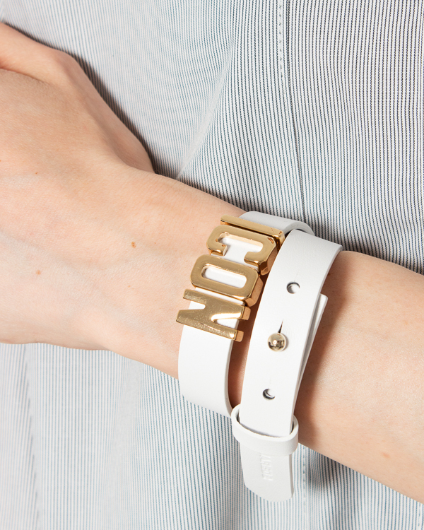 Браслет из натуральной кожи в несколько оборотов. Удобная застежка и металлический декор в виде букв логотипа бренда.