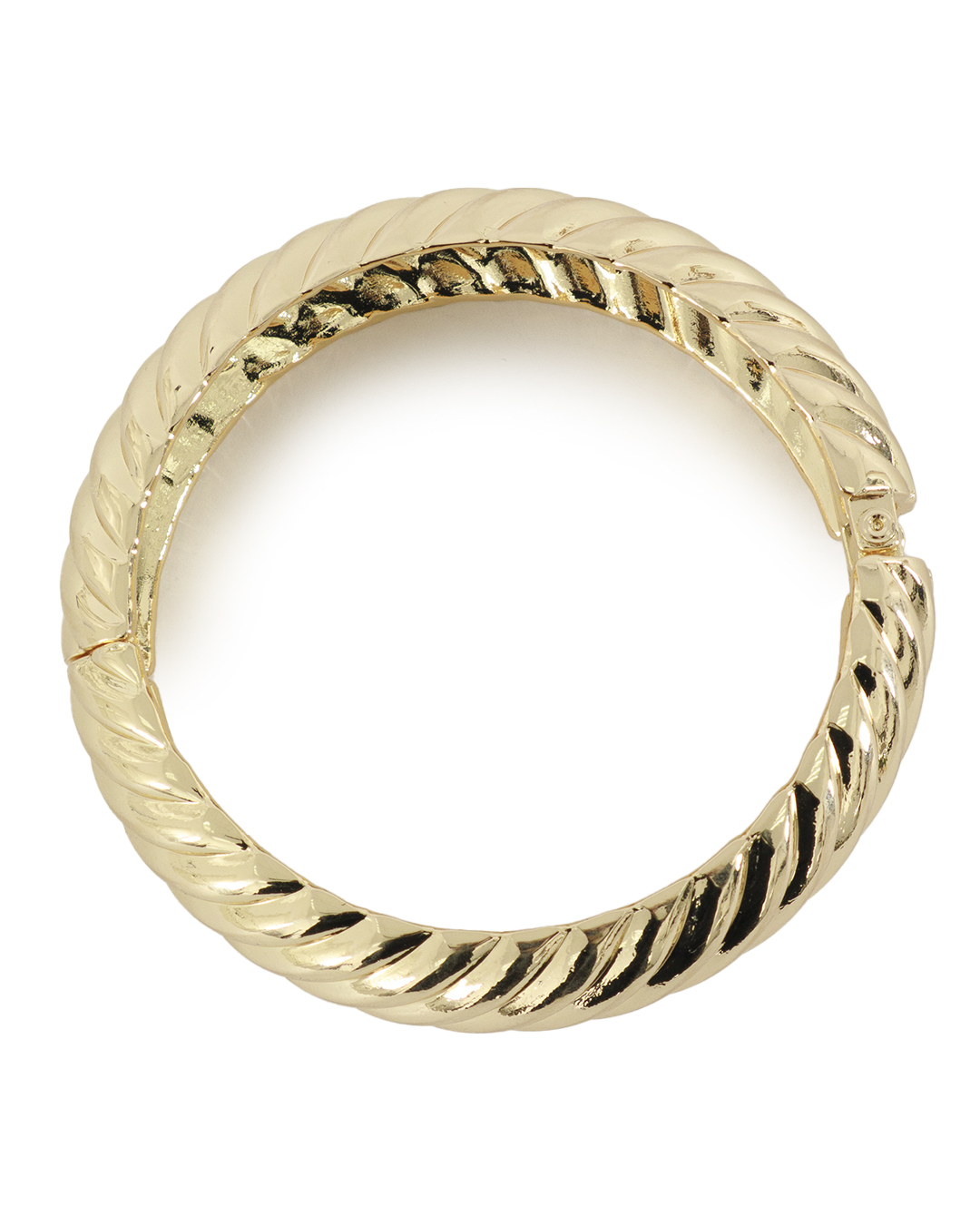Этот браслет — настоящая ода классической элегантности, выполненной в теплых золотых тонах. Его формальная архитектура заключена в изысканный спиралевидный дизайн, который придает изделию динамизм и объем.   Безупречная полировка золотой поверхности обеспечивает отражение света, создавая эффект мягкого и завораживающего свечения. Элегантные рельефные линии добавляют тактильную сложность и подчеркивают тонкость исполнения, делая браслет не только визуально привлекательным, но и приятным на ощупь.  Этот изделие станет идеальным дополнением как к вечернему наряду, так и к повседневному образу, добавляя в него нотки благородства и изысканного стиля. Браслет гармонирует с другими золотыми аксессуарами, создавая целостный образ современной классики.