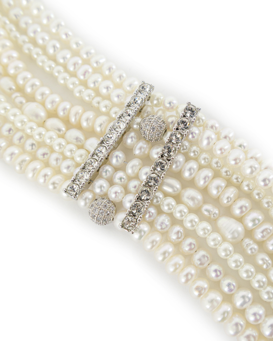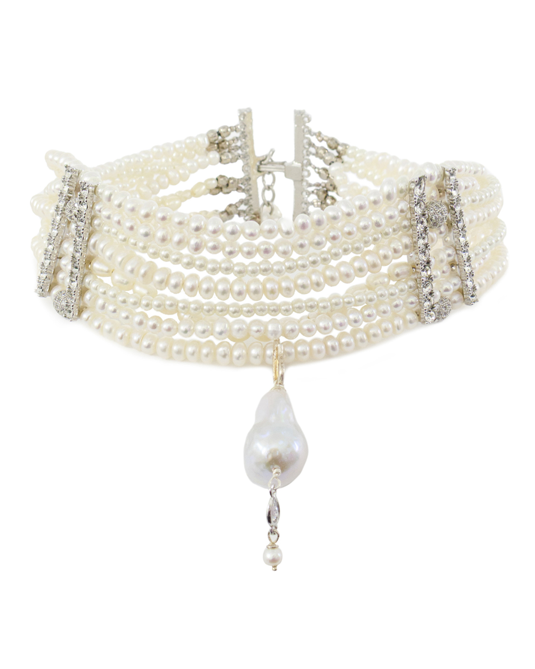 Этот чокер — великолепие роскоши и изысканности, воплощенное в классическом дизайне. Украшенный многочисленными нитями жемчуга, он создает образ, который буквально дышит благородством и элегантностью. Основу чокера составляют несколько рядов мелких, идеально подобранных жемчужин, которые оборачивают шею плавными, гармоничными слоями. Их естественный блеск и мягкость подчёркивают изысканное очарование аксессуара. Элегантные вставки, усыпанные сверкающими кристаллами, создают визуальный ритм и добавляют текстурную глубину дизайну. Эти акценты придают сооружению современную нотку, сохраняя при этом ощущение винтажной классики. Главным акцентом чокера является крупная барочная жемчужина, изящно подвешенная в центре. Её уникальная форма придаёт изделию индивидуальность, а дополнительный миниатюрный жемчуг и кристаллы подчёркивают её утонченное великолепие. Этот чокер идеально дополнит как вечерний наряд, так и изысканный повседневный образ, добавляя великолепие и элегантность вашему стилю.
