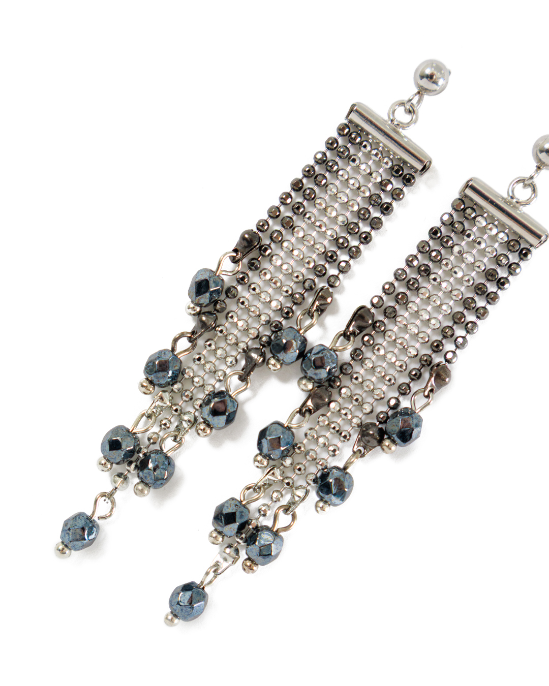 Эти серьги представляют собой изысканное сочетание утончённой элегантности и современного дизайна. Они выполнены в виде многослойных каскадов тонких металлических цепочек, плавно спускающихся вниз, создавая чарующий эффект движения и света. Центральный элемент составляет изысканный паве из переливающихся гранёных бусин глубокого тёмного оттенка. Эти бусины добавляют серьгам роскошный блеск и подчёркивают их утончённую эстетику, создавая интригующий контраст с блеском металла. Каждая цепочка заканчивается одной бусиной, делая общую композицию завершенной и гармоничной. Застёжка в виде аккуратной завинчивающейся жемчужинки придаёт дополнительный штрих изысканности и обеспечивает надежную фиксацию. Эти серьги станут великолепным дополнением как для вечернего выхода, так и для создания акцентного образа в повседневной жизни, привнося в него немного гламура и шарма.