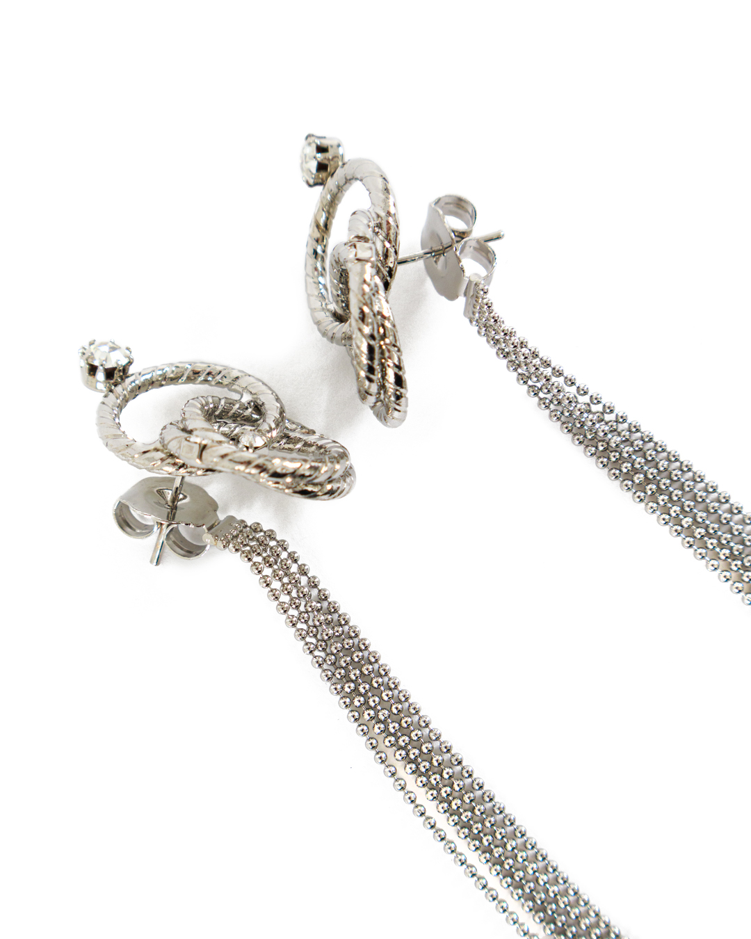 Эти серьги — воплощение утончённого гламура и современного дизайна. Их верхняя часть выполнена в виде элегантно переплетённых металлических колец, создающих роскошную многослойную текстуру. Каждое кольцо украшено тонким гравировочным узором, что добавляет изящества и глубины. Сияющий камень на застёжке придаёт серьгам блеск и освежает композицию, создавая акцент на верхней части изделия. Это изысканная деталь, которая мягко привлекает внимание и добавляет нотку аристократического шика. Длинные ниспадающие цепочки придают серьгам эффектную лёгкость и динамичность. Тонкие, блестящие звенья образуют каскад, который изящно движется и мерцает при каждом шаге, создавая харизматичный и женственный образ. Эти серьги идеальны для создания вечернего лука, привнося изысканный акцент в любой образ, и подчёркивая ваш вкус и уверенность в выборе аксессуаров.