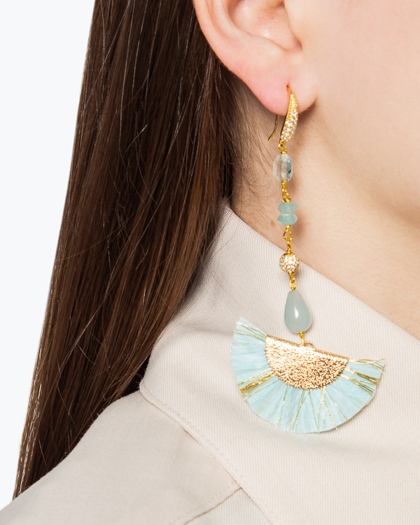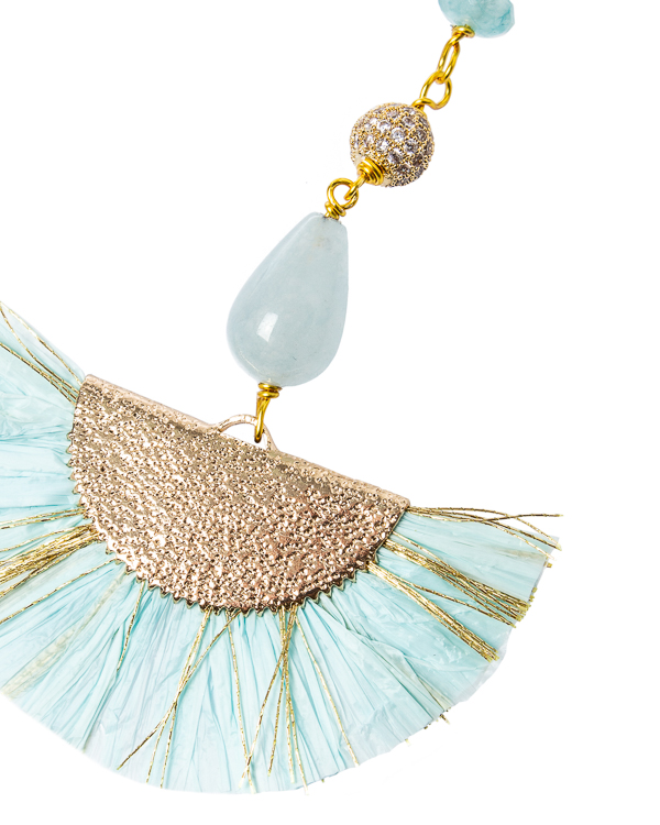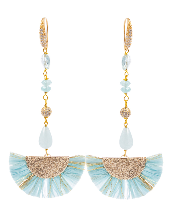 Серьги из бижутерного сплава с гальваническим покрытием. Украшение дополнено отделкой камнями аквамарина и шелковыми кисточками.