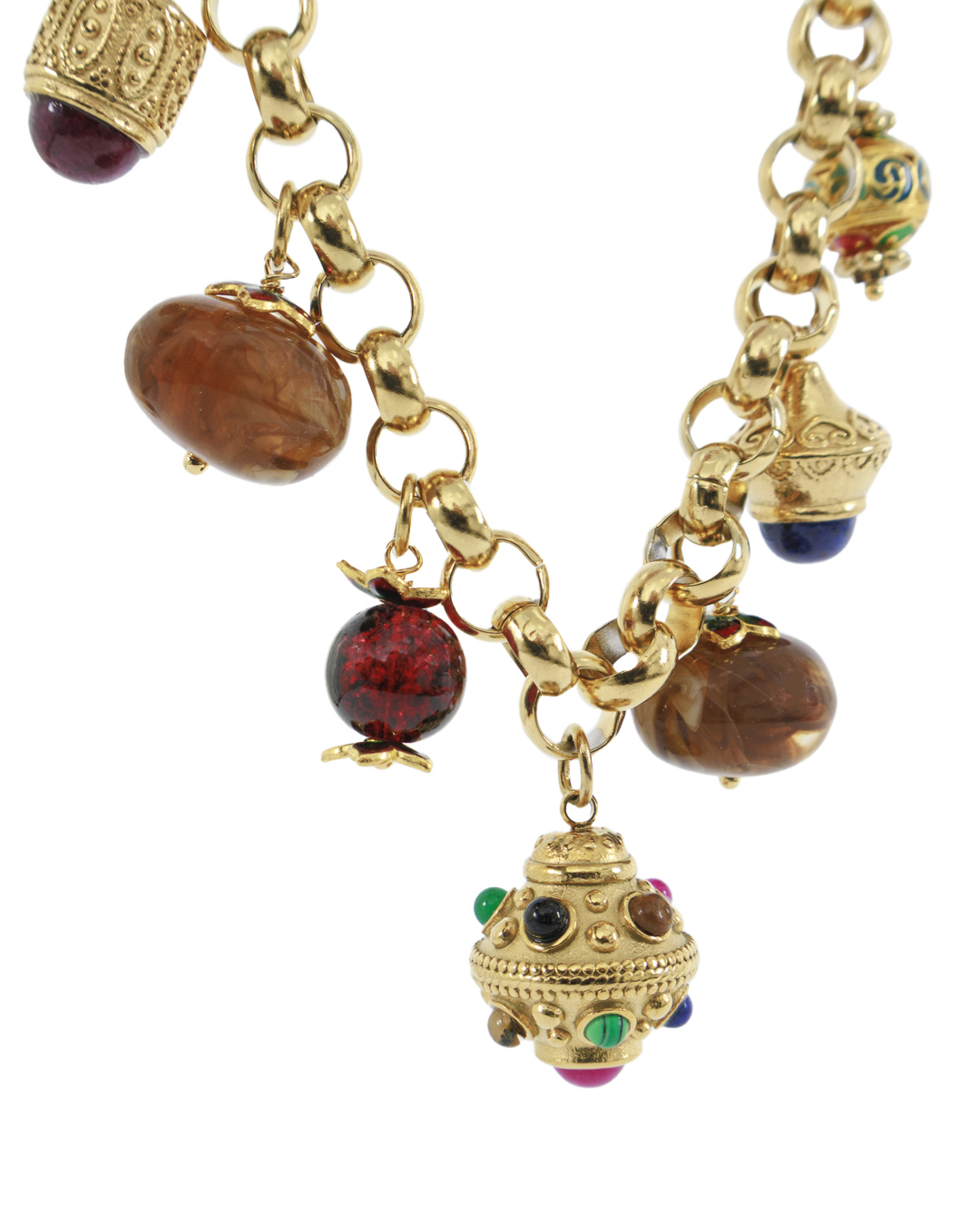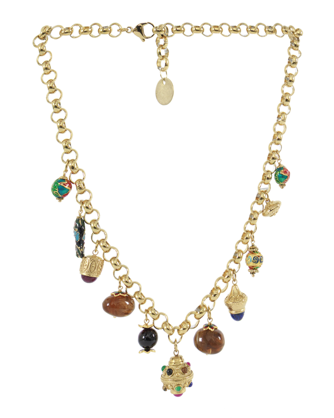 Это ожерелье — настоящая находка для ценителей эклектичного стиля и этнической эстетики. Основу украшения составляет массивная золотая цепь, каждое звено которой выполнено с утонченным блеском, придающим изделию основательность и роскошь. Центральное внимание привлекают разнообразные подвески: они создают эклектичный ансамбль за счет использования разноцветных и крупногабаритных бусин. Каждая подвеска обладает уникальным дизайном, в том числе элементы в виде сфер, украшенные разноплановыми узорами и цветочными эмалями. Подвески, изготовленные из различных материалов, таких как металл с золотым напылением и натуральные камни насыщенных оттенков, привносят в образ динамичность и насыщенность цветовой палитры. Особенные акценты с чеканкой и эмалями добавляют изделиям восточные мотивы. Это ожерелье станет ярким акцентом в любом наряде, подчеркивая индивидуальность и креативность его обладателя. Оно подходит как для повседневного стиля, так и для создания необычного вечернего образа, сочетая в себе элементы традиционности и современности.
