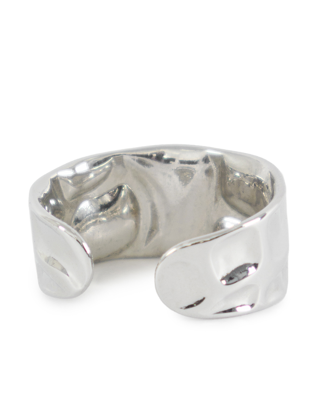 Это кольцо — воплощение современного минимализма и утончённой элегантности. Изготовленное из сияющего серебристого металла, оно отражает свет, создавая впечатление благородного блеска. Широкая полоса кольца добавляет ему скульптурную выразительность и харизматичность. Дизайн кольца отличается плавными изгибами и неровностями, которые привносят в него динамику и уникальность. Эти текстурные детали напоминают о природных формах, что делает изделие одновременно простым и искусным. Внутренняя часть кольца тщательно отполирована, обеспечивая комфортное прилегание и удобство в ношении. Благодаря открытому дизайну, кольцо можно гибко регулировать под любую форму пальца, что подчёркивает его универсальность. Эта стильная деталь станет акцентом для любого образа, добавляя ему черты индивидуальности и изысканного стиля. Оно идеально подойдёт для тех, кто ценит в аксессуарах простоту и современный шик.