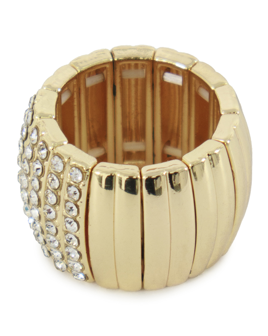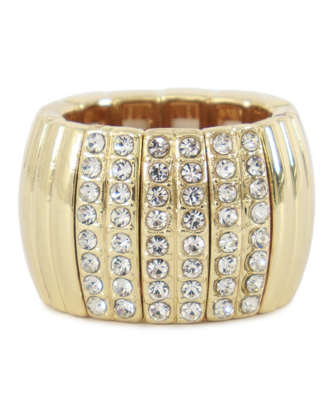Это кольцо — истинный символ элегантной роскоши и блеска, созданное для тех, кто ценит исключительное мастерство и утонченность в деталях. Его массивная форма придает аксессуару уверенность и значимость, а золотистый оттенок основы излучает теплое сияние. Передняя панель кольца украшена изысканными рядами кристаллов, уложенных в технике pave. Эти сверкающие камни тщательно выровнены и закреплены, чтобы создать ослепительный эффект, привлекающий внимание и подчёркивающий безупречный вкус владельца. Гармония между гладкими полированными поверхностями и текстурированными деталями, инкрустированными кристаллами, создаёт уникальную игру света и тени. Это кольцо станет идеальным дополнением как к вечерним нарядам, так и к утонченным дневным образам, подчеркивая индивидуальность и шик стиля.