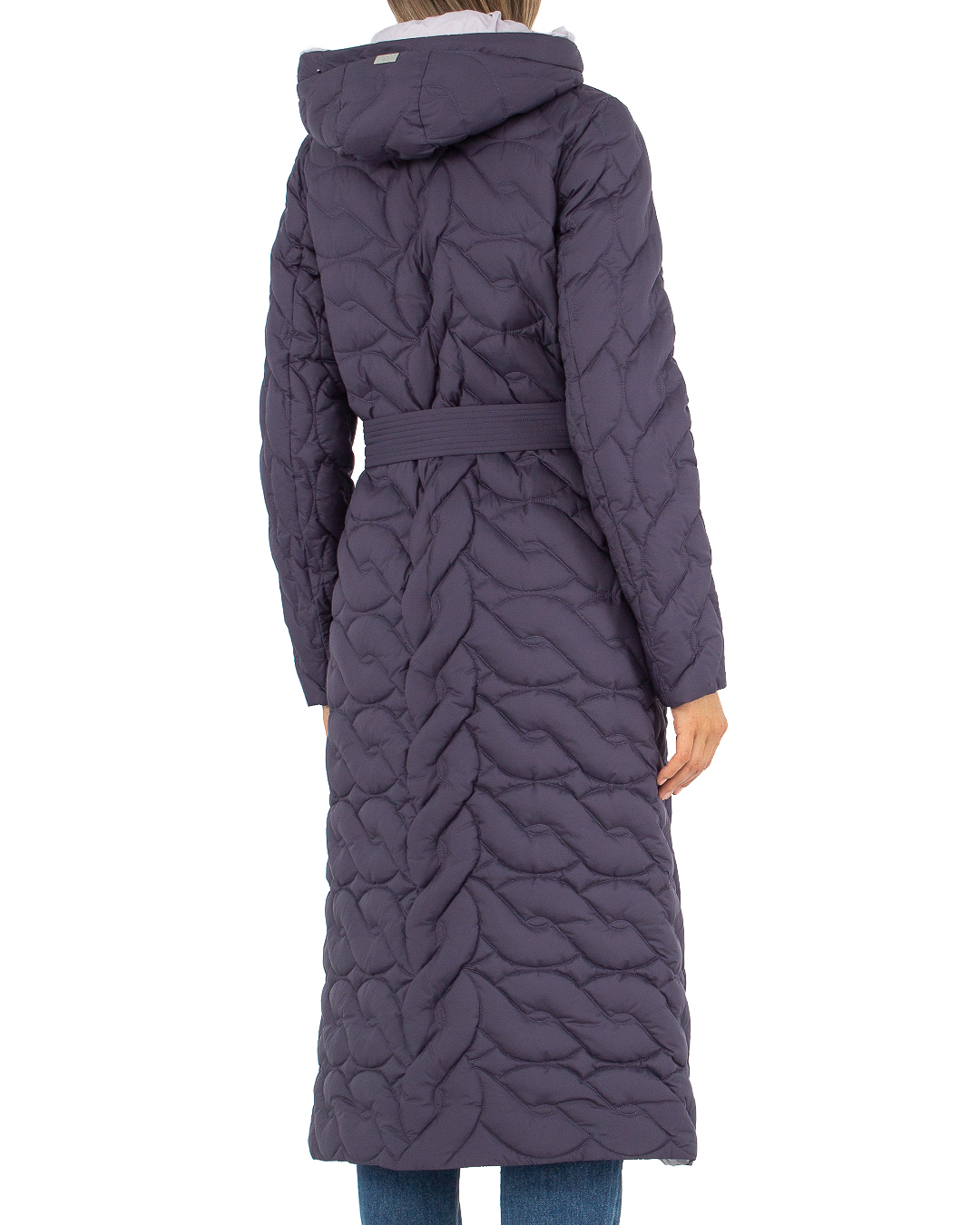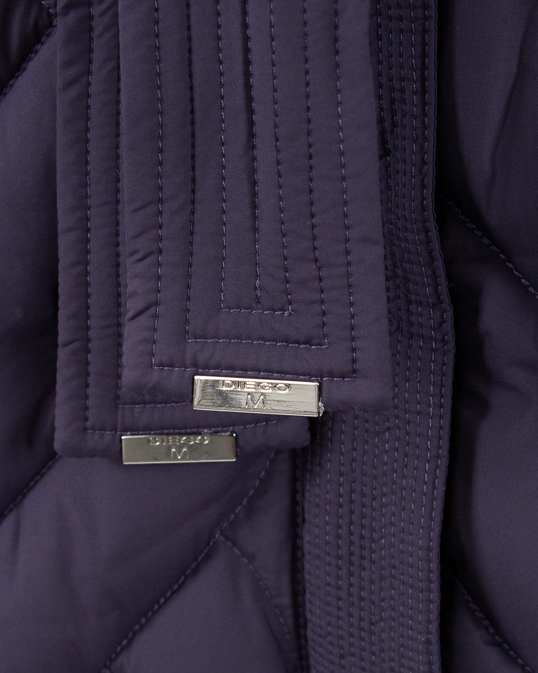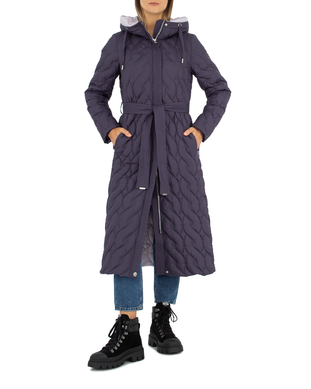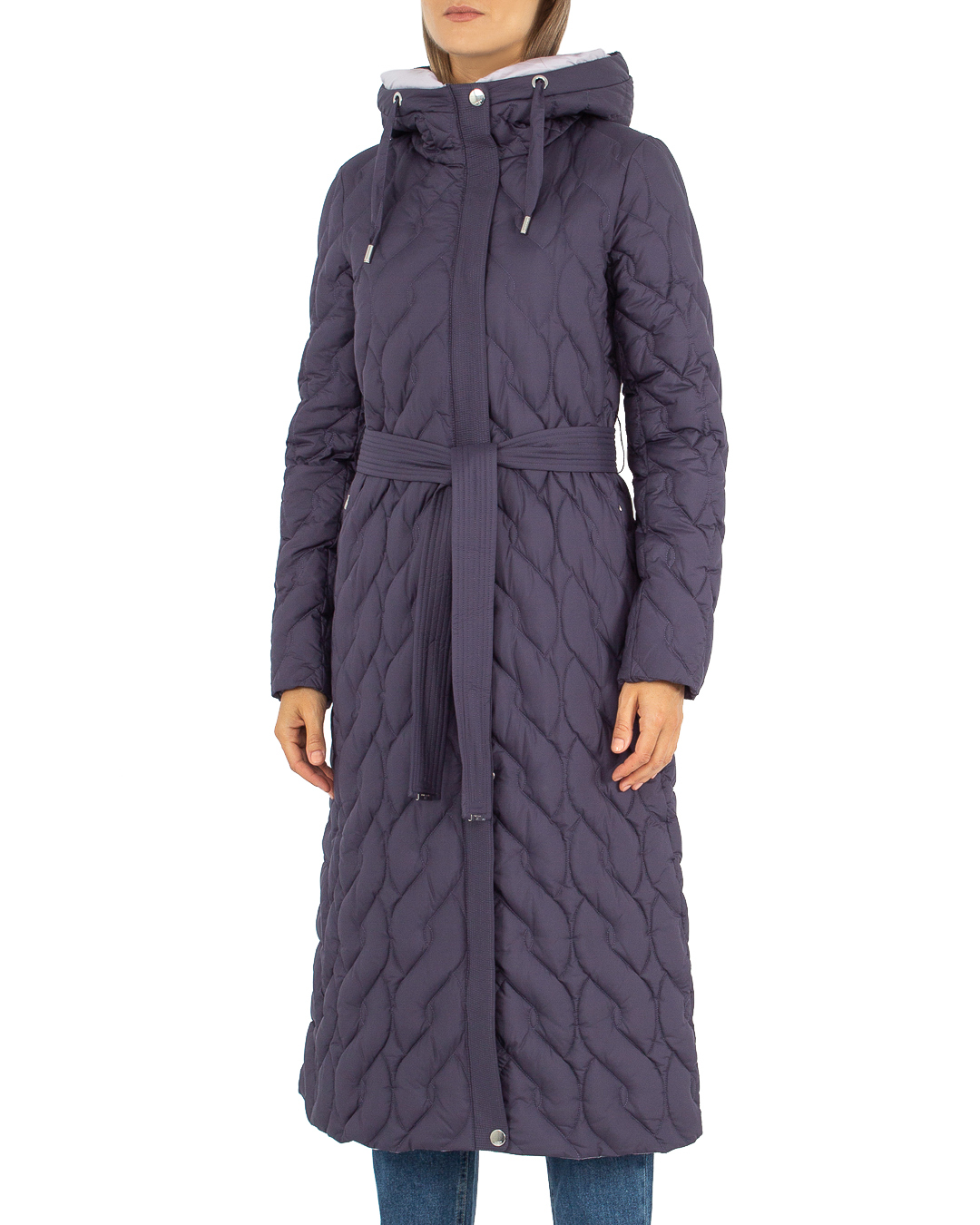 Стеганое пальто-пуховик DIEGO M сшито из прочного нейлона. Изделие утеплено ультралегким пухом и пером. Модель прямого силуэта с застежкой на молнию и планку дополнено капюшоном и поясом.