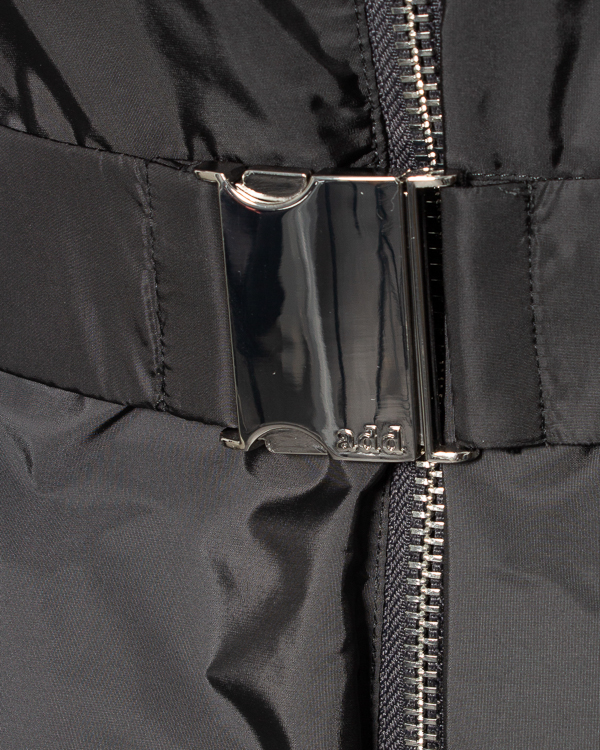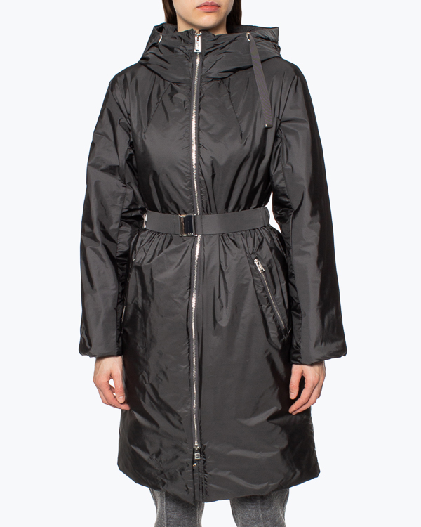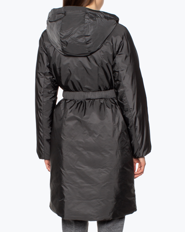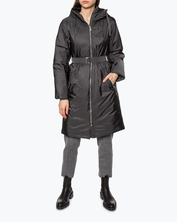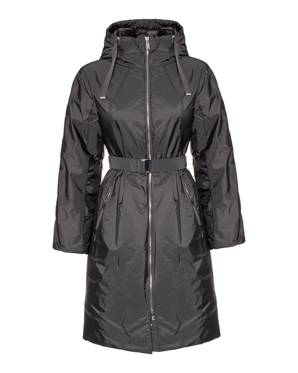 Пальто-пуховик из прочного нейлона. Приталенное изделие с застежкой на молнию дополнено эластичным поясом с застежкой на металлическую пряжку. Объемный капюшон с завязками и два кармана по бокам.