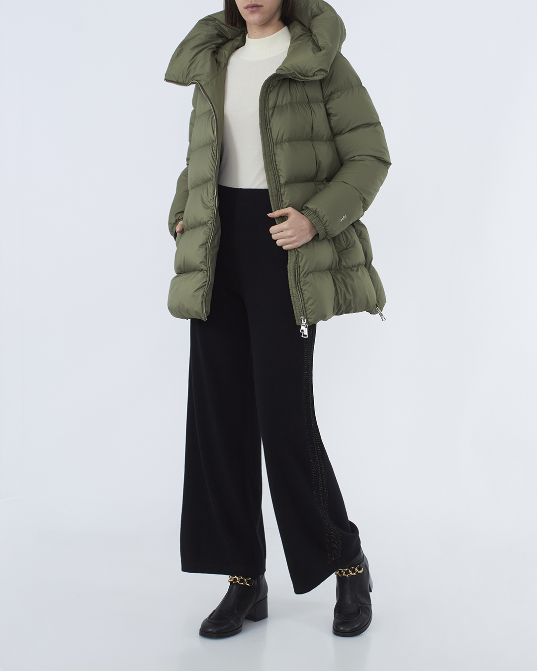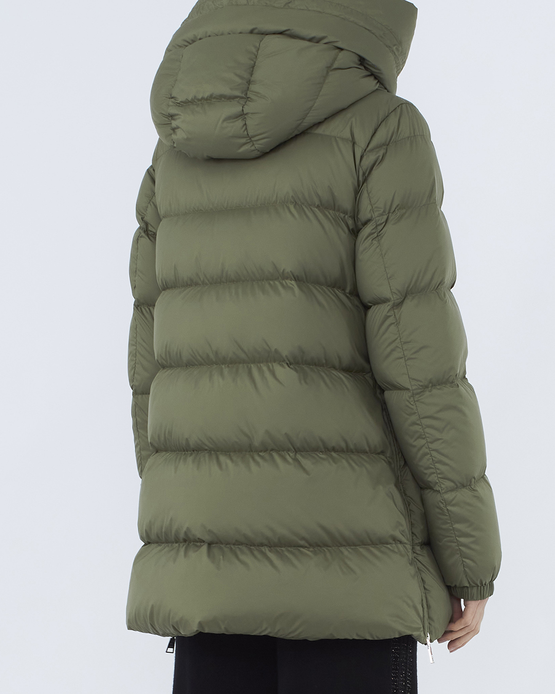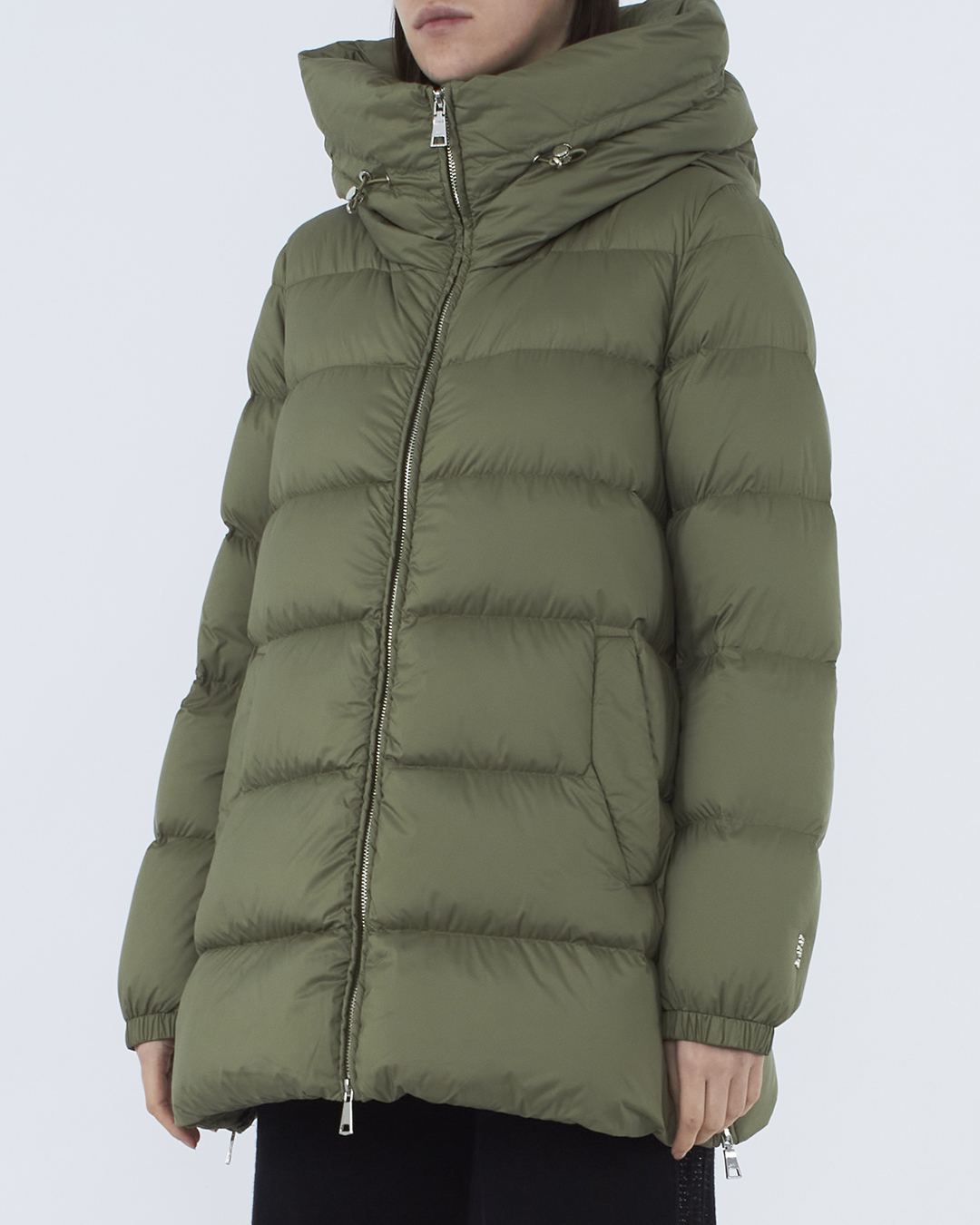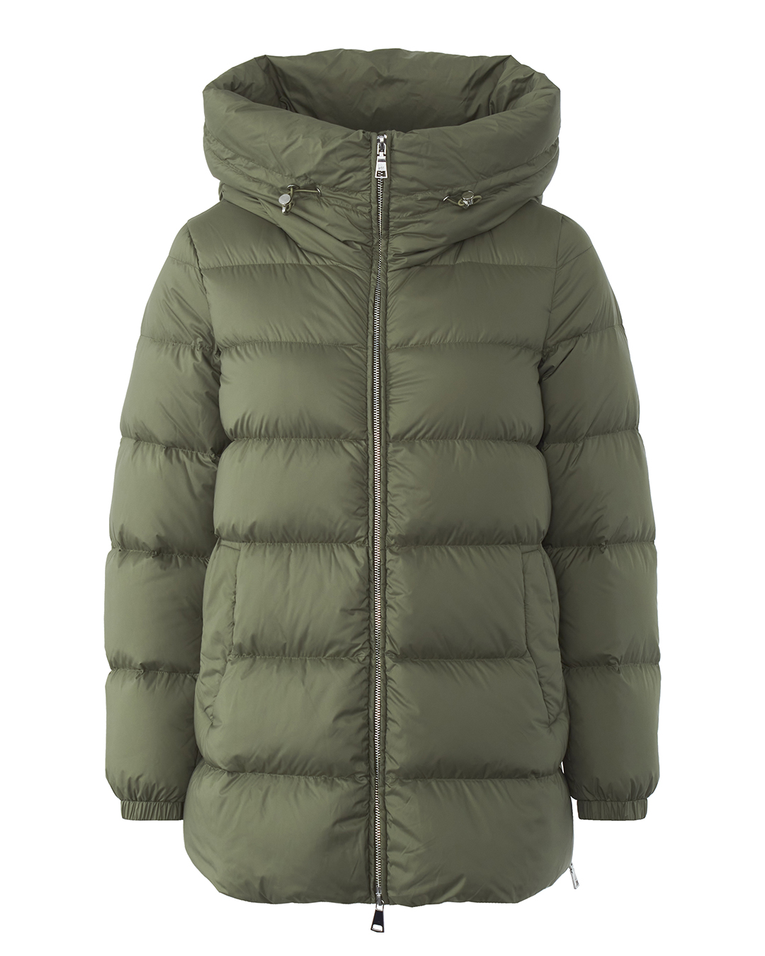 Пуховик из прочного матового нейлона, утепленный пухом и пером. Модель прямого объемного силуэта с застежкой на молнию и планку с кнопками дополнена капюшоном с и двумя карманами по бокам.