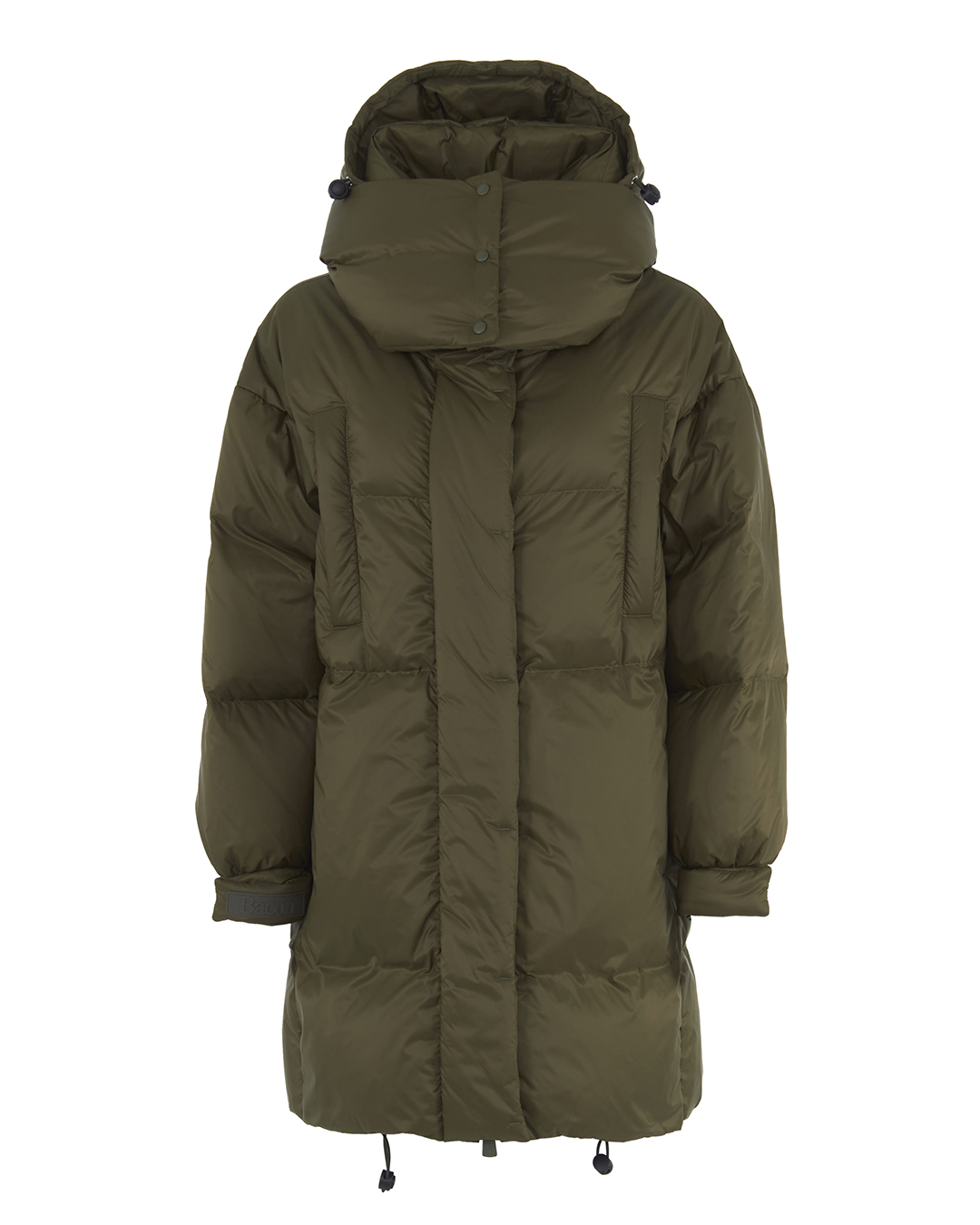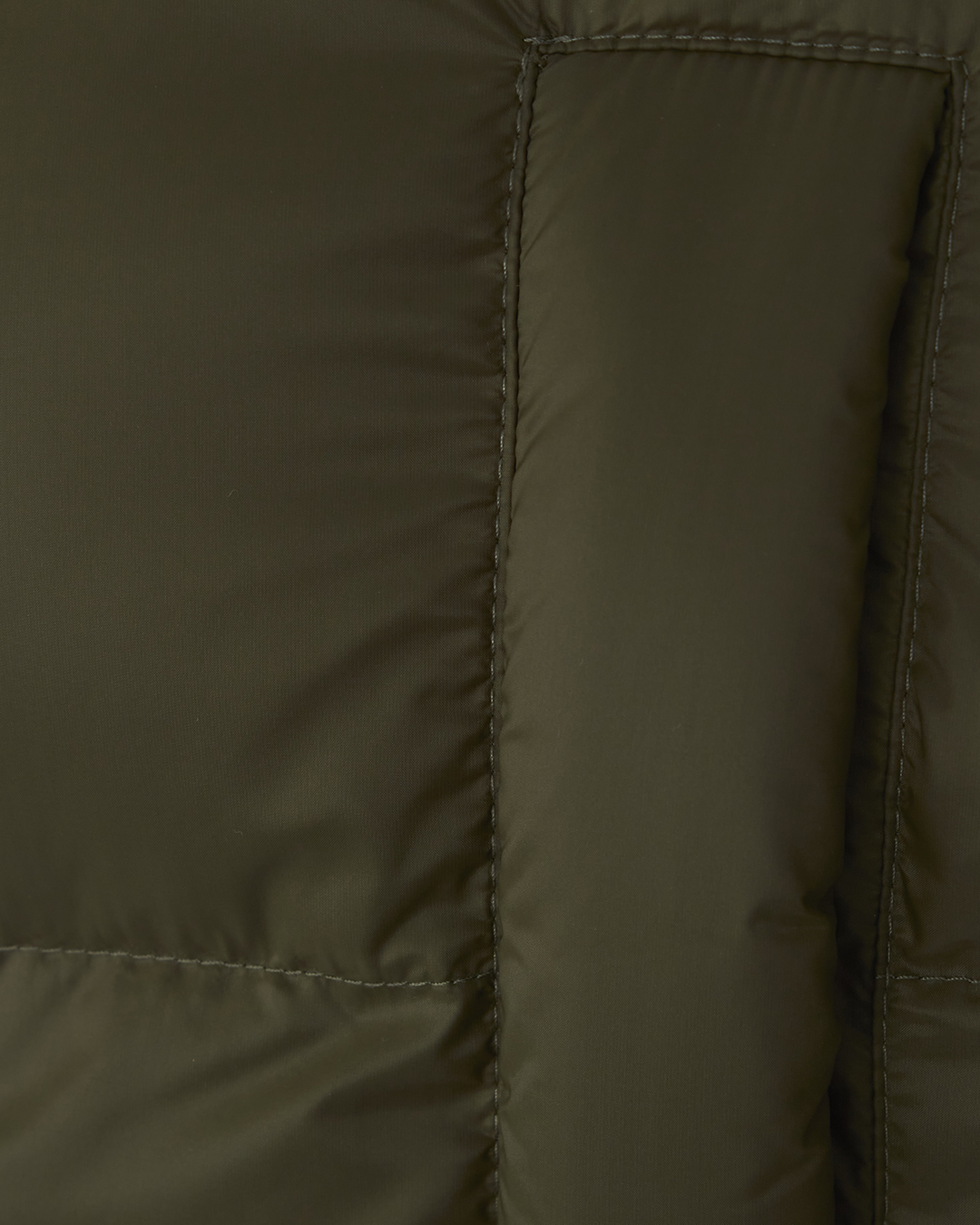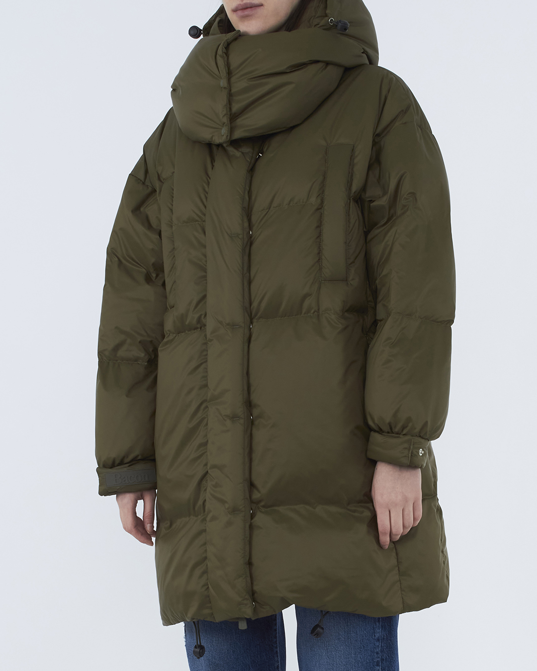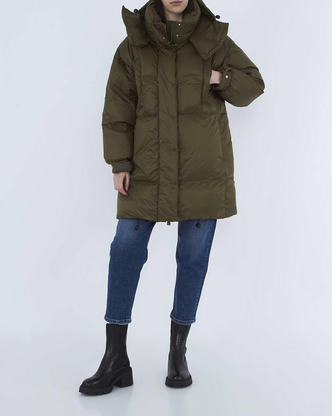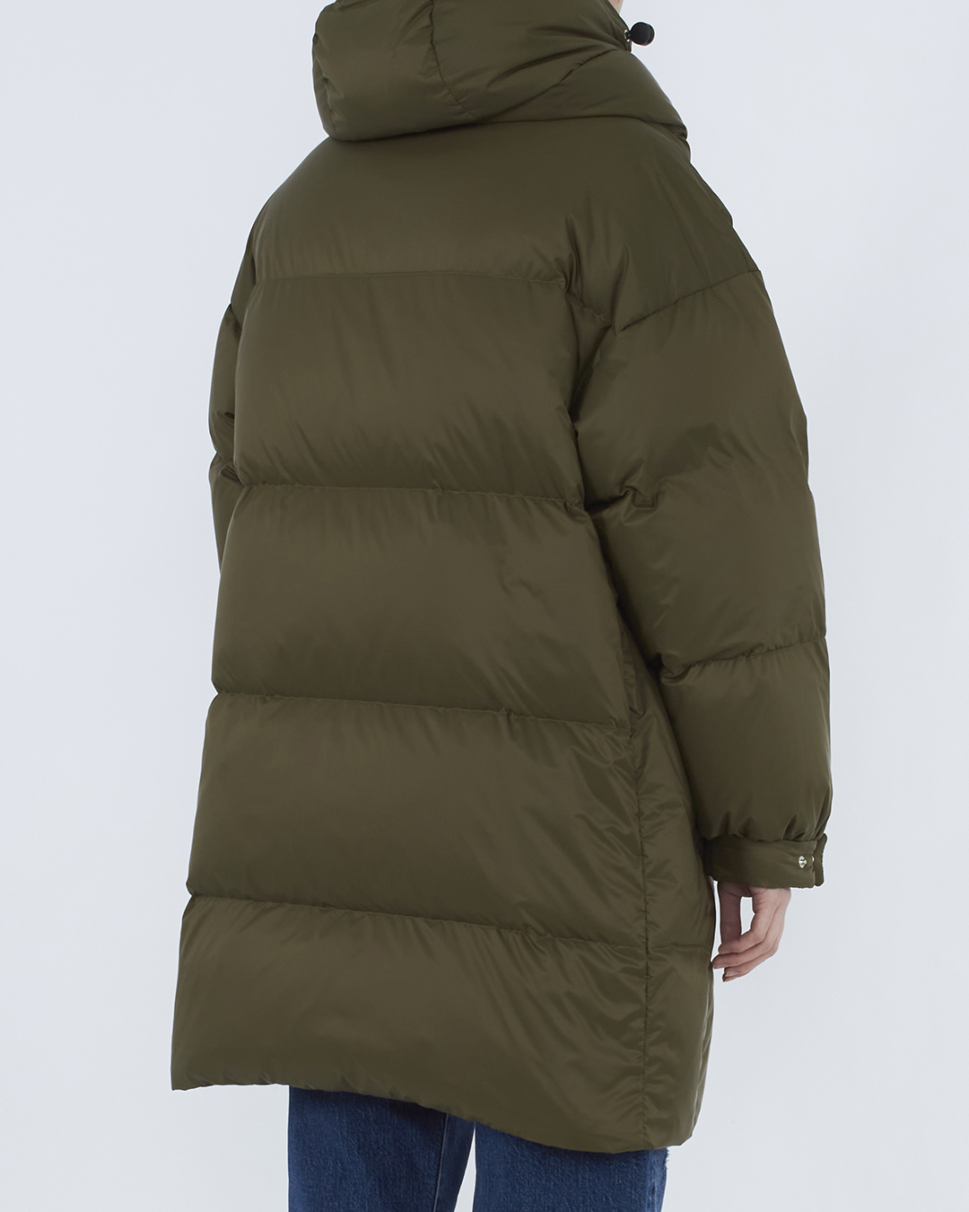 Дутый пуховик из матового нейлона черного цвета. Стеганое изделие свободного силуэта с застежкой на молнию, двумя карманами и капюшоном.