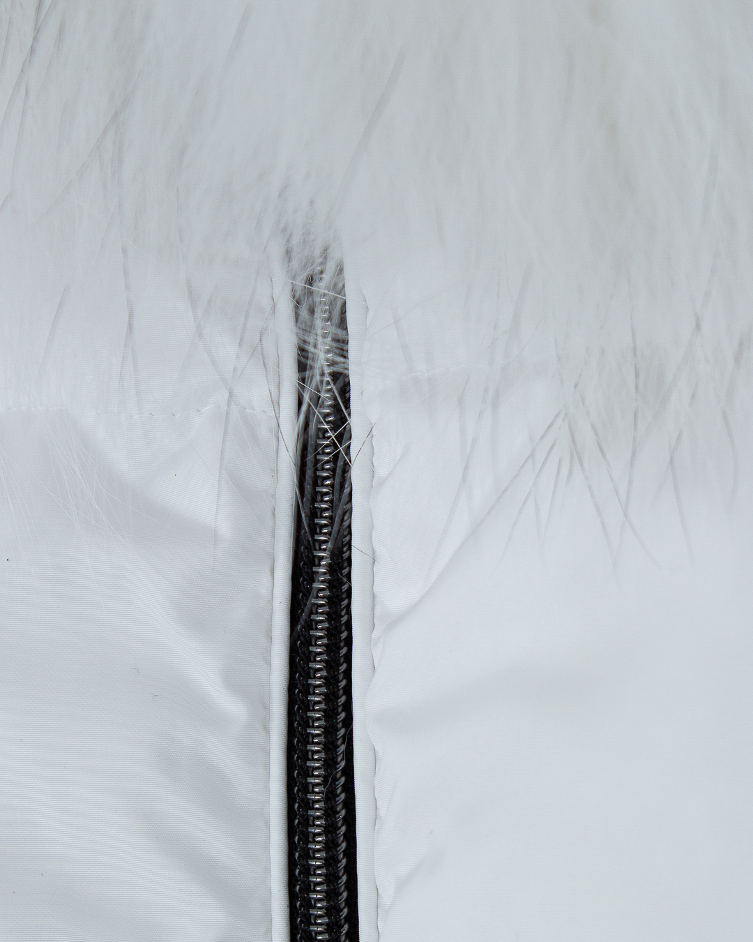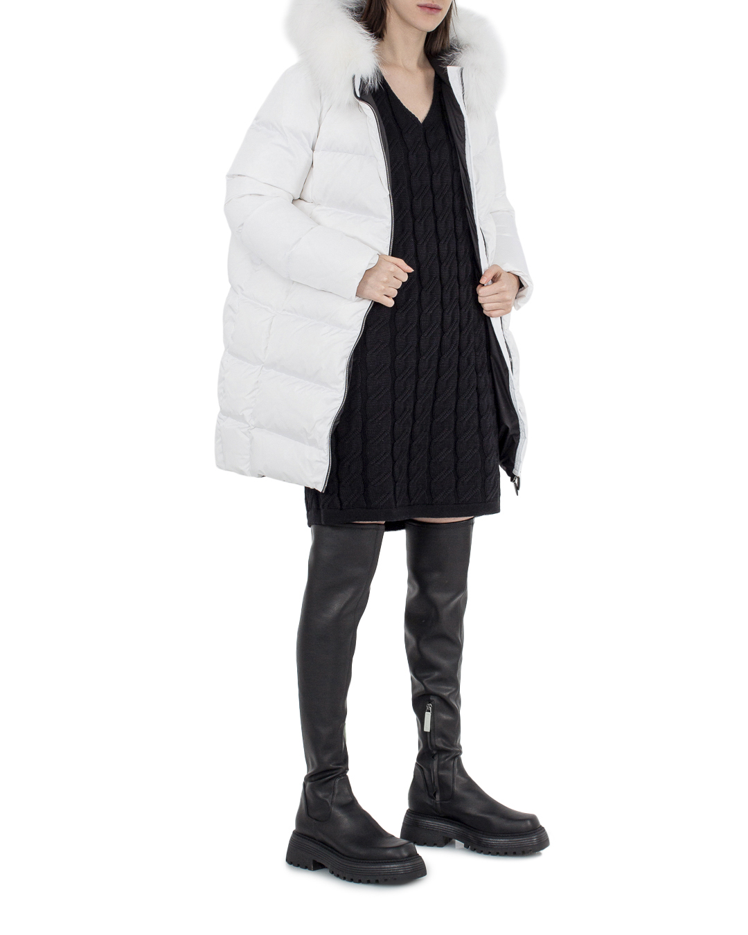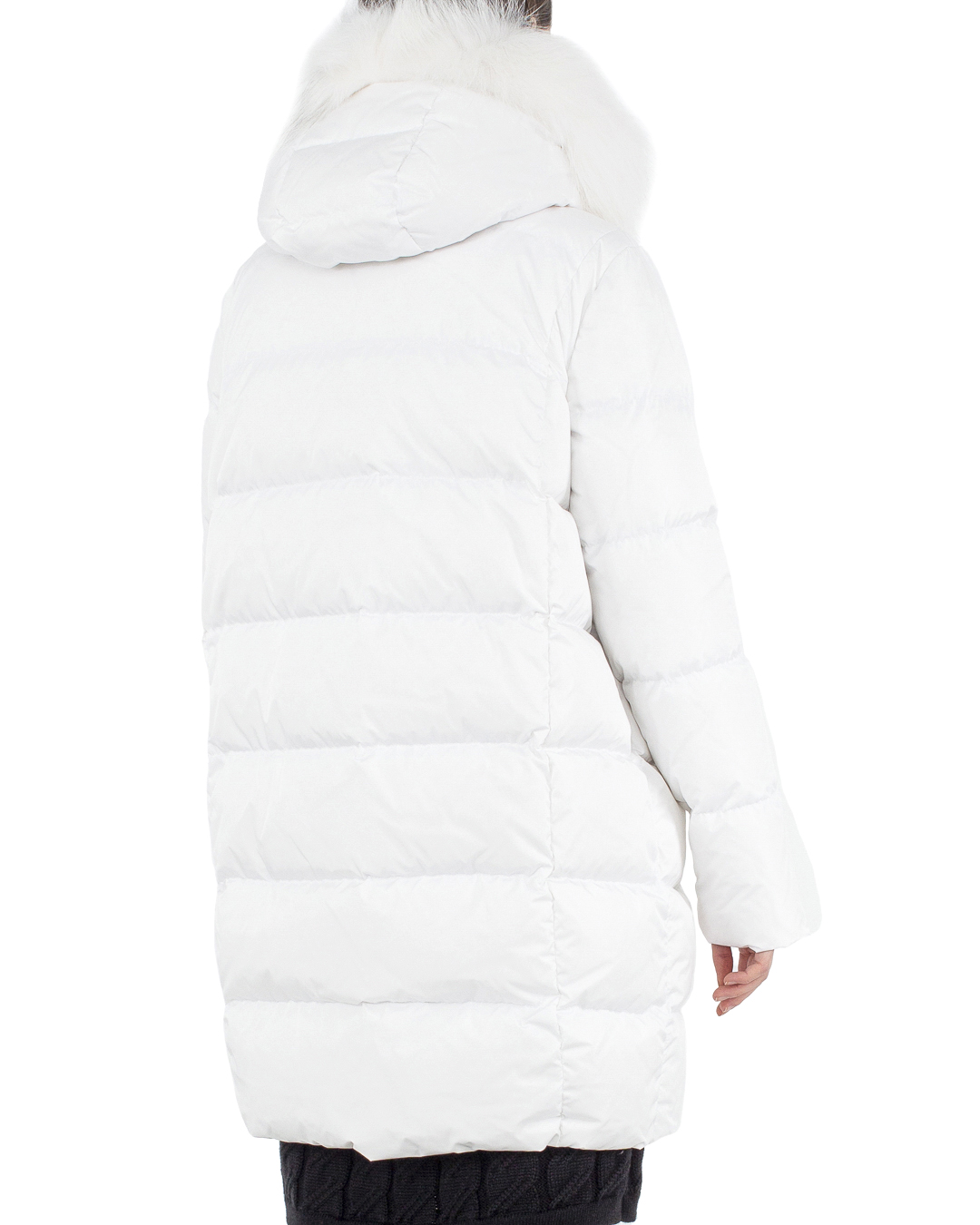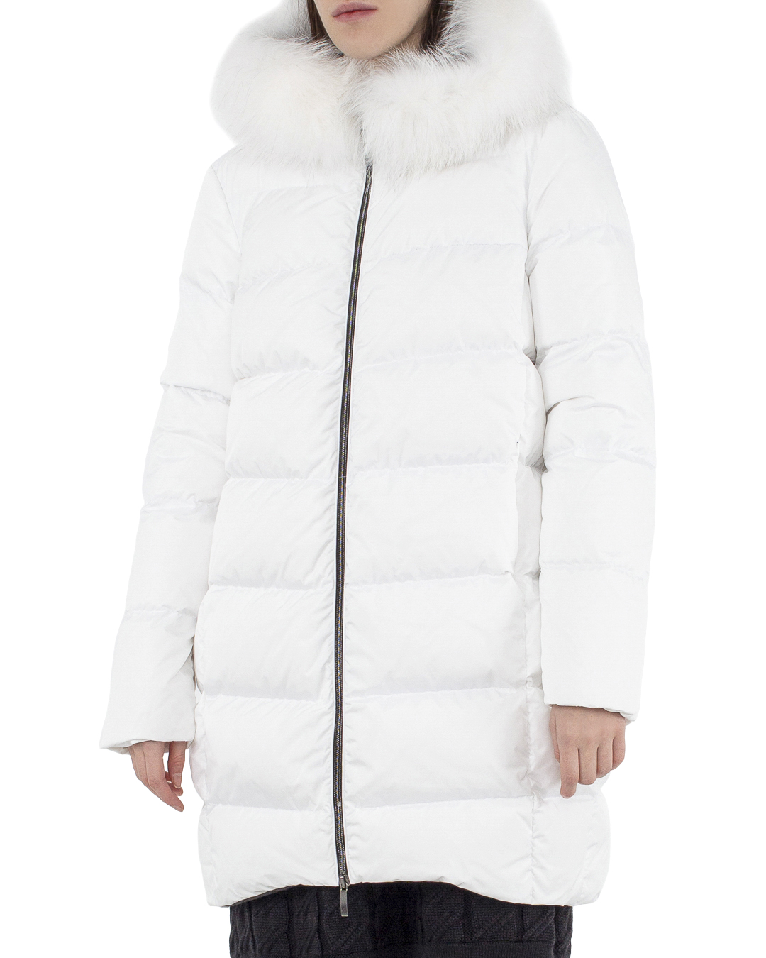 Стеганый пуховик из прочного нейлона, утепленный пухом и пером. Модель прямого объемного силуэта дополнена капюшоном с отделкой мехом и двумя карманами по бокам.