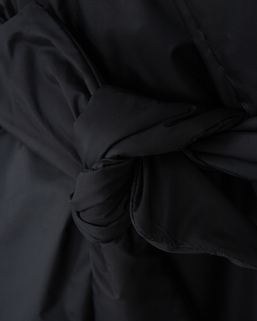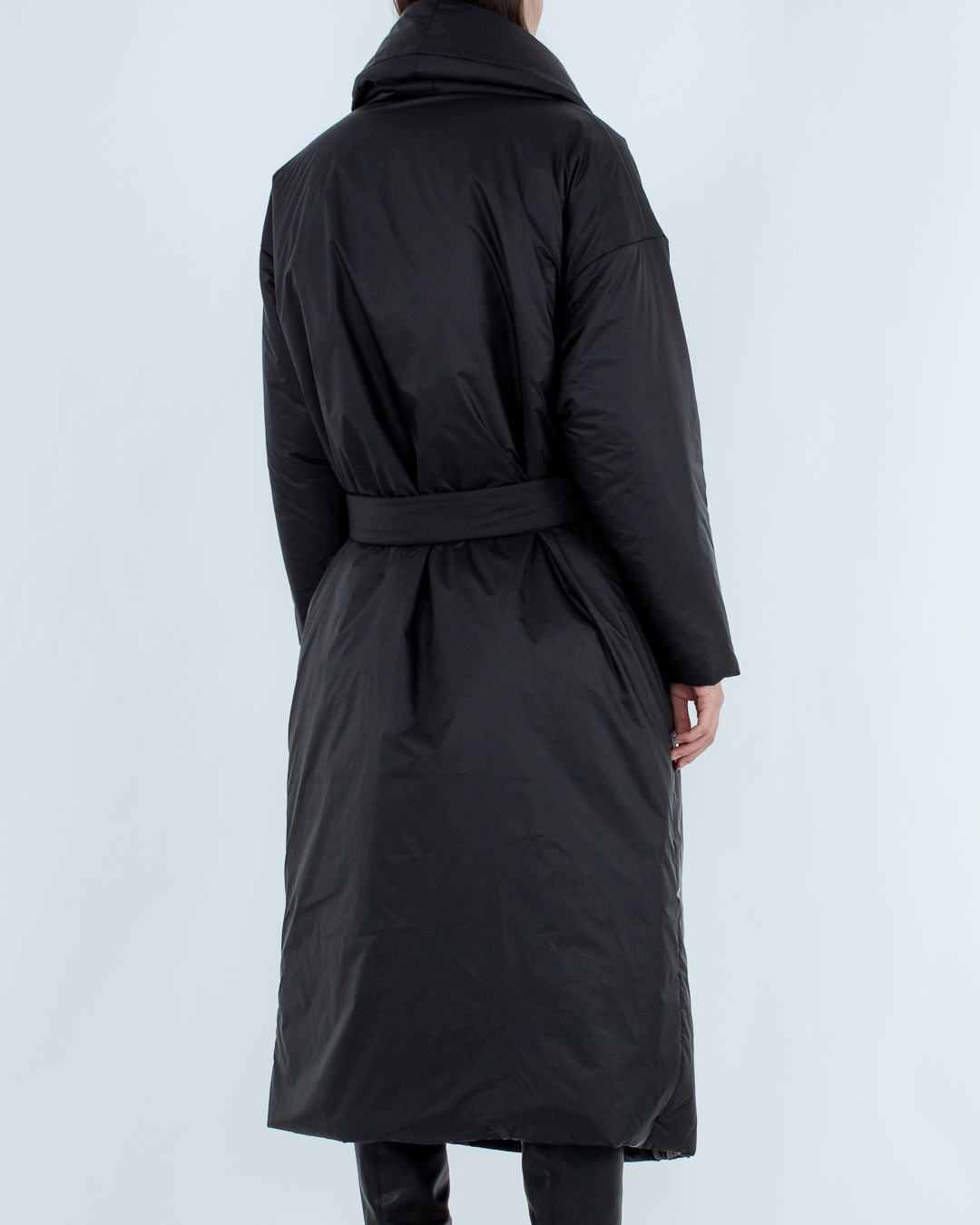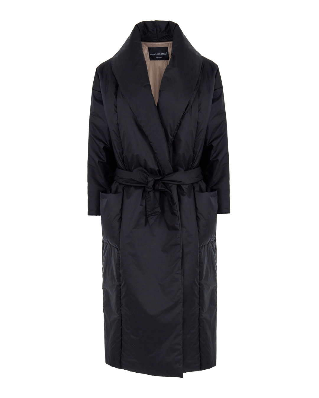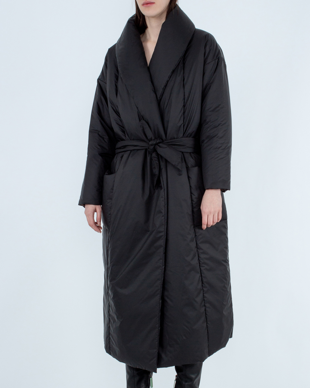 Пуховик-халат из прочного нейлона, утепленный пухом и пером. Модель прямого объемного силуэта дополнена отложным воротником, поясом из основного материала и двумя накладными карманами по бокам.