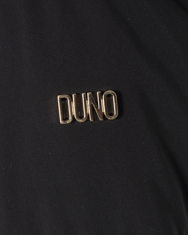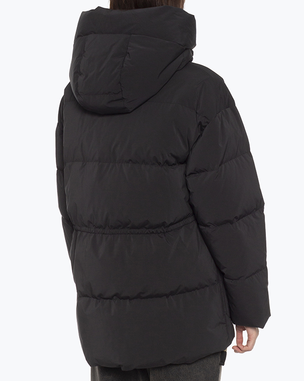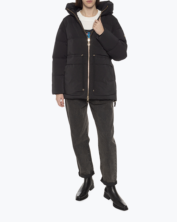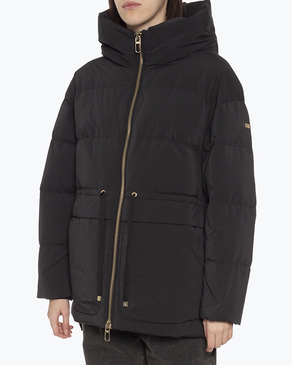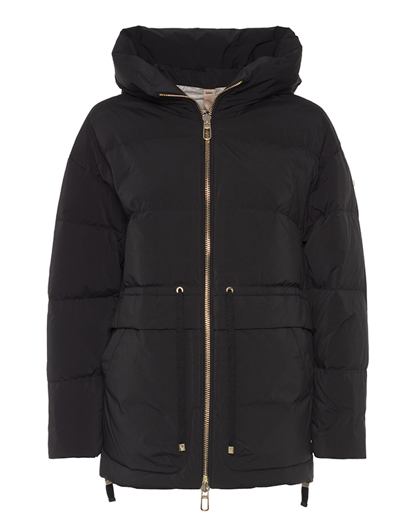 Куртка-пуховик из прочного нейлона черного цвета. Объемная модель прямого силуэта утеплена пухом и пером. Изделие прямого силуэта с застежкой на молнию дополнено завязками по линии талии и двумя вместительными карманами. Куртка с объемным воротником-стойкой и капюшоном.
