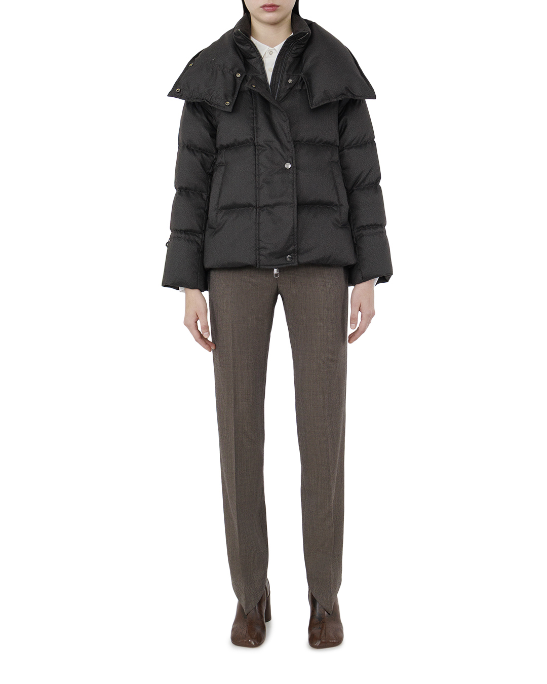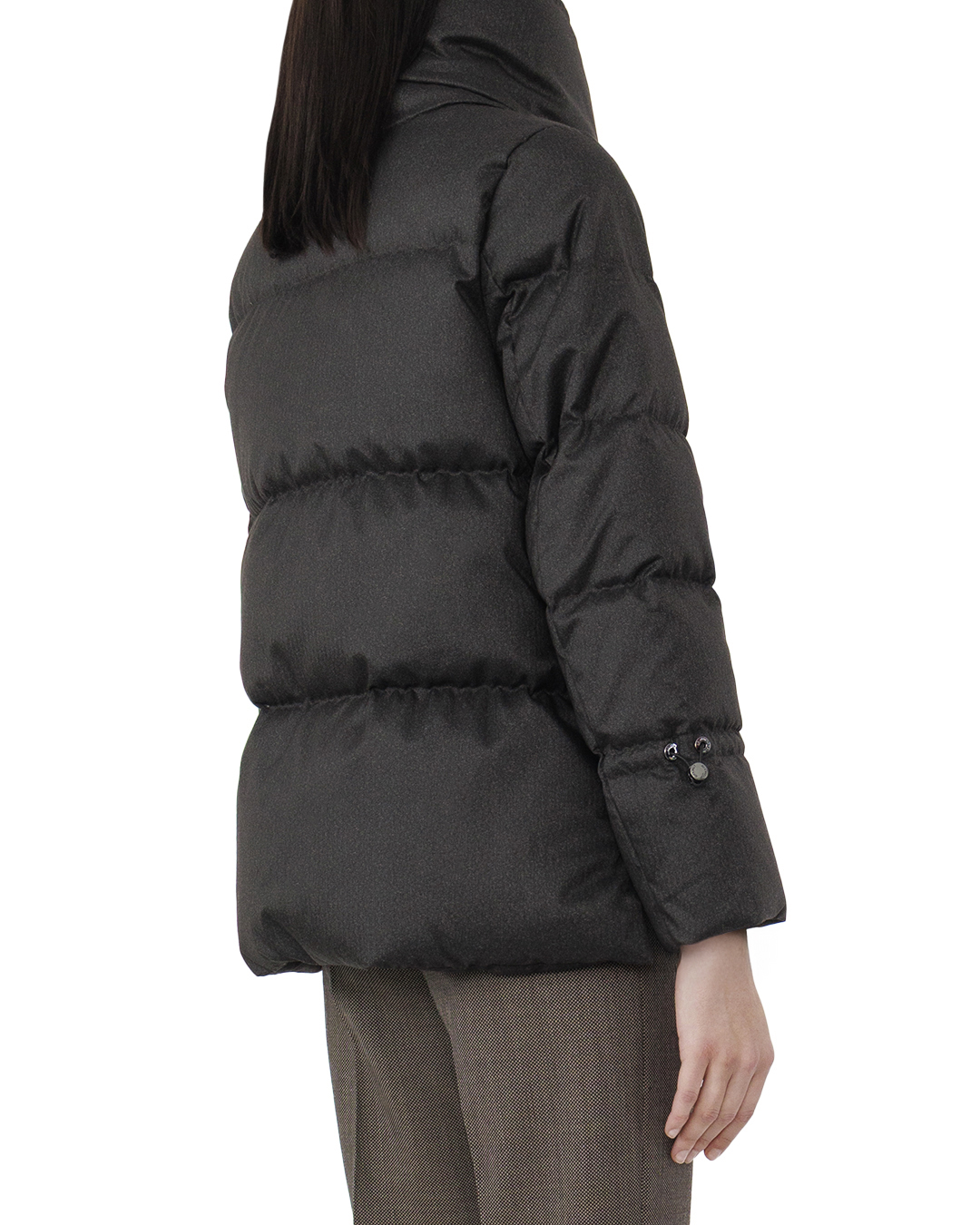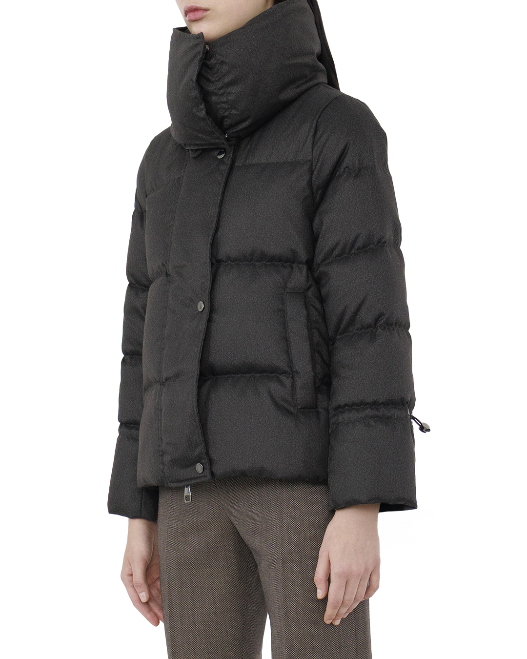 Этот элегантный пуховик вобрал в себя лучшие черты современного стиля и функционального дизайна. Изготовленный из высококачественной ткани с мягкой текстурой и глубоким графитовым оттенком, он прекрасно сочетается с любым зимним гардеробом и придаёт образу изысканность. Объёмный воротник-стойка добавляет конструкции выразительности и надежно защищает от холодного ветра, подчеркивая актуальную эстетику и элегантность. Стёганые панели создают чёткие линии, обеспечивая баланс между объёмом и структурированностью. Застёжка-молния, скрытая за планкой с кнопками, обеспечивает чистоту и целостность силуэта, добавляя изделию утонченность и современность. Внутренние манжеты на рукавах сохраняют тепло, а боковые карманы позволяют скрыть мелочи или согреть руки. Изысканные металлические детали фурнитуры подчеркивают высокое качество и продуманность каждой детали, создавая законченный и стильный образ. Этот пуховик станет незаменимым элементом вашего зимнего облика, сочетающим комфорт и шик.