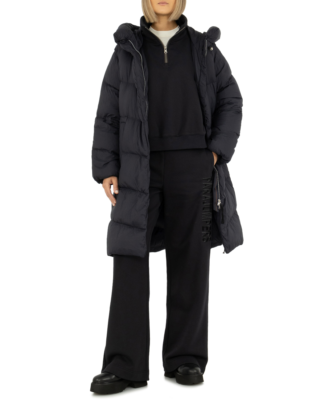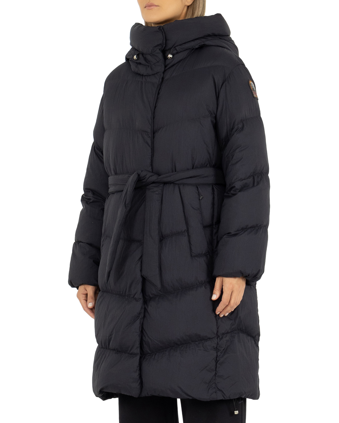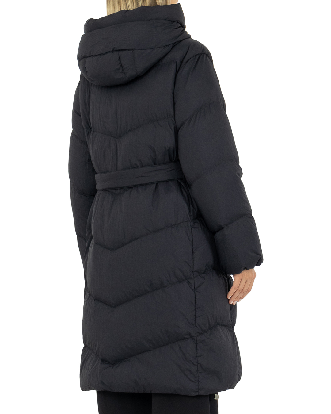 Удлиненный стеганый пуховик с капюшоном и двумя карманами сшит из гладкого матового нейлона. Объемная, но легкая модель можно носить как с поясом, так же она стильно смотрится и без него. Утеплена модель утиным пухом с добавлением пера.