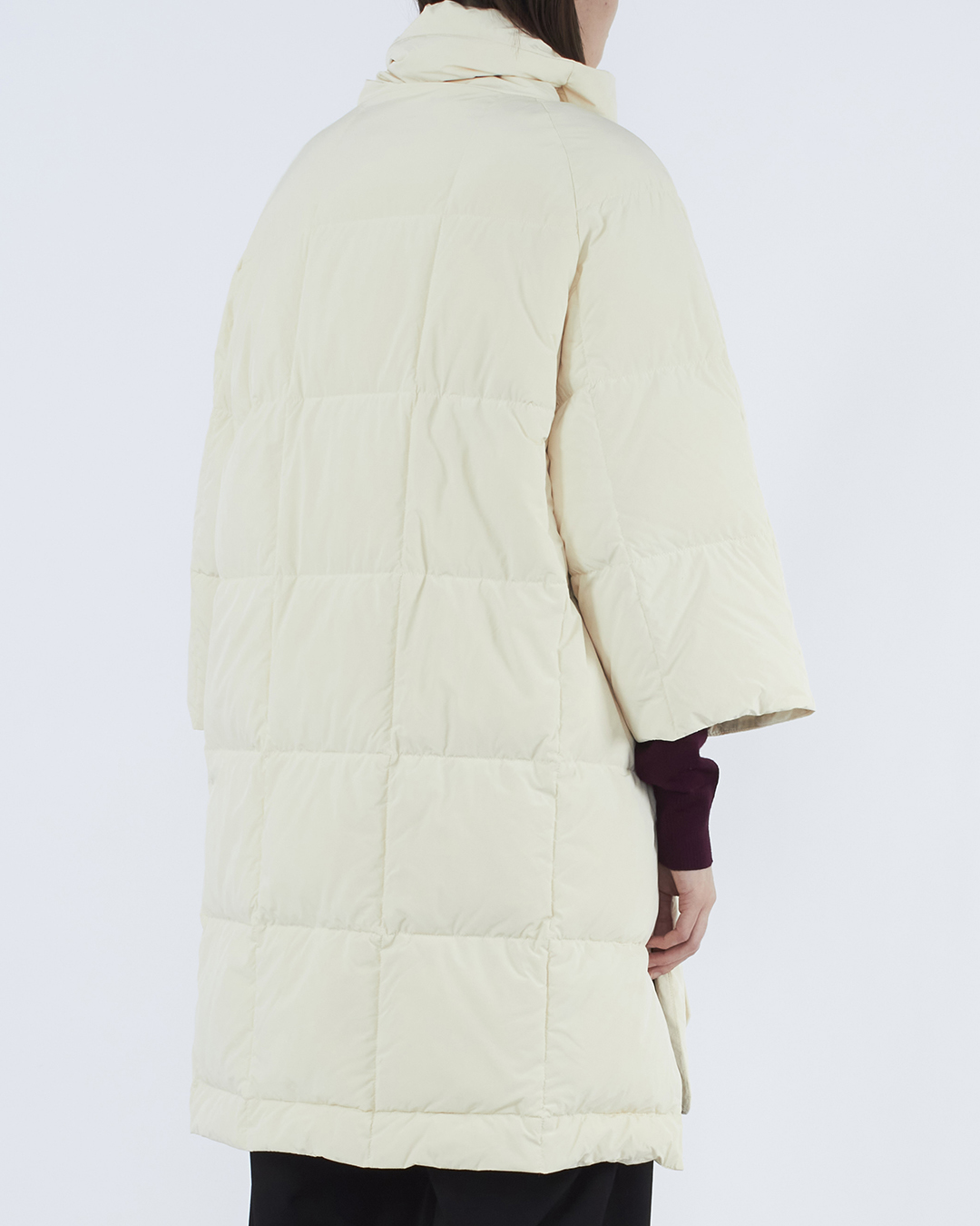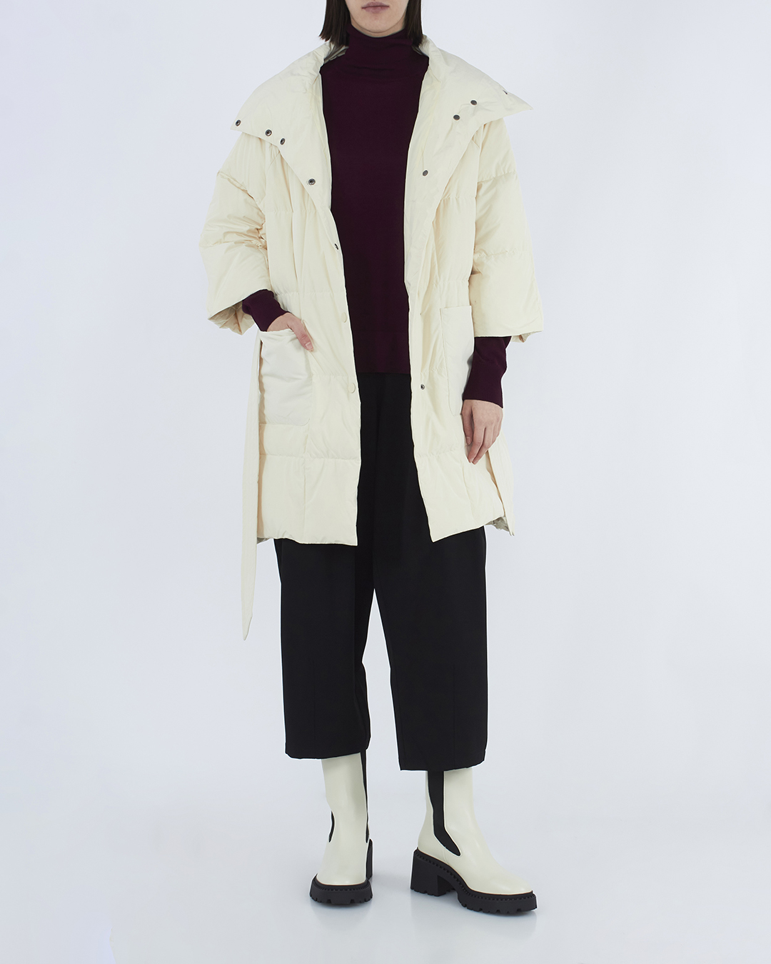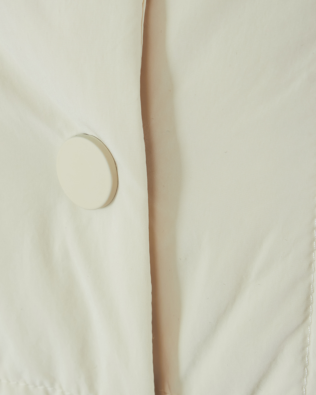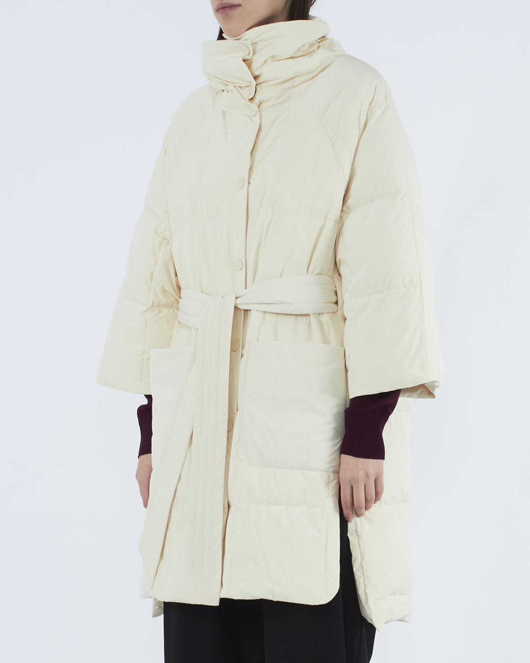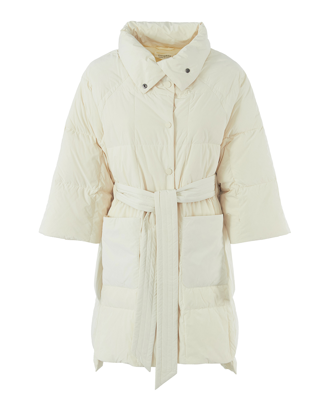 Куртка-пуховик из прочного нейлона бежевого оттенка. Модель прямого силуэта с застежкой на кнопки дополнена поясом и накладными карманами по бокам.