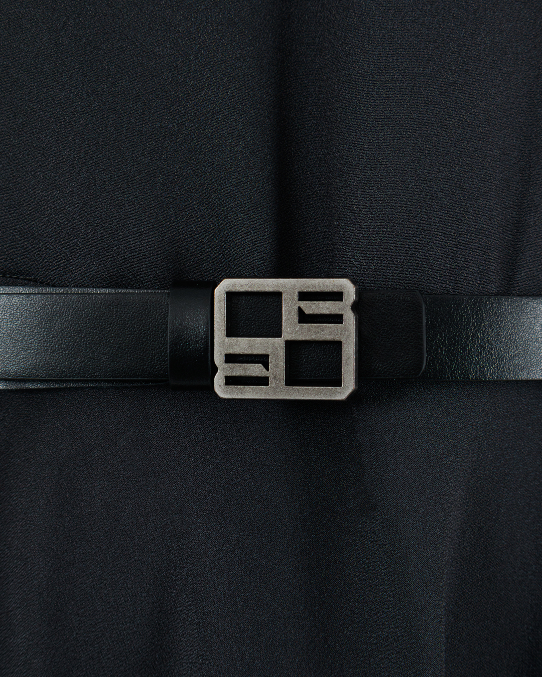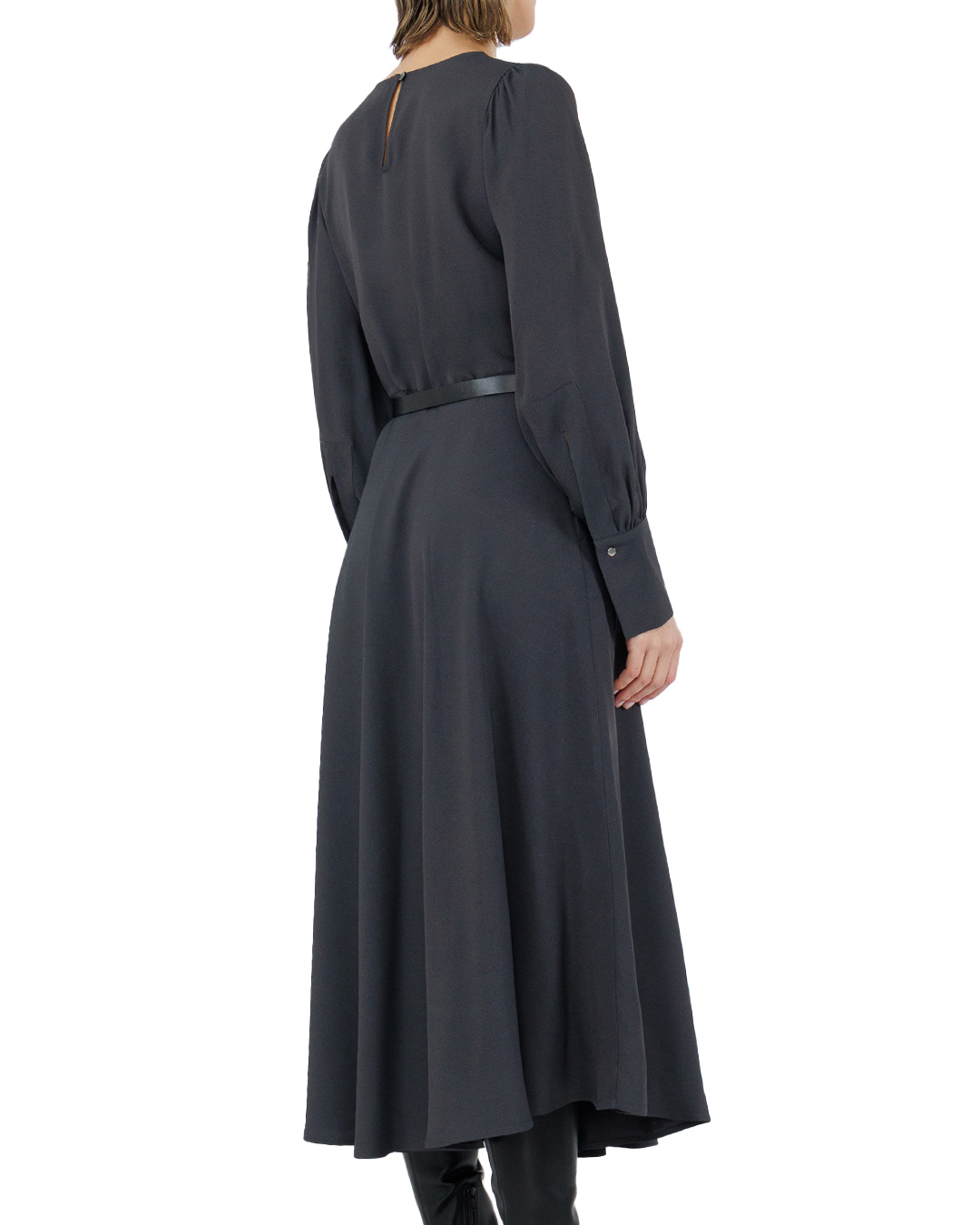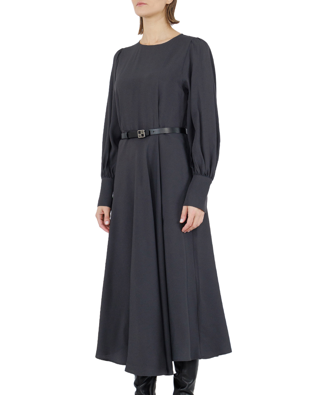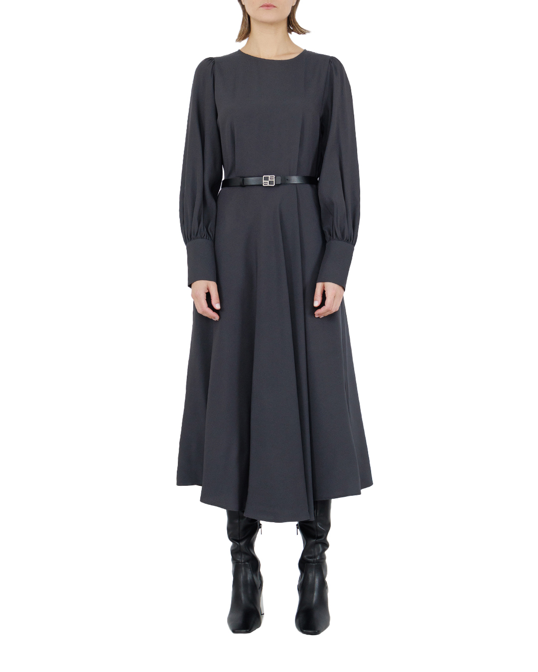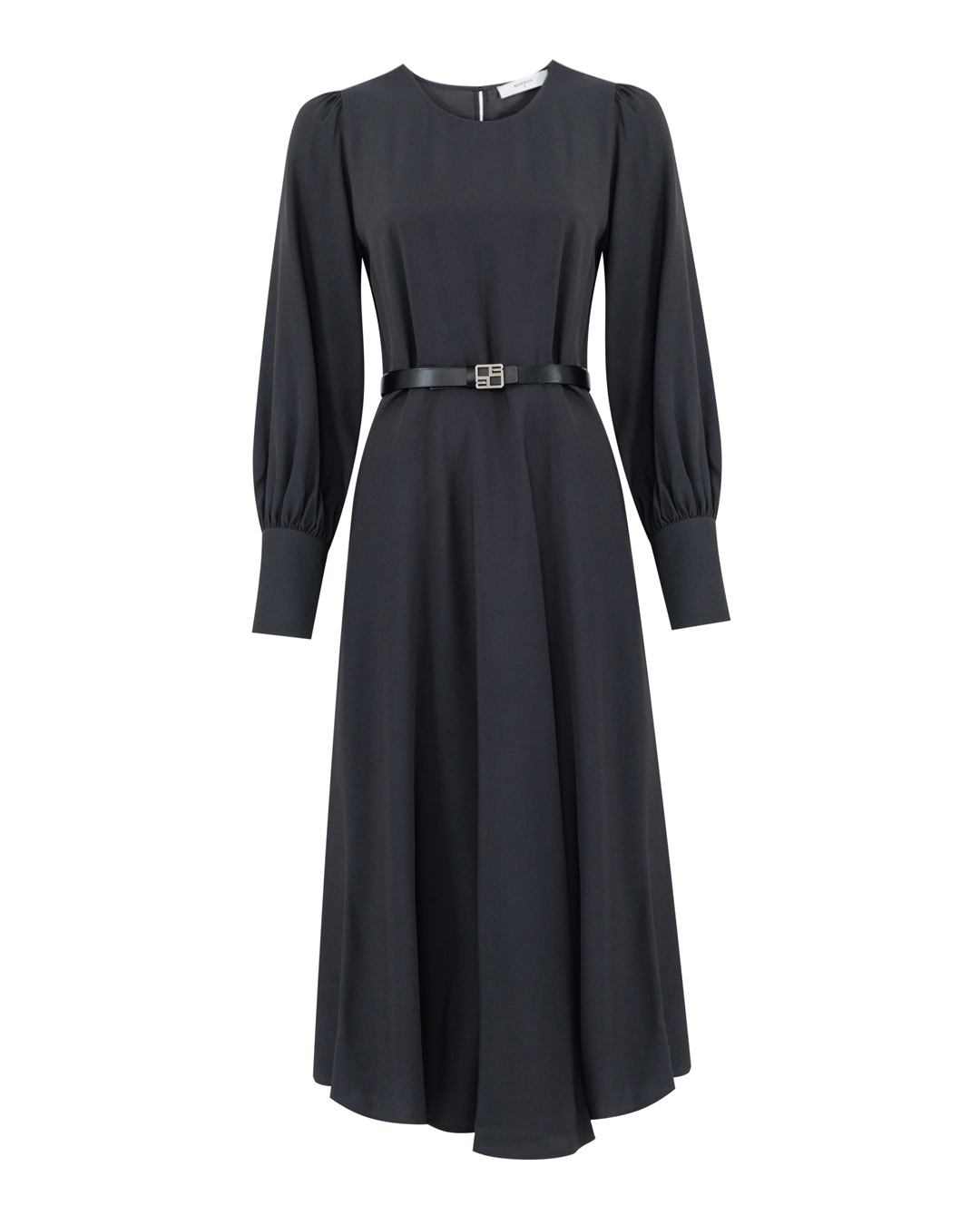 Это платье отзывчиво шепчет о классической изысканности, сочетающей в себе элегантность и современную утончённость. Изготовленное из нежной, струящейся ткани, оно грациозно обрамляет фигуру, создавая мягкий и женственный силуэт. Фасон с завышенной талией, подчёркнутой изящным ремешком с декоративной пряжкой, акцентирует внимание на линии талии, обеспечивая визуальную гармонию. Округлый вырез добавляет лаконичности и работает как идеальная основа для аксессуаров. Длинные рукава с объёмными манжетами и мягкими складками в области плеч создают эффектный объём, придавая облику нотку драматичности. Эффектные манжеты завершаются аккуратными пуговицами, воссоздающими образ безукоризненной отделки. Юбка миди длины расположена в свободной форме, слегка расширяясь к низу, что добавляет движения и лёгкости образу. Это платье станет идеальным выбором как для делового собрания, так и для романтического вечера, обеспечивая акцент на элегантной простоте и безупречном вкусе.