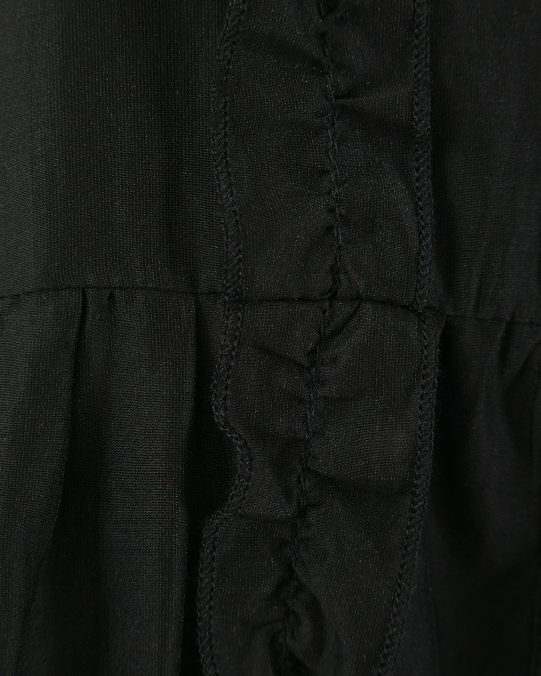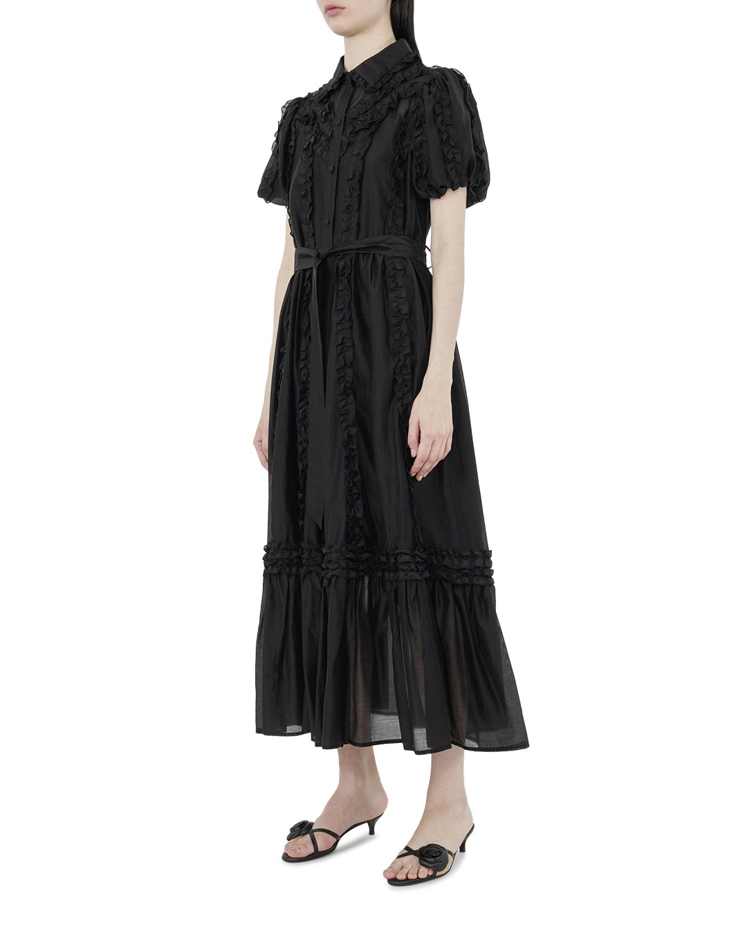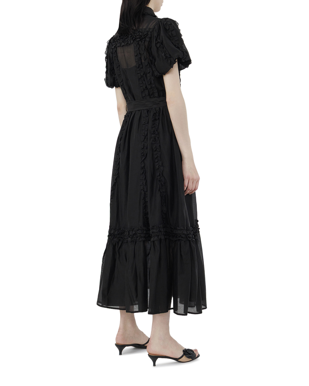 Это платье воплощает элегантность с нотками винтажного стиля, создавая утонченный и элегантный образ. Изготовленное из ткани в универсальном черном оттенке, оно идеально подчёркивает естественную красоту и тонкий вкус. Верх платья отличается классическим отложным воротником и короткими рукавами с нежной сборкой, что добавляет мягкость и женственность. Горизонтальные рюши по лифу создают изысканный рельеф, придавая дополнительный объём и декоративность. Центральная застёжка на пуговицах, проходящая по всей длине платья, обеспечивает лёгкость в надевании и добавляет удобства. Талия подчёркнута мягкой сборкой, плавно переходящей в расклешённую юбку, что создаёт лёгкий силуэт, добавляющий воздушности и движения. Юбка дополнена изящными рядами рюшей, что вместе с полупрозрачной тканью придаёт наряду лёгкость и романтичность. Длина миди позволяет сочетать платье с разнообразной обувью, варьируя стиль от повседневного до вечернего. Эта модель станет отличным выбором для тех, кто ценит женственность и классические элементы в современном исполнении,