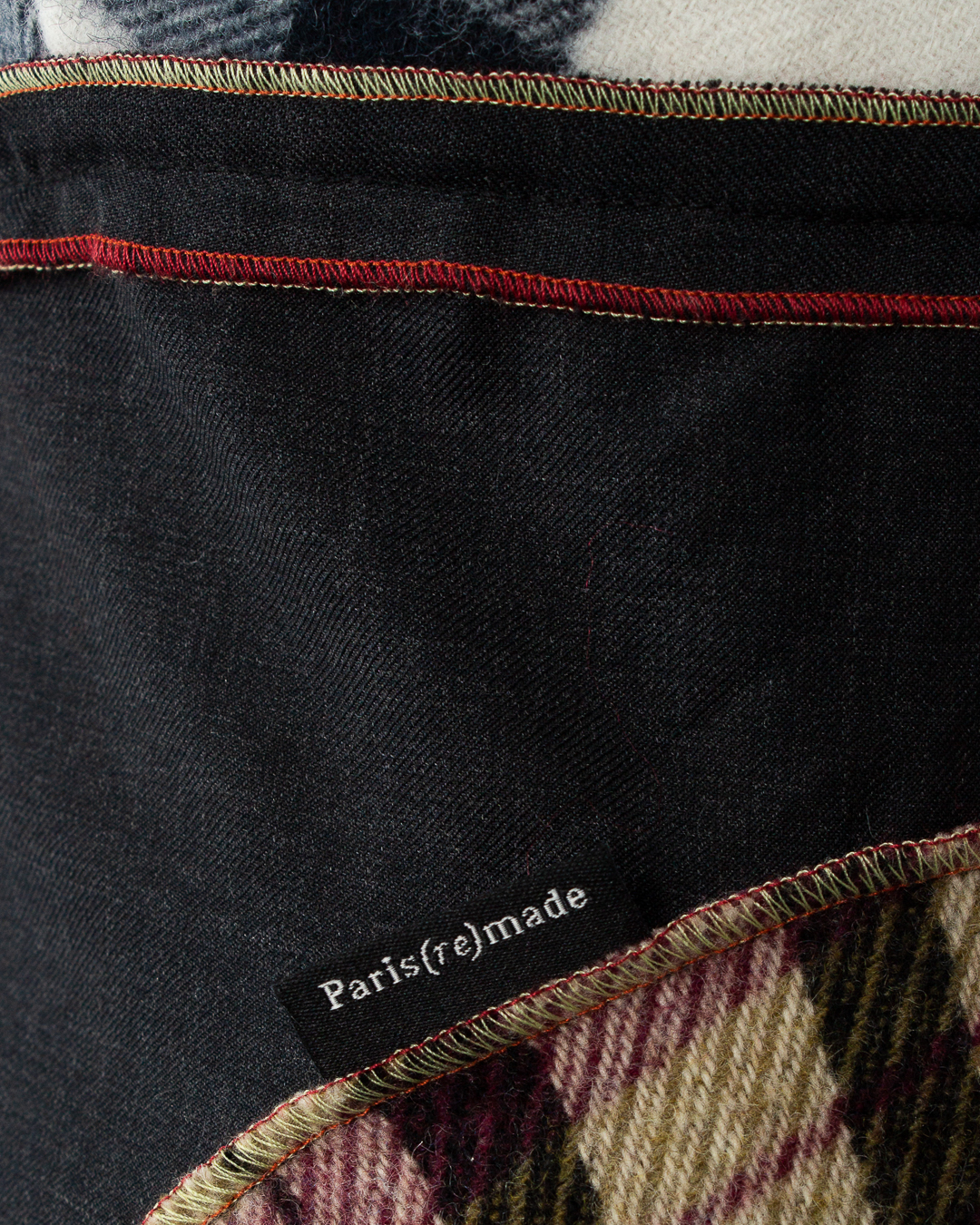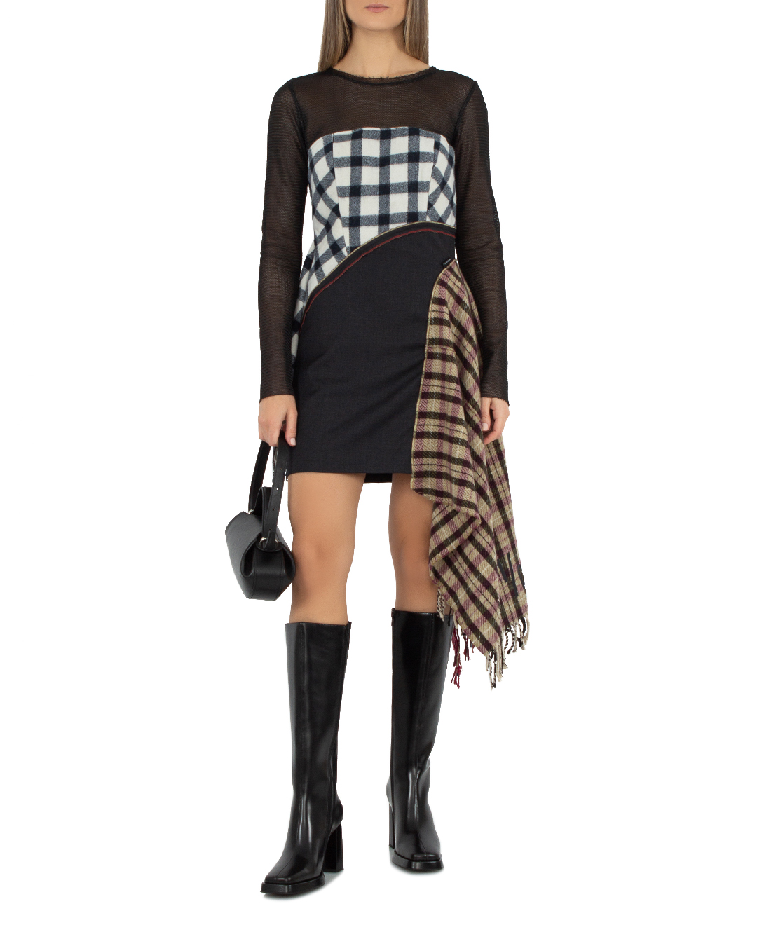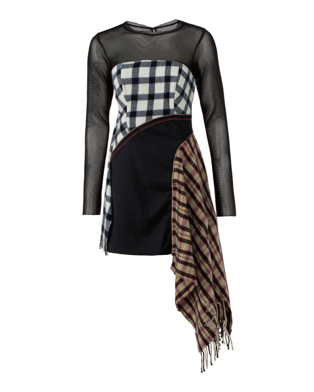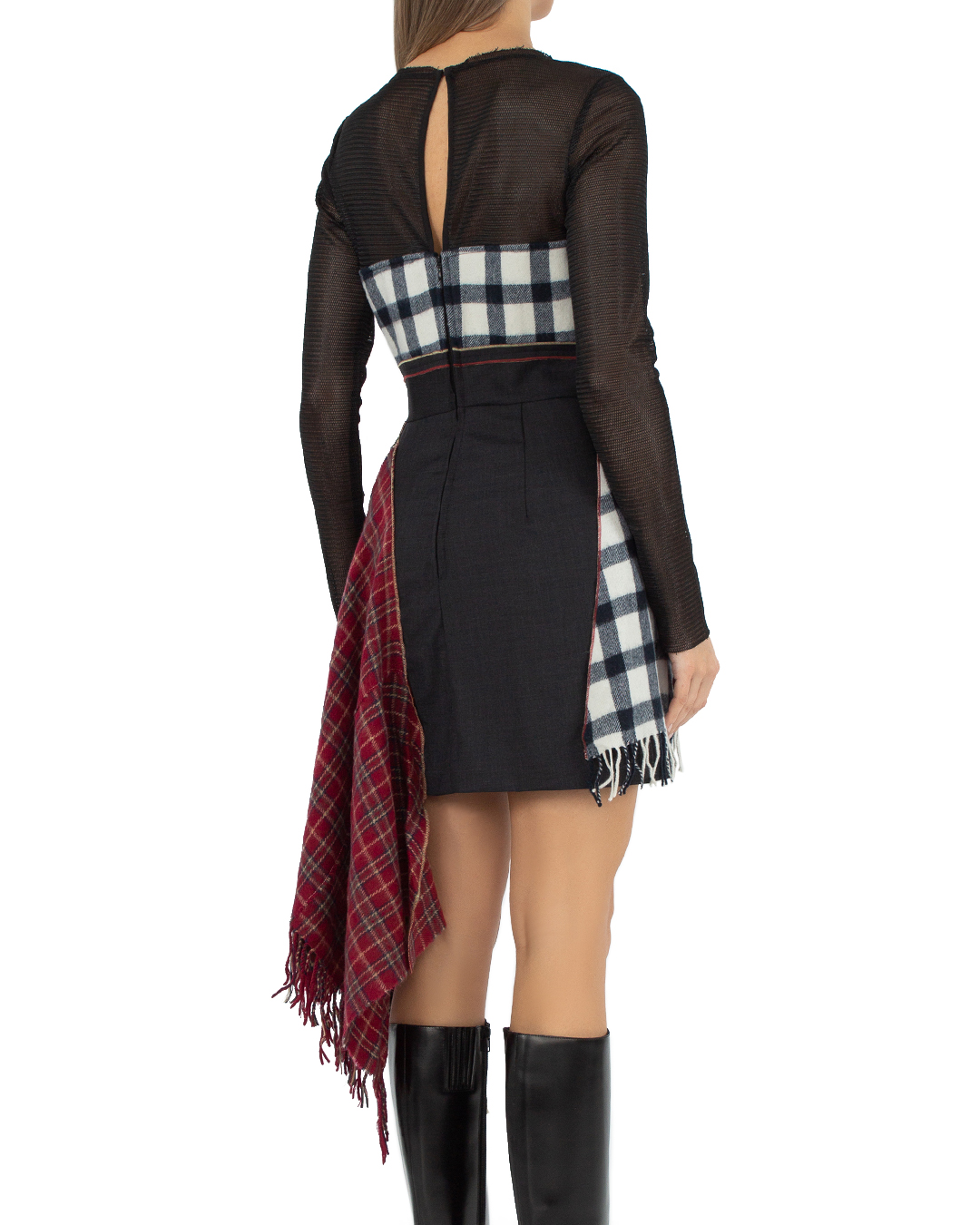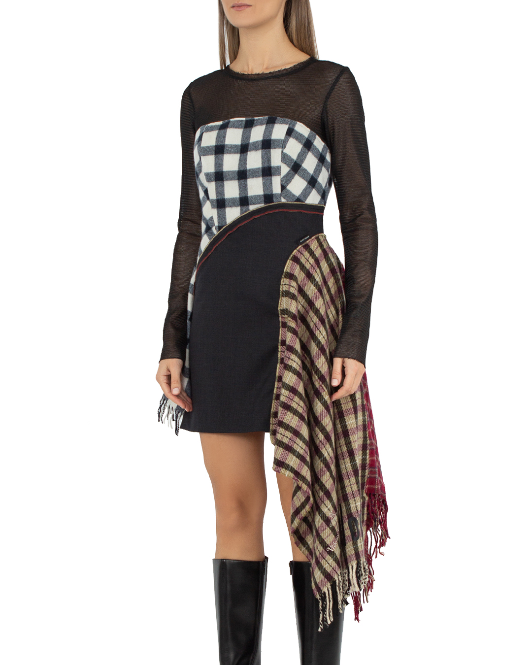 Рестайлинговое платье 1/OFF сшили из комбинированного материала и дополнили вставками из шарфов в клетку с бахромой. Модель с застежкой на спине на молнию.