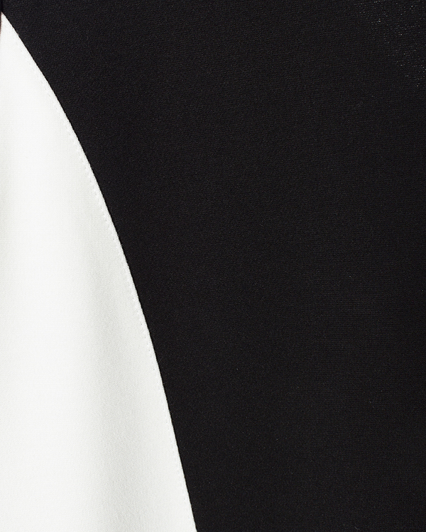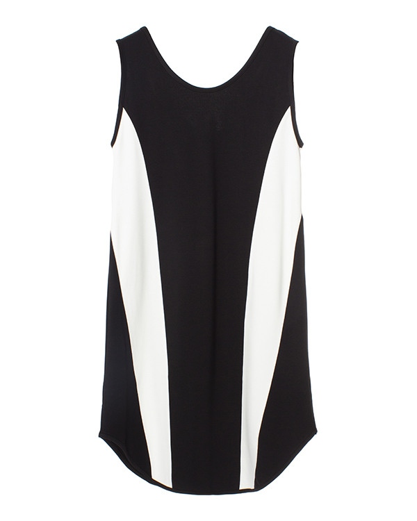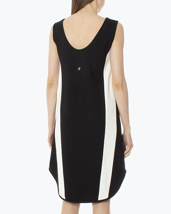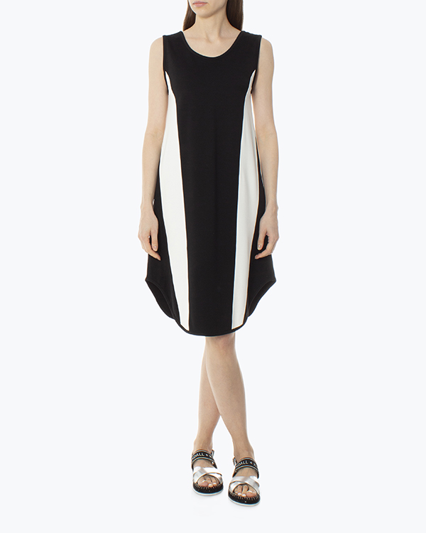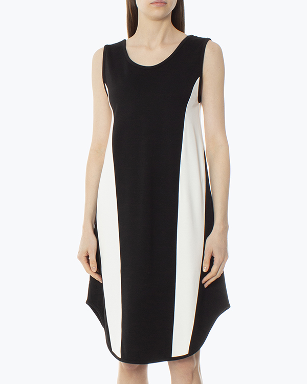 Монохромное платье из вискозы и эластичных нитей нейлона в черно-белом исполнении. Модель прямого свободного силуэта с закругленной линией низа.