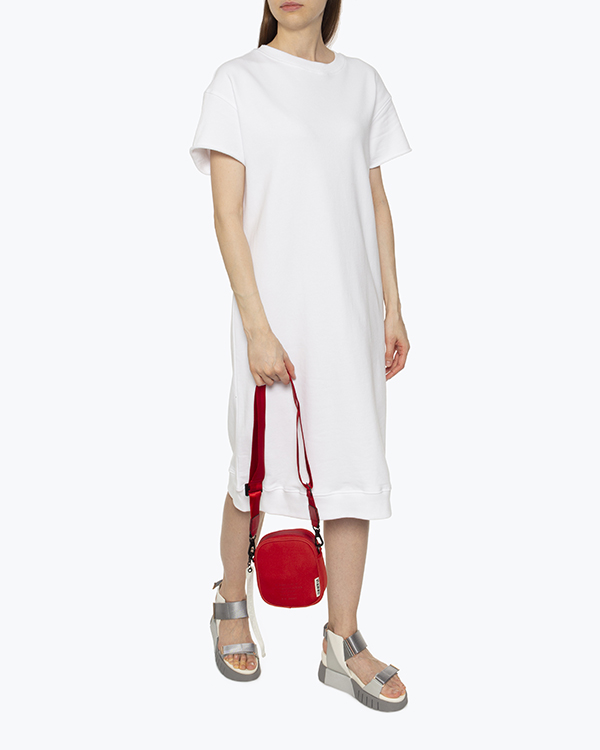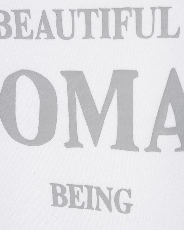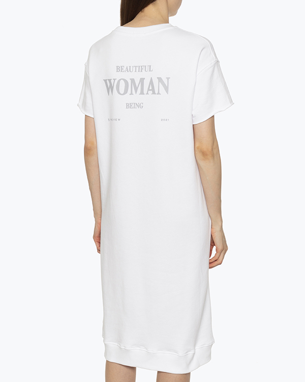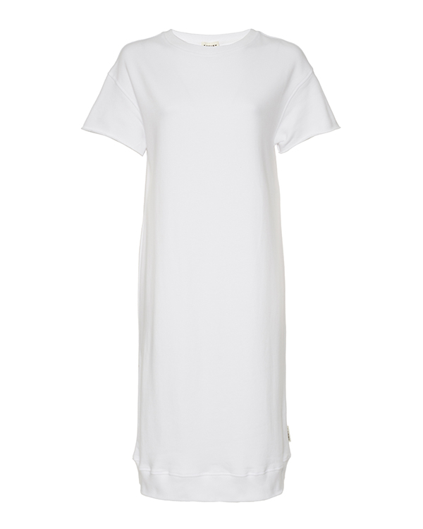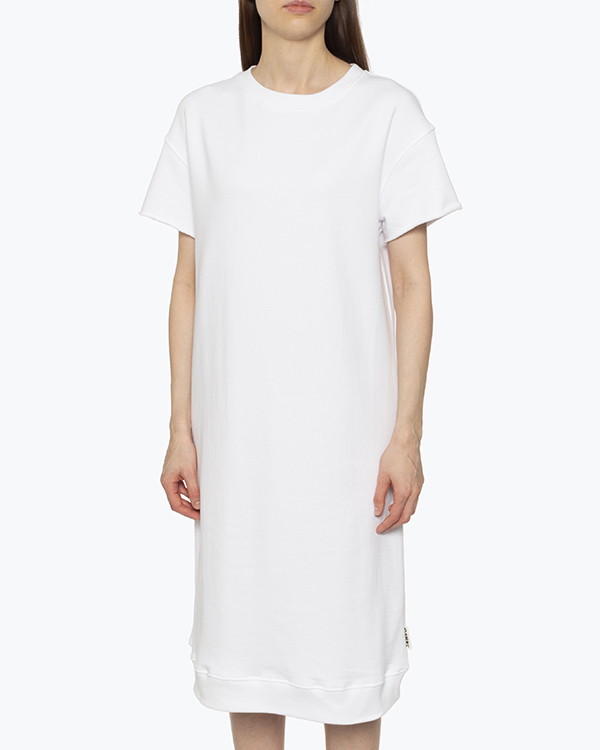 Платье толстовочного вида из хлопкового трикотажного футера белого цвета с принтом на спине.Модель прямого силуэта со спущенной линией плеч и уплотненной отделкой линии низа.