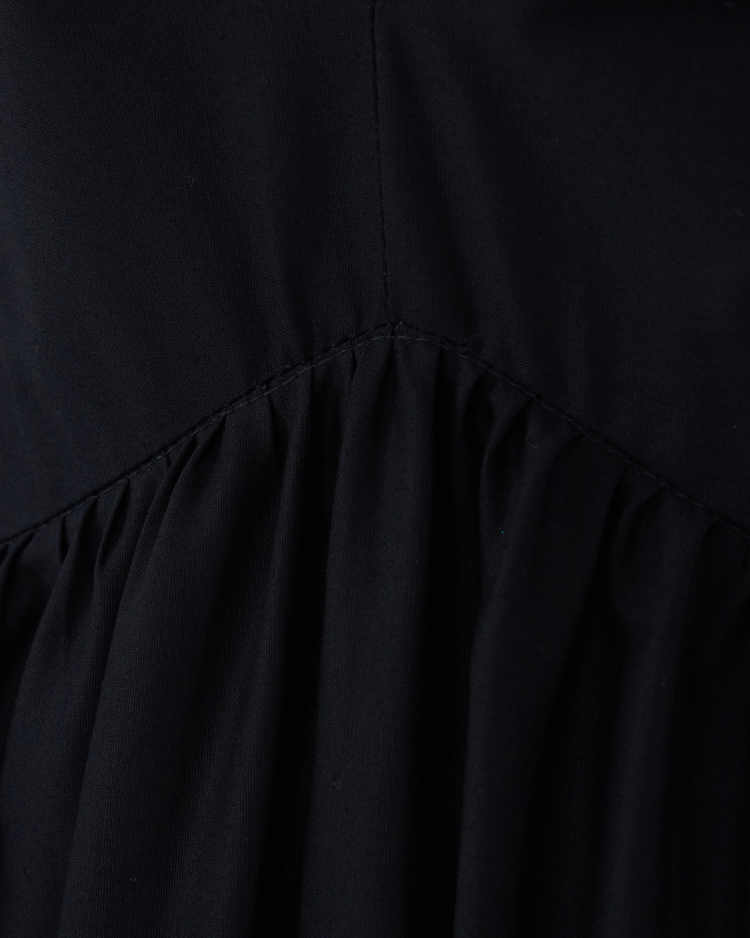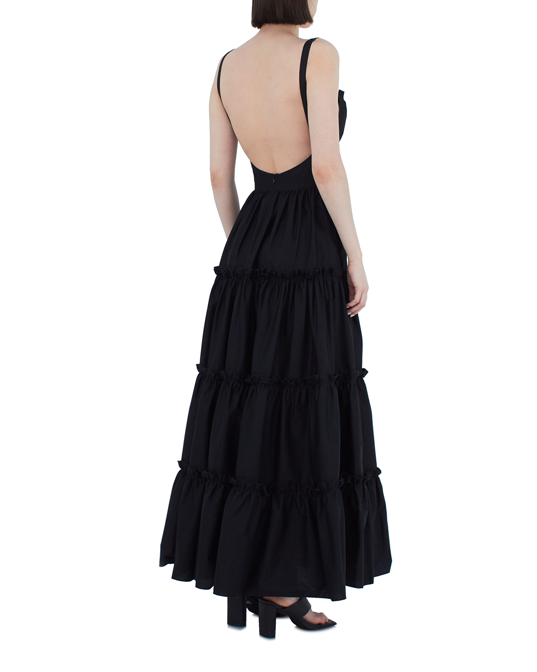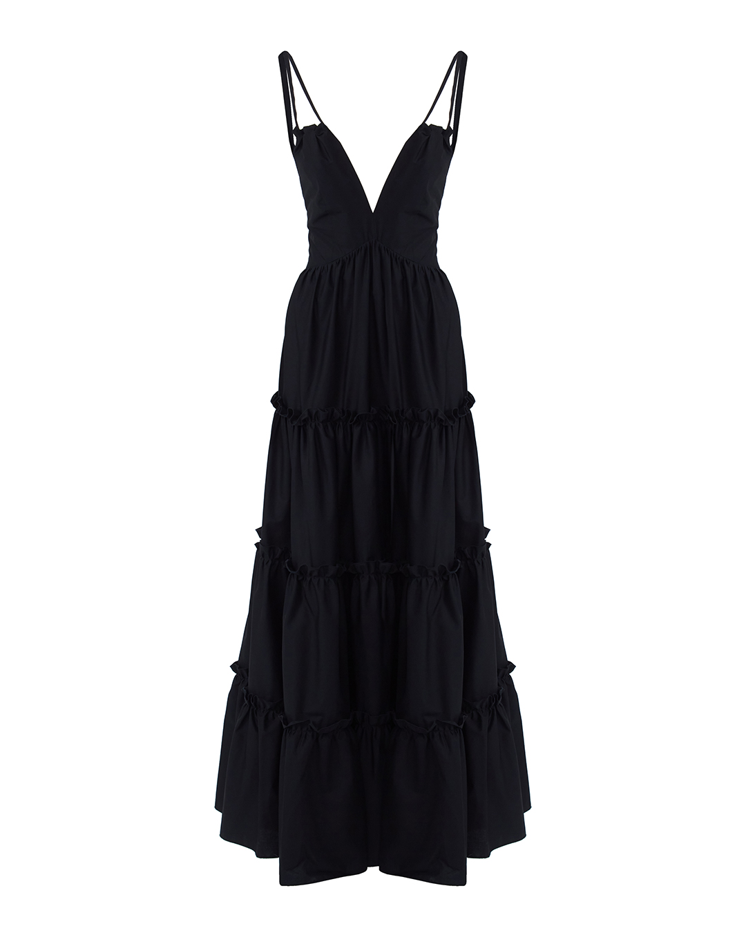 Платье длины макси сшито из хлопка черного цвета. Модель приталенного силуэта с открытым верхом и глубоким декольте дополнена пышной юбкой.