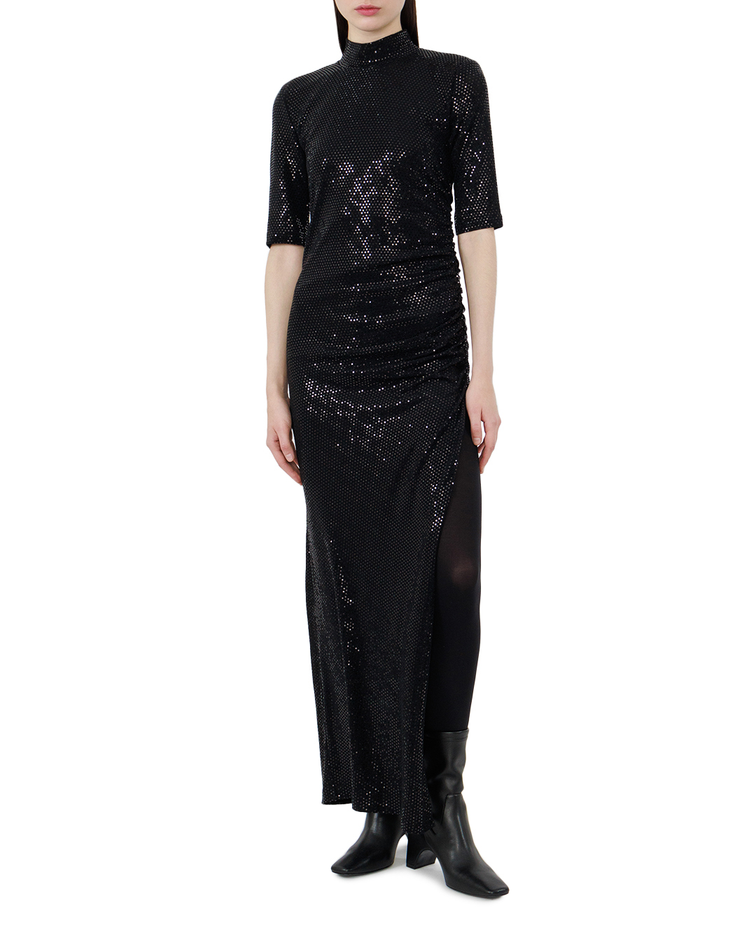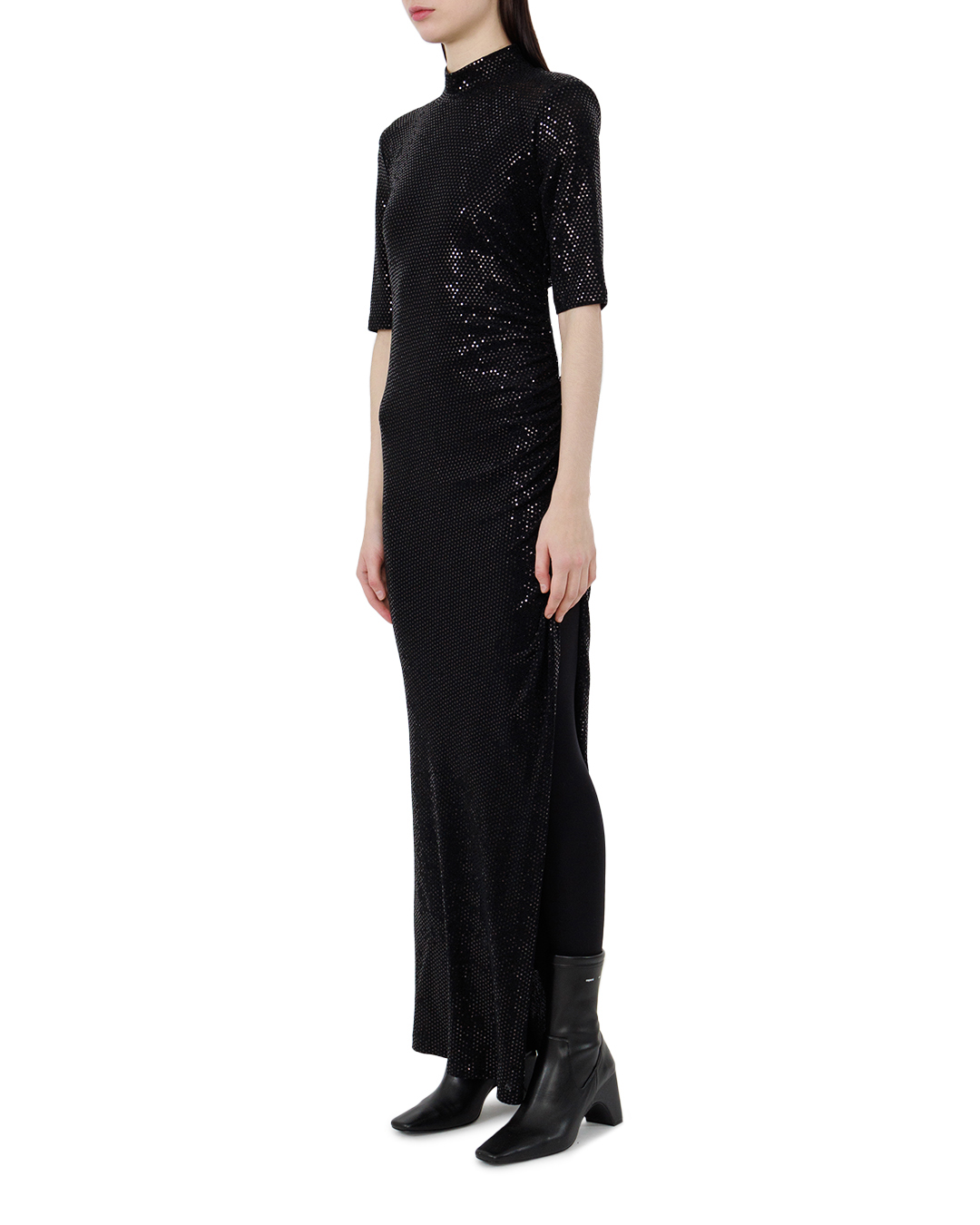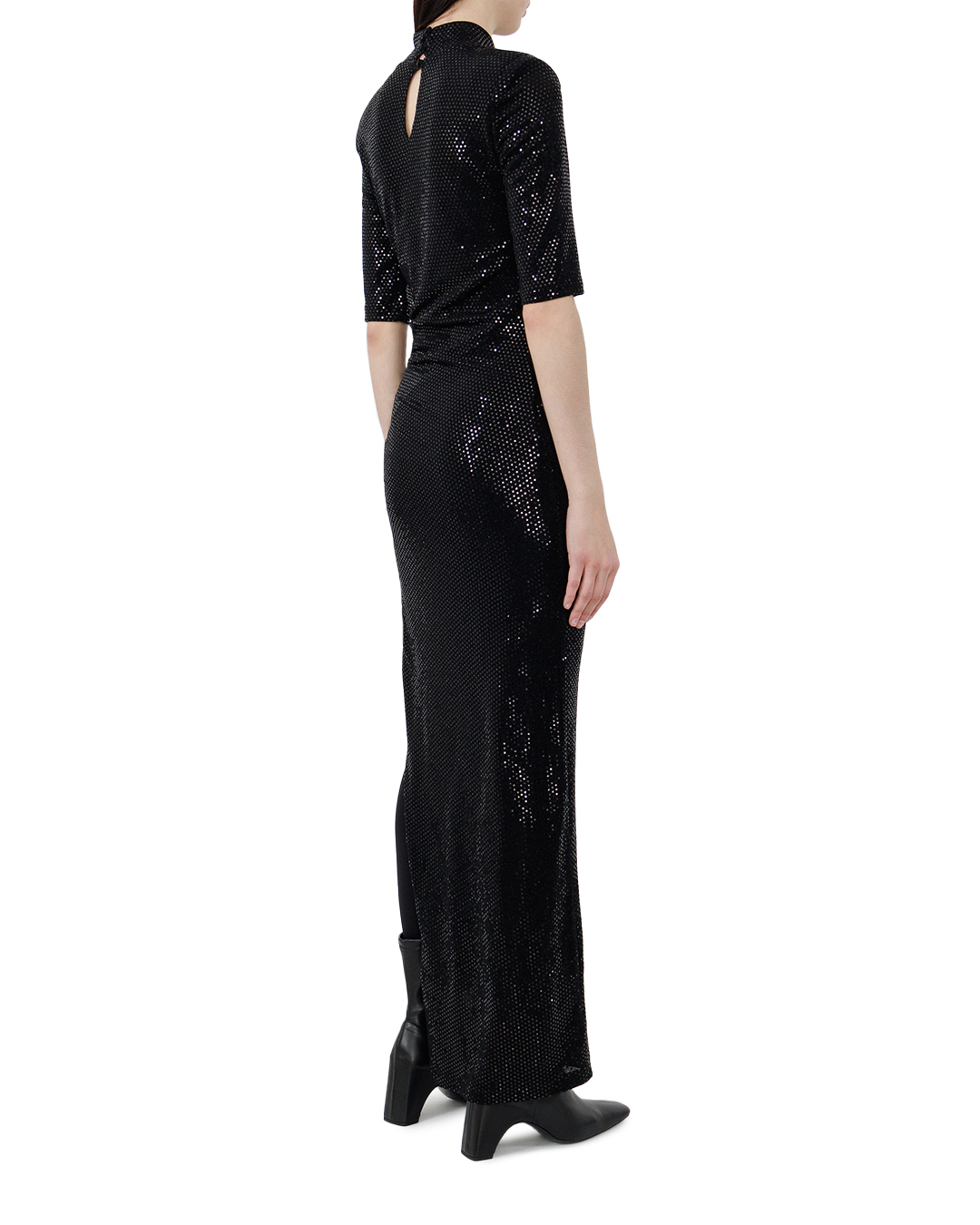 Это платье воплощает стильный минимализм с ноткой утонченного гламура. Изготовленное из ткани, покрытой блестками, оно создает эффект фантастического сияния, который привлекает взгляды и подчёркивает фигуру. Элегантный силуэт в стиле «колонна» с короткими рукавами до локтя и высоким воротом сочетает в себе сдержанность и современность. Струящаяся по фигуре ткань создаёт изящную драпировку на талии, добавляя визуальную динамику. Длина макси дарит образу величественность, а текстурная поверхность ткани добавляет глубину и интерес. Бесшовные линии и аккуратная застежка на спине подчеркивают мастерство исполнения, добавляя образу завершенность. Это платье идеально подходит для коктейльных вечеров и торжественных мероприятий, создавая эффектный образ, сочетающий в себе классический стиль и современные тенденции.