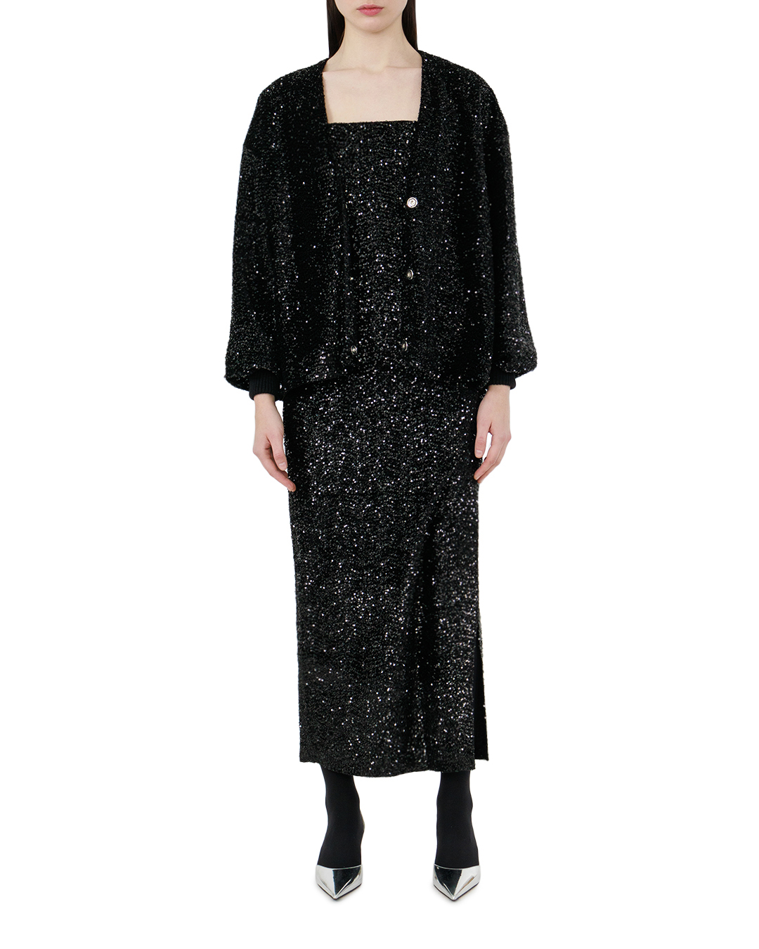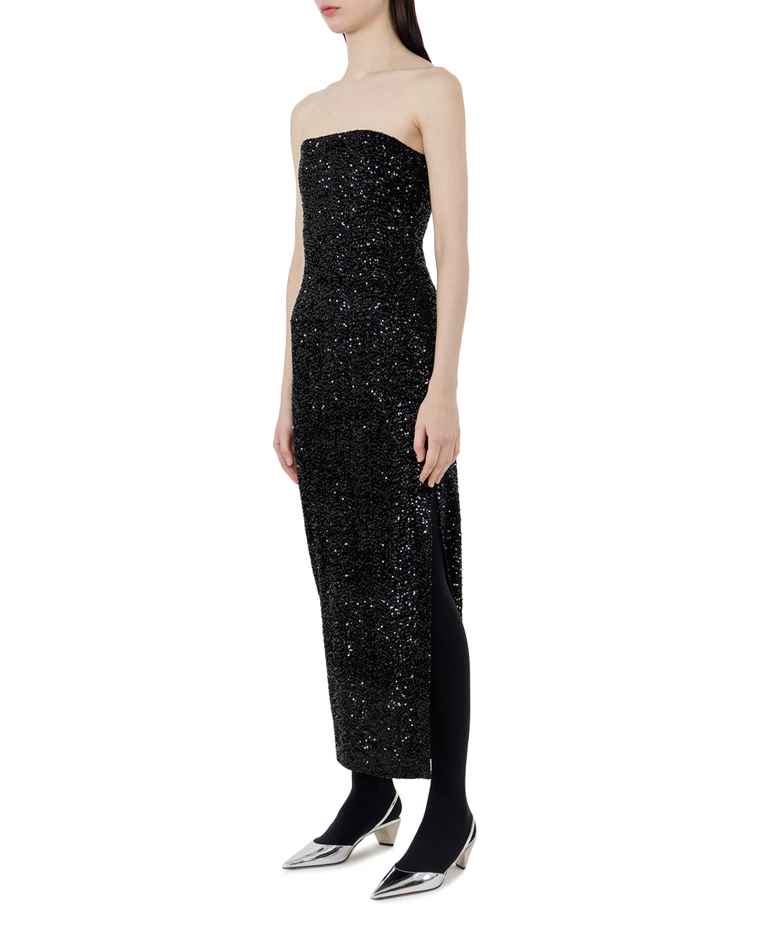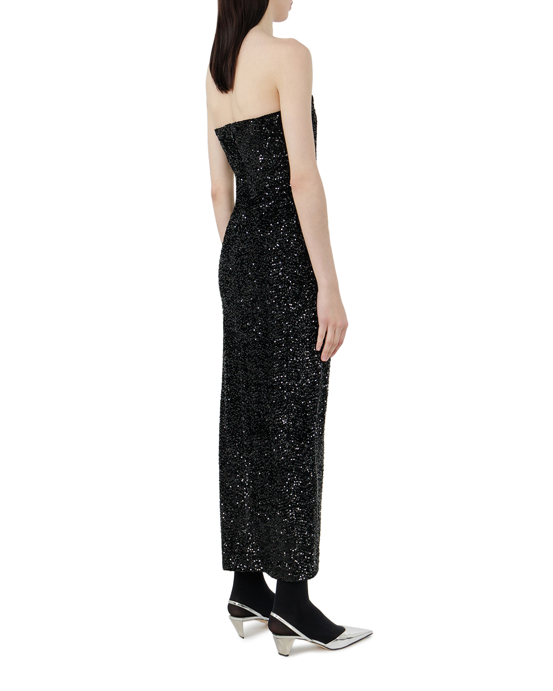 Это платье — квинтэссенция вечернего гламура и утончённого стиля. Изготовленное из блестящей ткани, оно эффектно облекает фигуру и создаёт притягательное сияние, словно ночное небо, усыпанное звёздами. Силуэт платья представляет собой классический «колонну» без бретелей, что подчёркивает плечи и линию декольте, придавая образу изысканность и женственность. Плотная посадка создаёт скульптурный эффект, гармонично подчёркивая каждую деталь фигуры. Элегантная длина макси обеспечивает драматичность и величественное ощущение, делая ваше присутствие незабываемым. Несмотря на кажущуюся простоту, изысканный дизайн и уникальная текстура ткани сами по себе становятся выразительными деталями. Это платье подходит для самых особых случаев, привнося в ваш образ нотку магии и роскоши, идеально выделяя вас на любом торжестве или вечернем мероприятии.