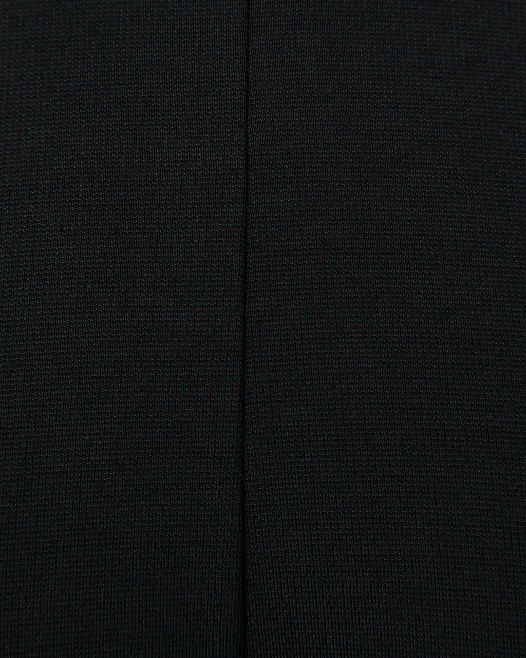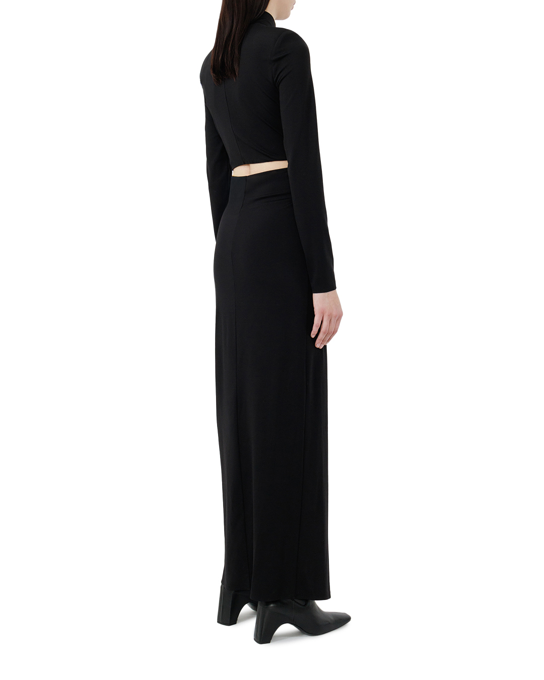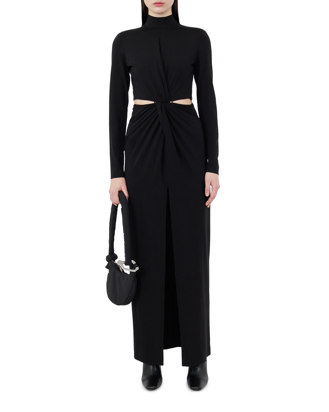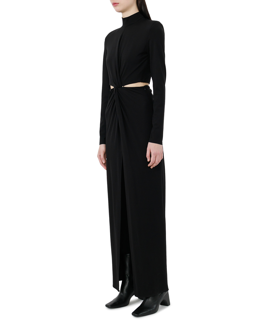 Это платье изысканно сочетает в себе современный стиль и классическую элегантность. Гладкая черная ткань придает образу глубокую выразительность, создавая утонченный и универсальный фон. Лаконичный крой с высоким воротником и длинными рукавами подчеркивает строгость и сдержанность, идеально подходя для вечерних выходов. Однако центральной деталью этого платья является уникальный элемент с узлом на талии, который создаёт интригующую драпировку и визуально акцентирует линию талии. Юбка длины макси с разрезом спереди добавляет динамичности и позволяет создать эффектный образ, подчеркивая ноги при каждом движении. Это добавляет образу нотку дерзости и современности. Каждая деталь позволяет этому платью выглядеть стильно и актуально, делая его великолепным выбором для торжественных событий, где требуется сочетание модного дизайна и строгой элегантности.