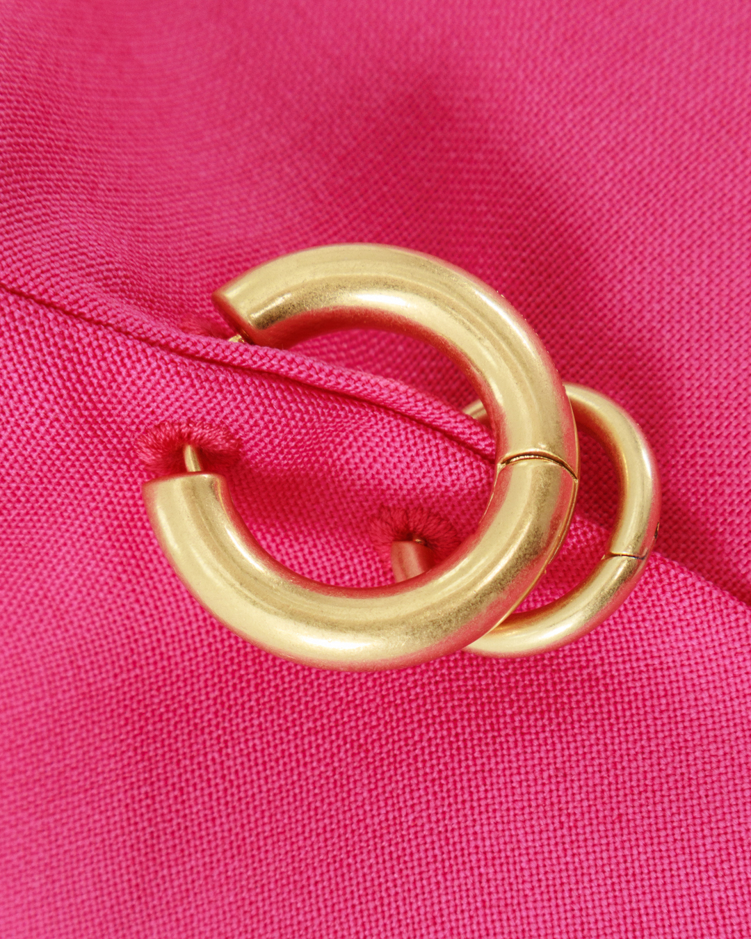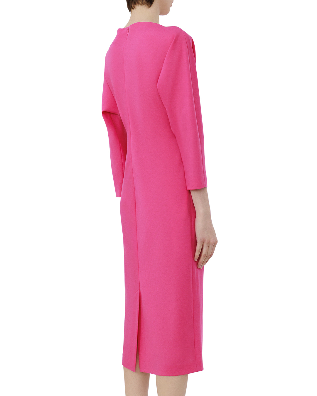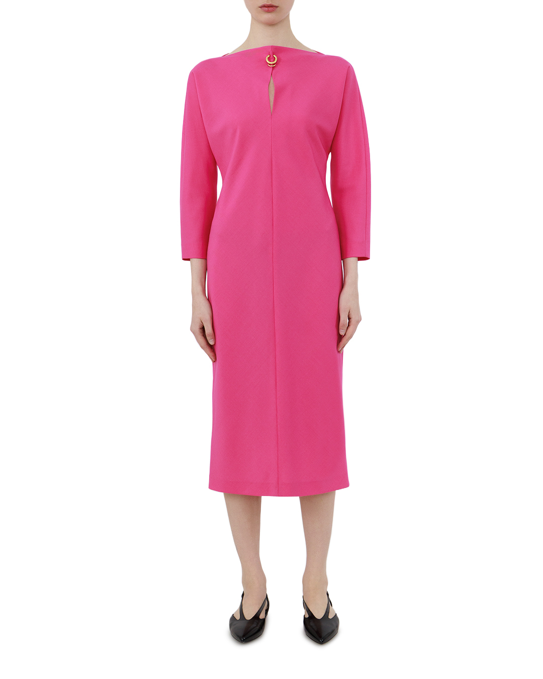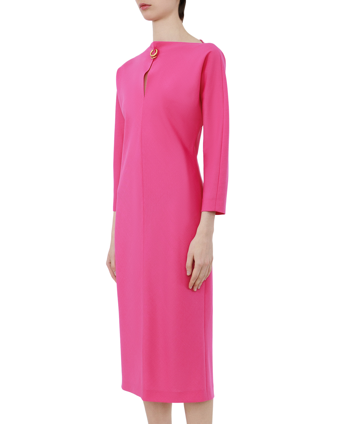 Это платье-футляр розового оттенка — воплощение современной элегантности. Силуэт приталенный, подчёркивает линии фигуры, создавая образ утончённой женственности. Рукава три четверти лаконично дополняют композицию, не перегружая образ. Вырез оформлен с изысканным акцентом — небольшой вертикальный разрез, обрамлённый декоративной застёжкой золотистого оттенка. Эта деталь придаёт вещи нотку игривости, сохраняя общую строгость кроя. Чистые линии швов и отсутствие избыточной отделки подчёркивают качество исполнения. Гладкая фактура материала и насыщенный цвет делают платье выразительным элементом гардероба, способным превратить любой образ в эффектный и запоминающийся.