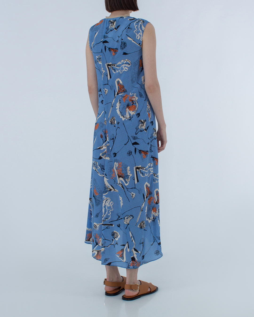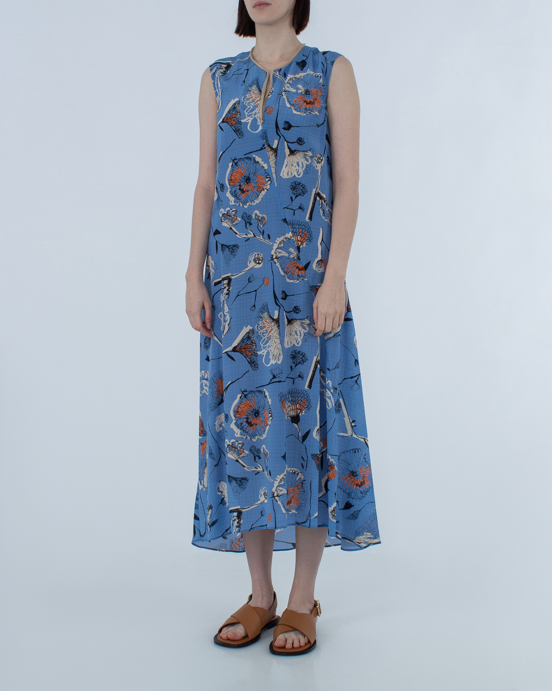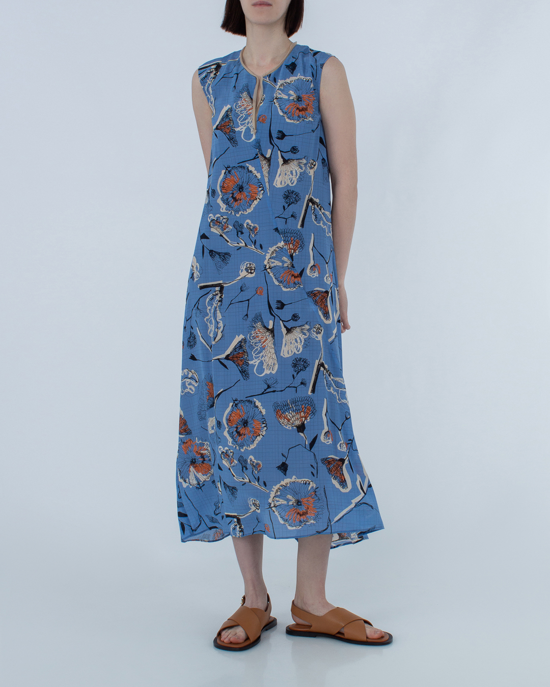 Платье ALYSI выполнено из шелка с цветочным рисунком. Модель А-образного силуэта с застежкой с лицевой стороны по линии круглого выреза.