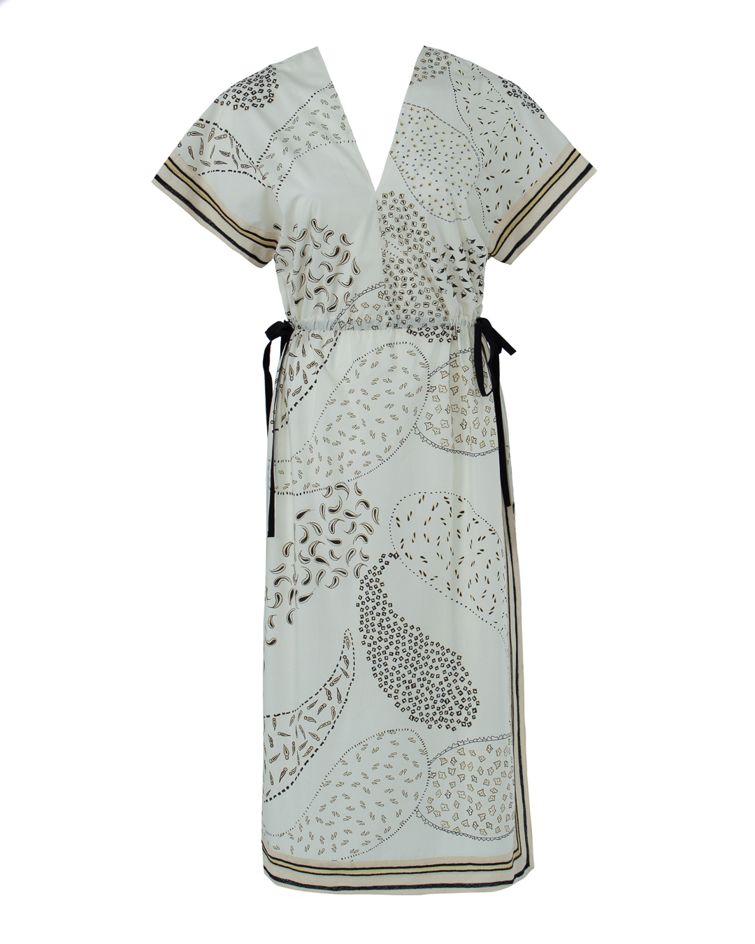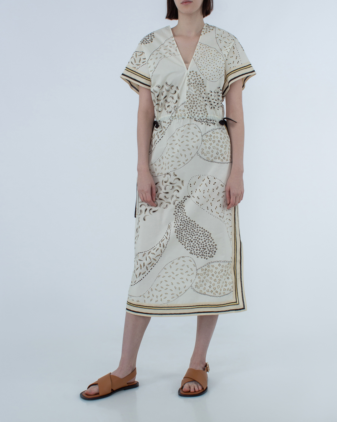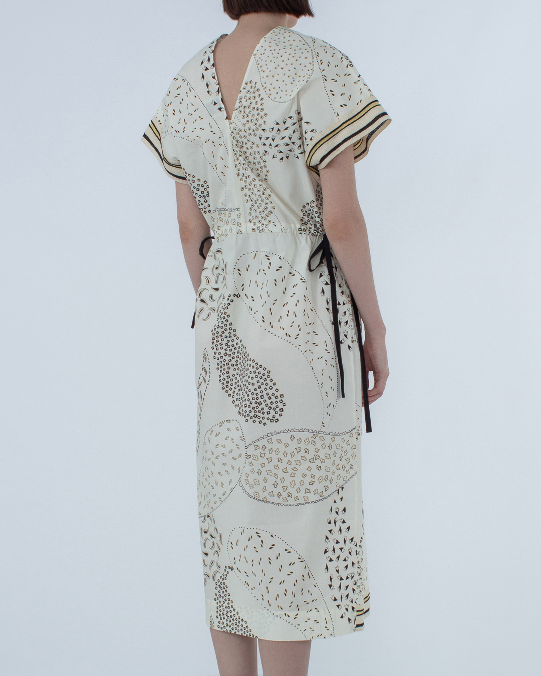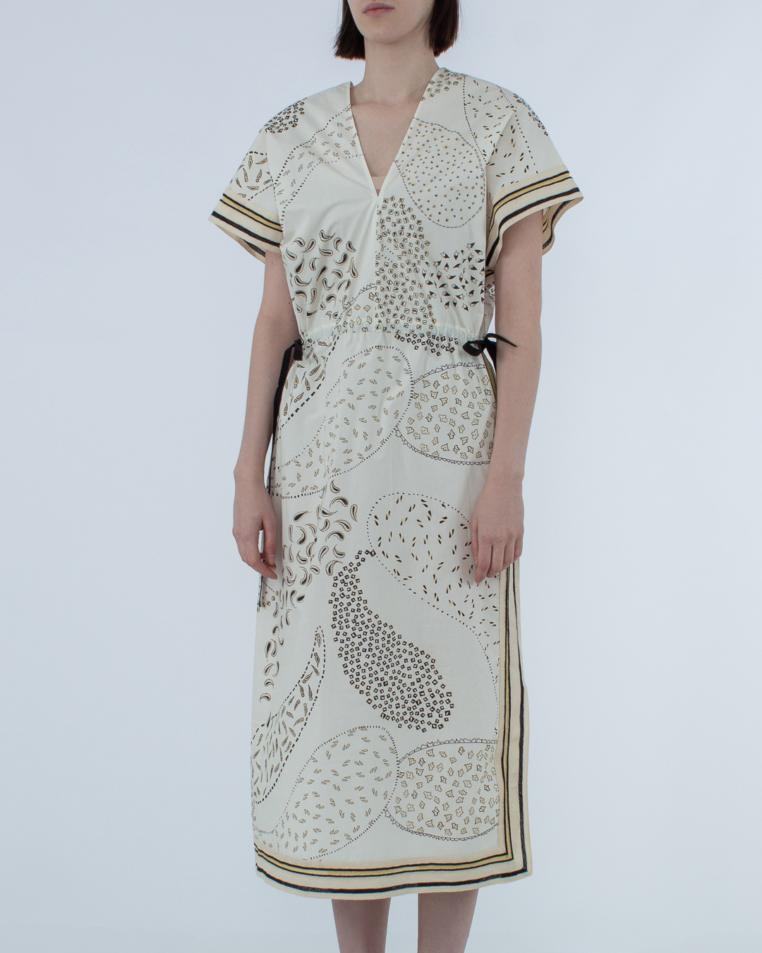 Платье ALYSI выполнено из хлопка с принтом. Приталенное изделие длины миди с завязками по бокам по линии пояса. Изделие дополнено цельнокроеными широкими рукавами и V-образными вырезами.
