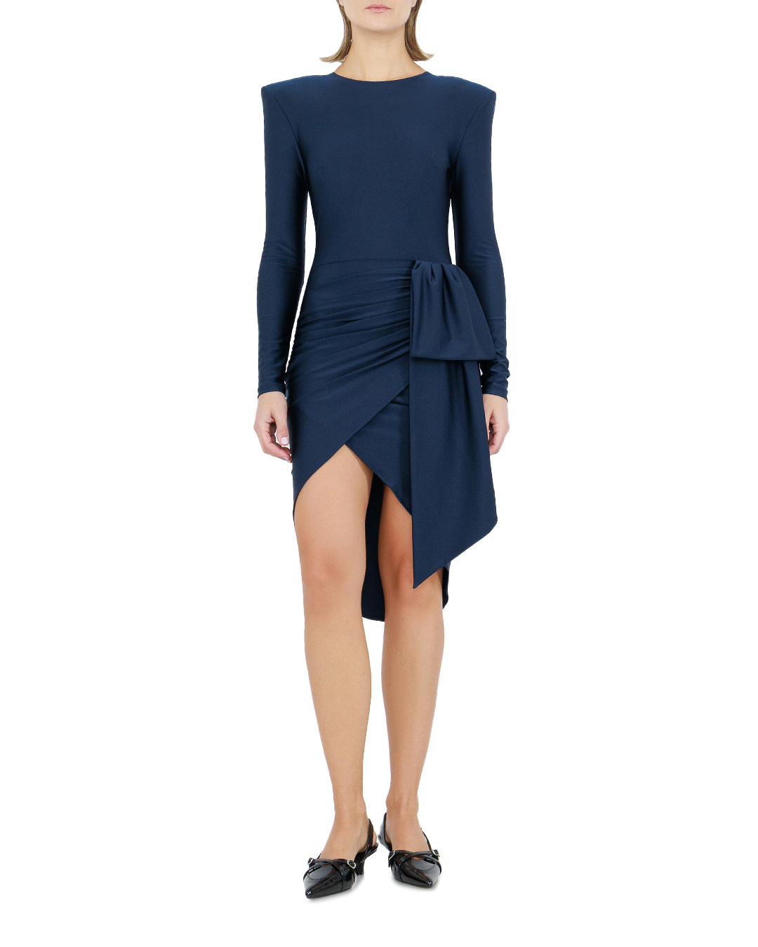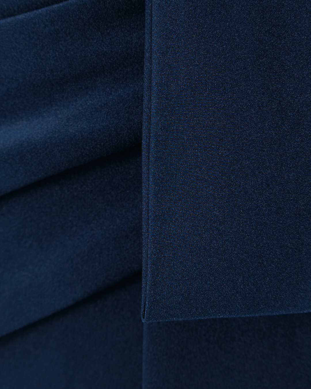 Облегающее платье с подплечниками из эластичной ткани. Подчеркнуто-женственный силуэт создается за счет эластичной ткани, драпировки на юбке и элегантному узлу на талии. Глубокий синий цвет добавляет изысканности. Модель идеально подойдет для вечерних выходов и торжественных мероприятий.