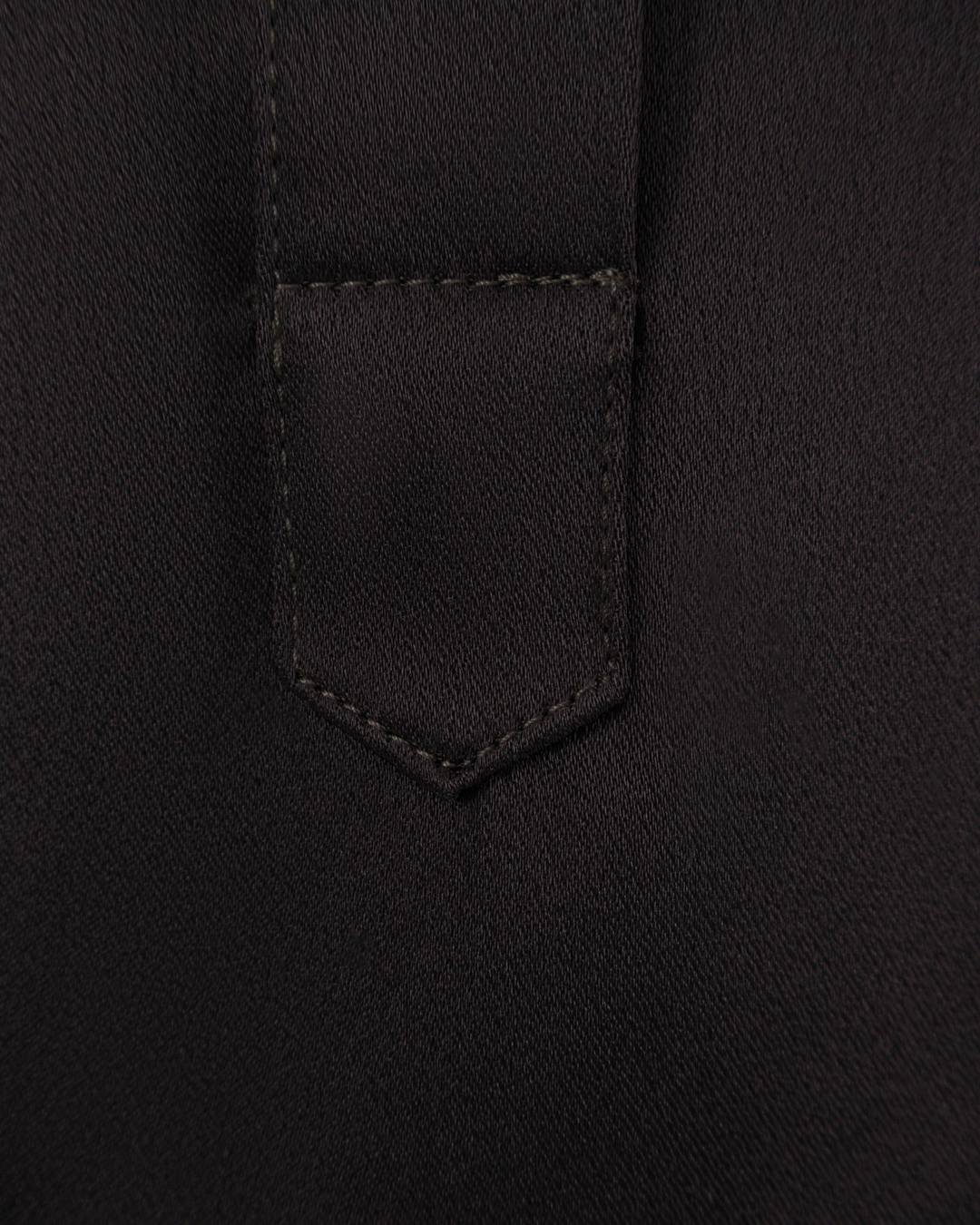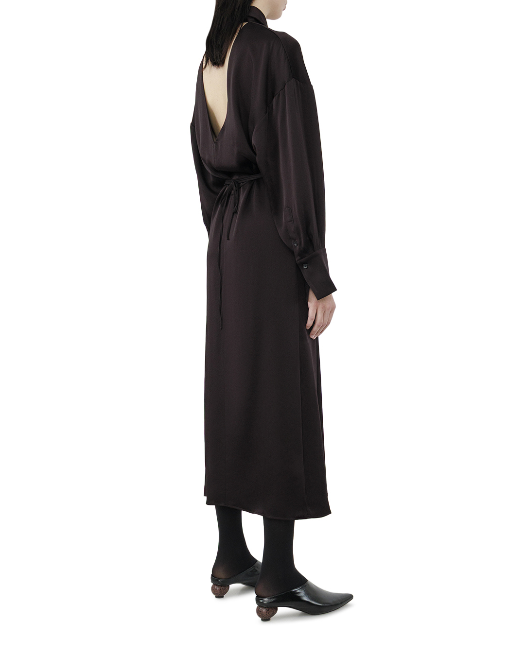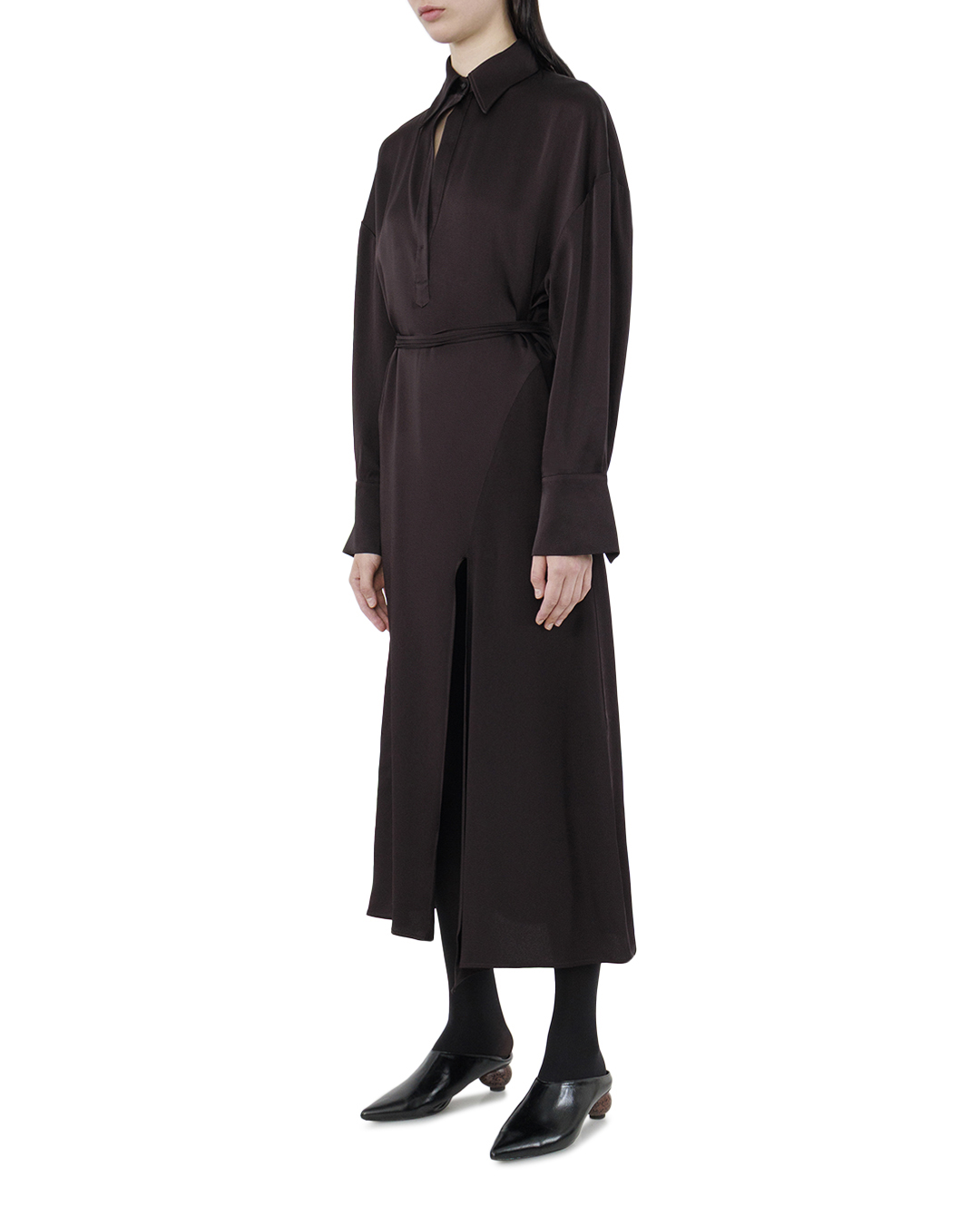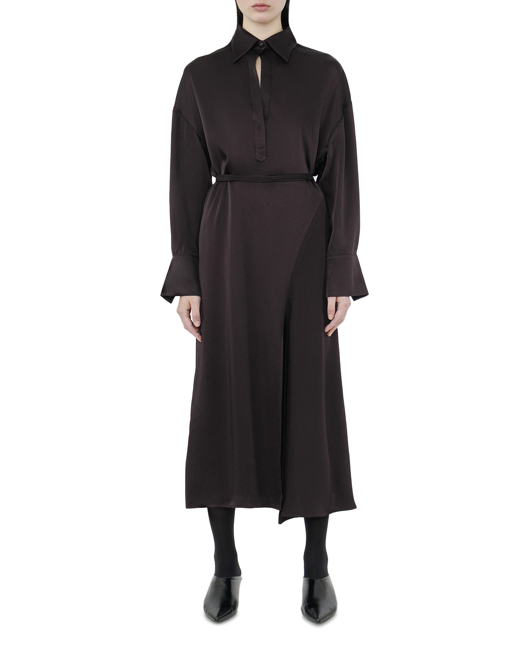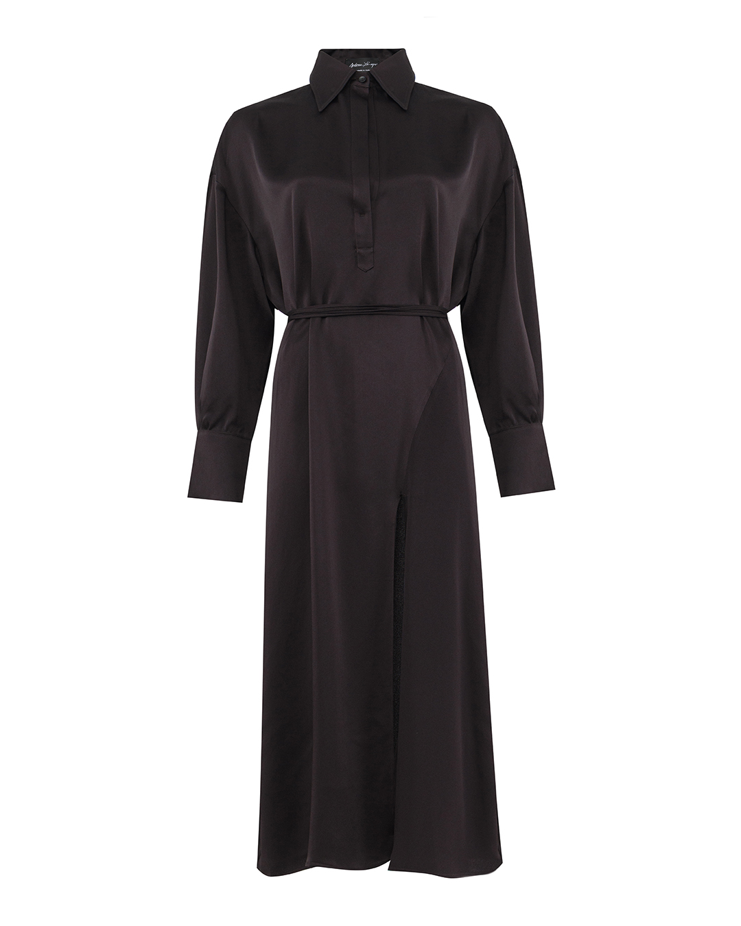 Это платье — воплощение утонченной элегантности и стиля с нотками ретро-шика. Изящный крой, сочетающий классическую рубашечную основу с современными акцентами, делает его идеальным выбором для стильной женщины. Платье изготовлено из гладкой, струящейся ткани, создающей мягкую драпировку и изысканный блеск при движении. Глубокий, насыщенный цвет материала добавляет ему аристократизма и универсальности. Классический воротник и планка на пуговицах придают платью структурированность и сдержанную элегантность, подчеркивая шейную зону и добавляя деловой акцент. Оригинальная линия плеч и длинные рукава с манжетами создают благородный силуэт, делая образ завершенным и гармоничным. Тонкий пояс деликатно акцентирует талию, создавая женственный силуэт и позволяя регулировать посадку платья по фигуре. Эффектный разрез на юбке добавляет динамики и смелой элегантности, открывая при ходьбе соблазнительный вид ноги. Это платье легко сочетает в себе шик и комфорт, подходя для разнообразных случаев — от рабочих встреч до вечерних мероприятий, акцентируя стиль и уверенность своей обладательницы.
