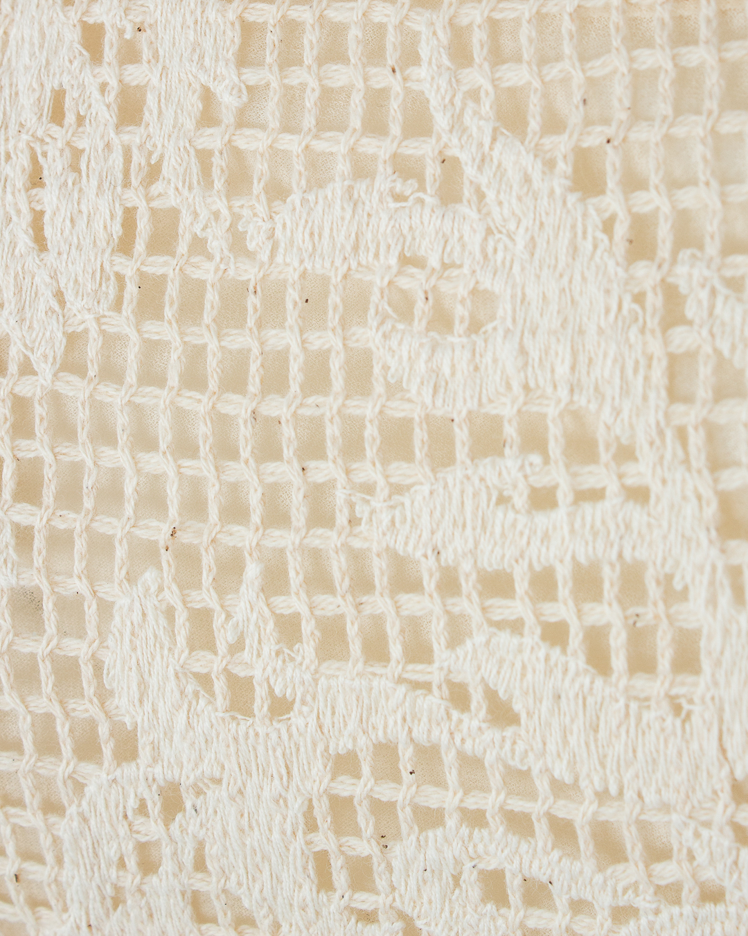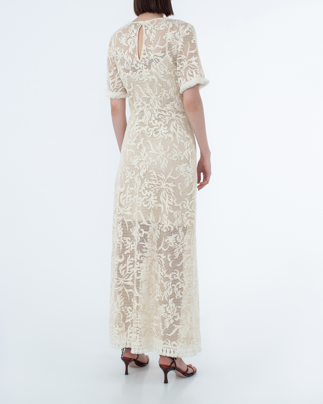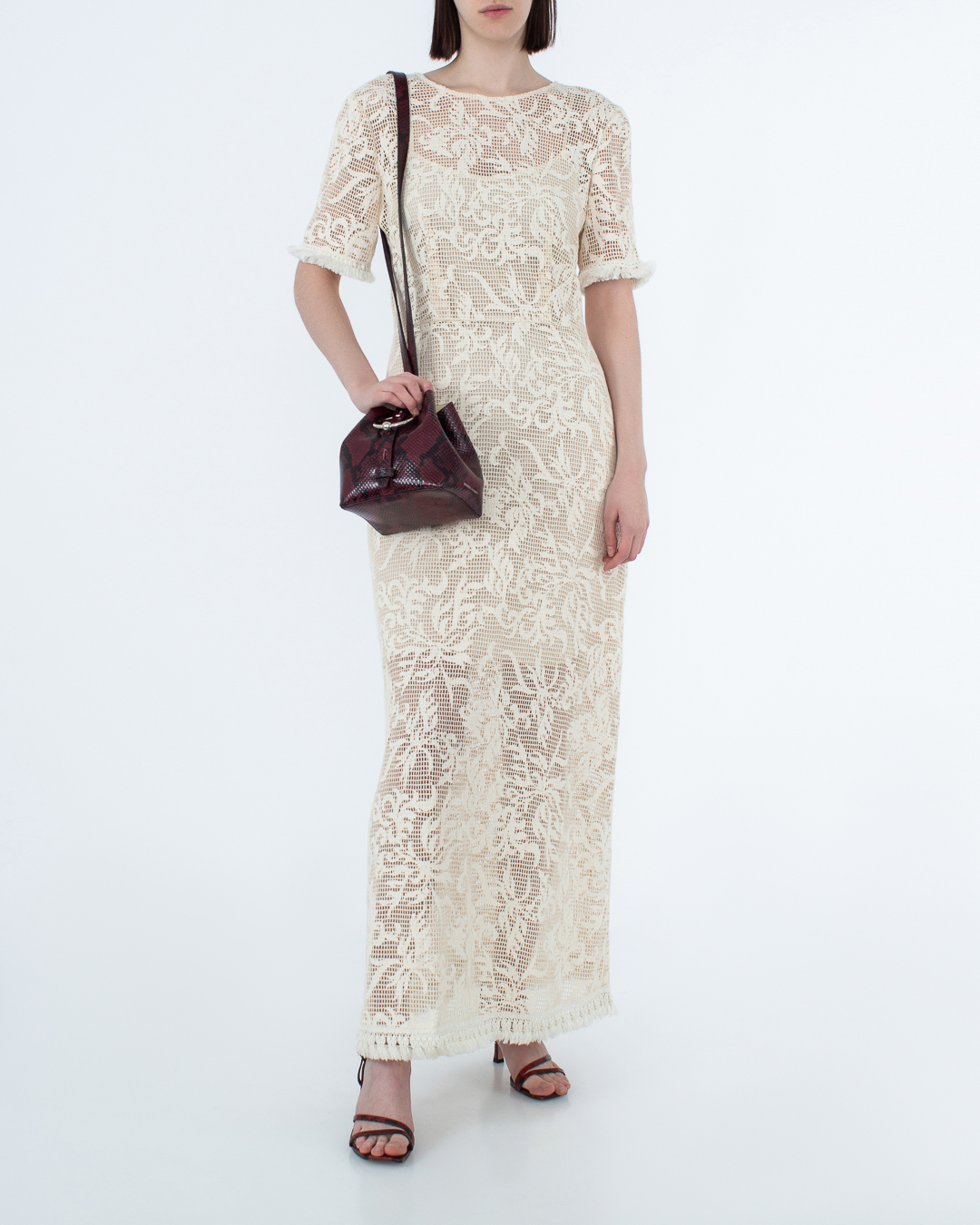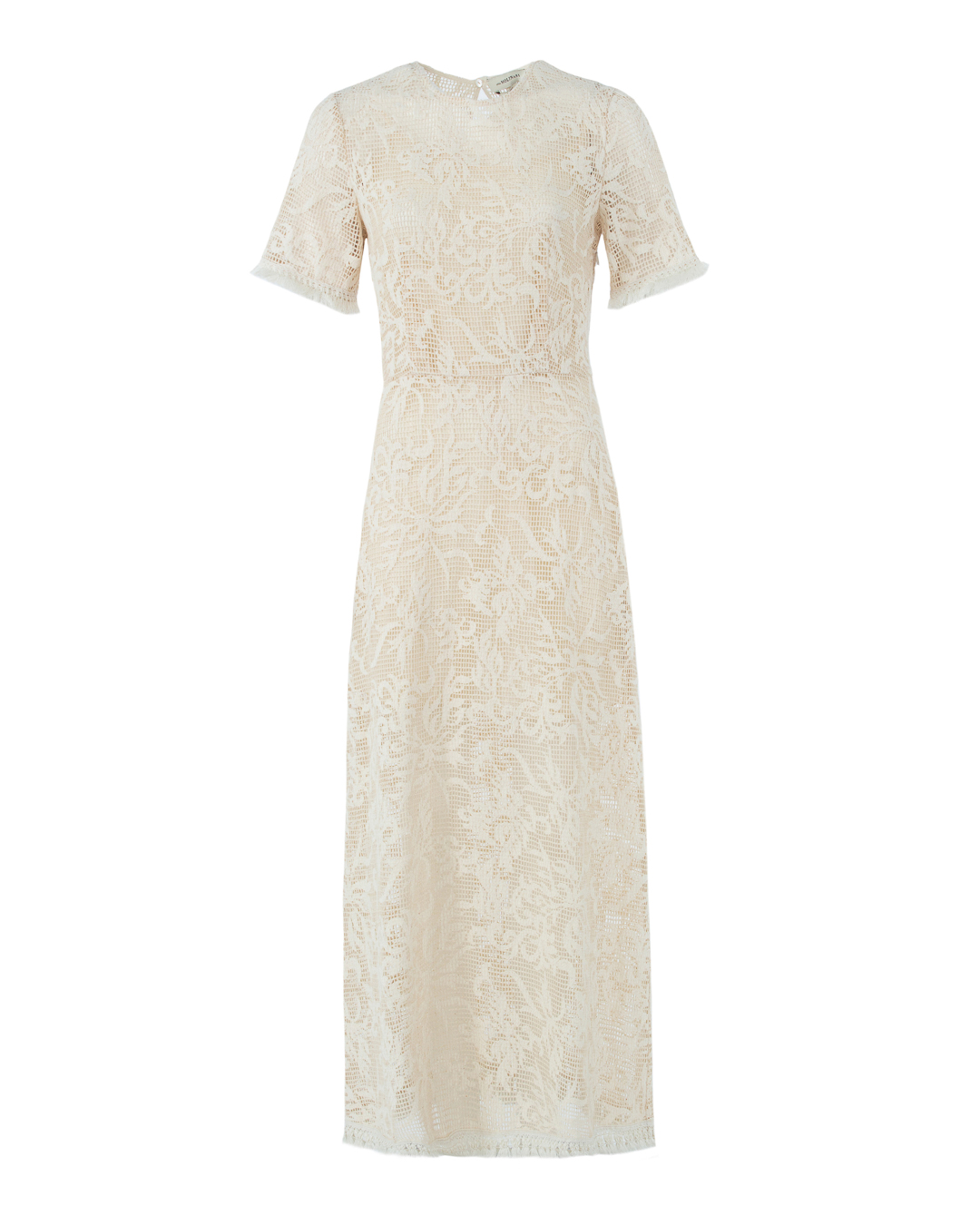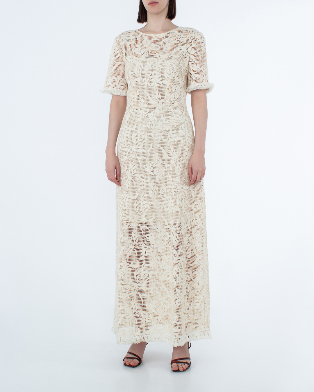 Платье Anna Molinari из новой коллекции сшили из хлопкового шитья молочного оттенка с узором. Модель приталенного силуэта с отрезной по линии пояса.