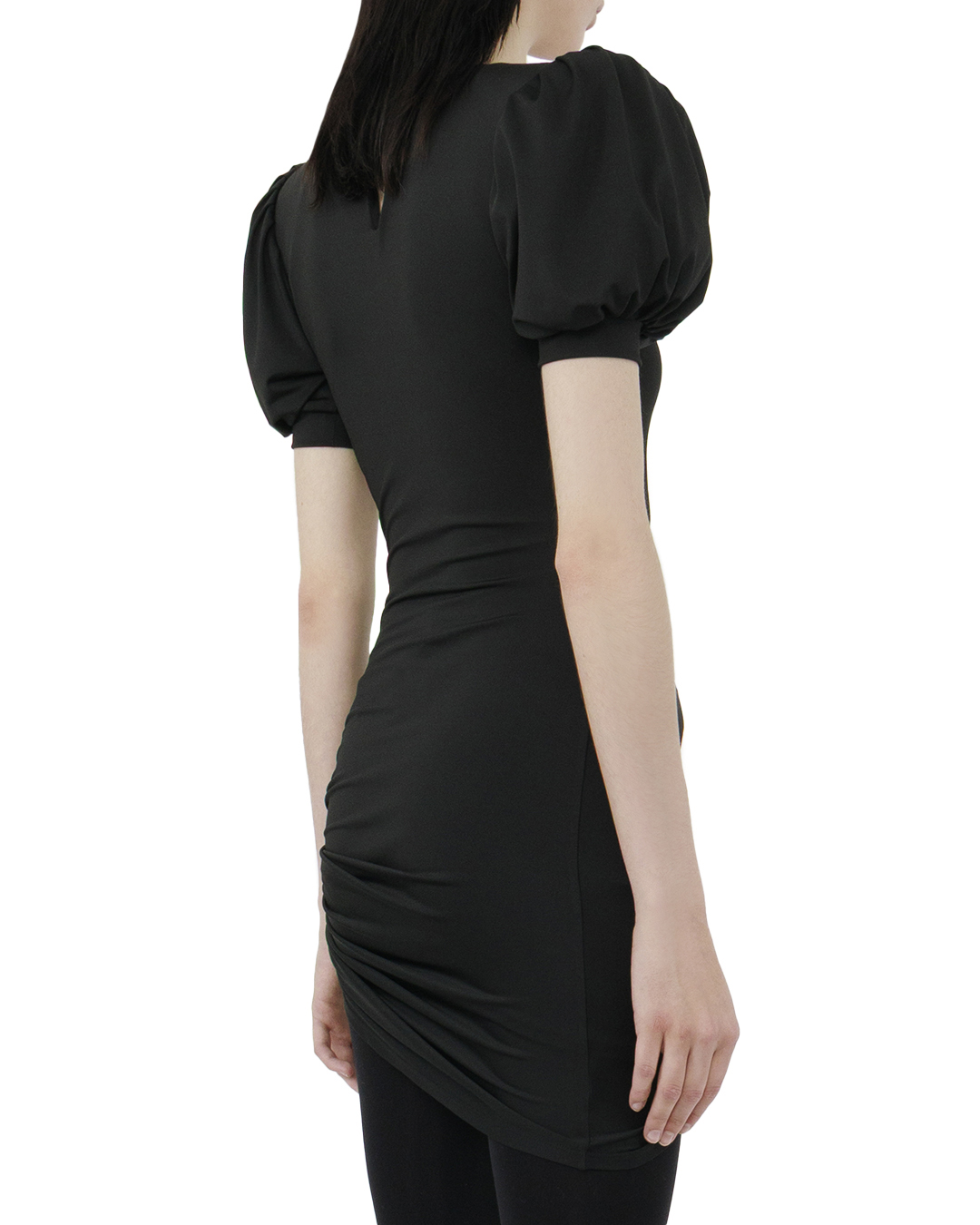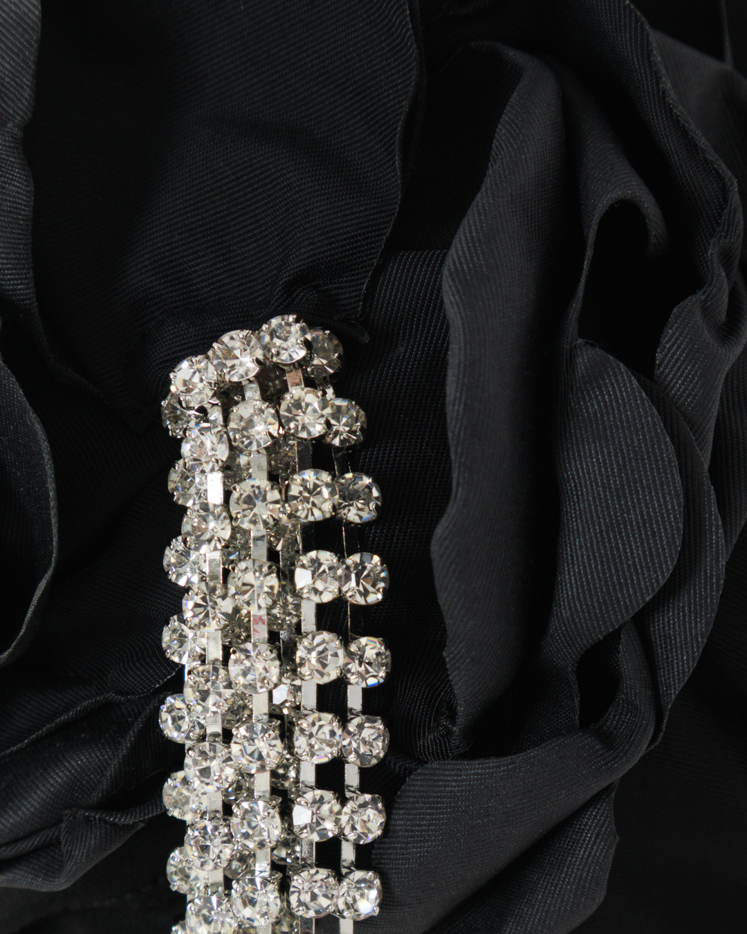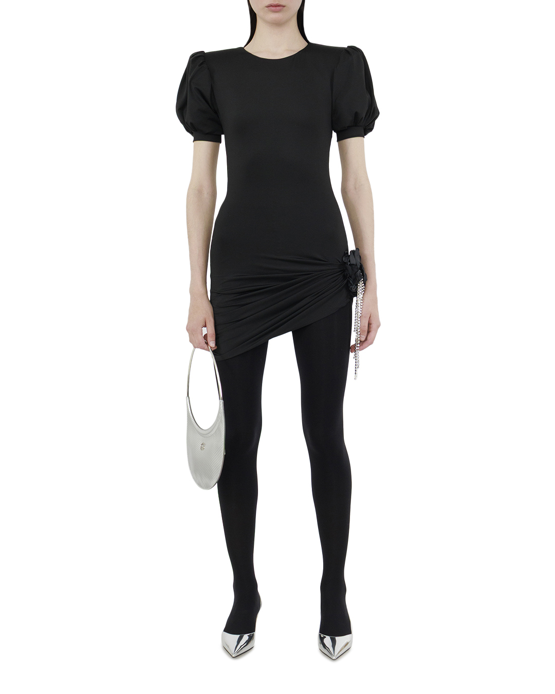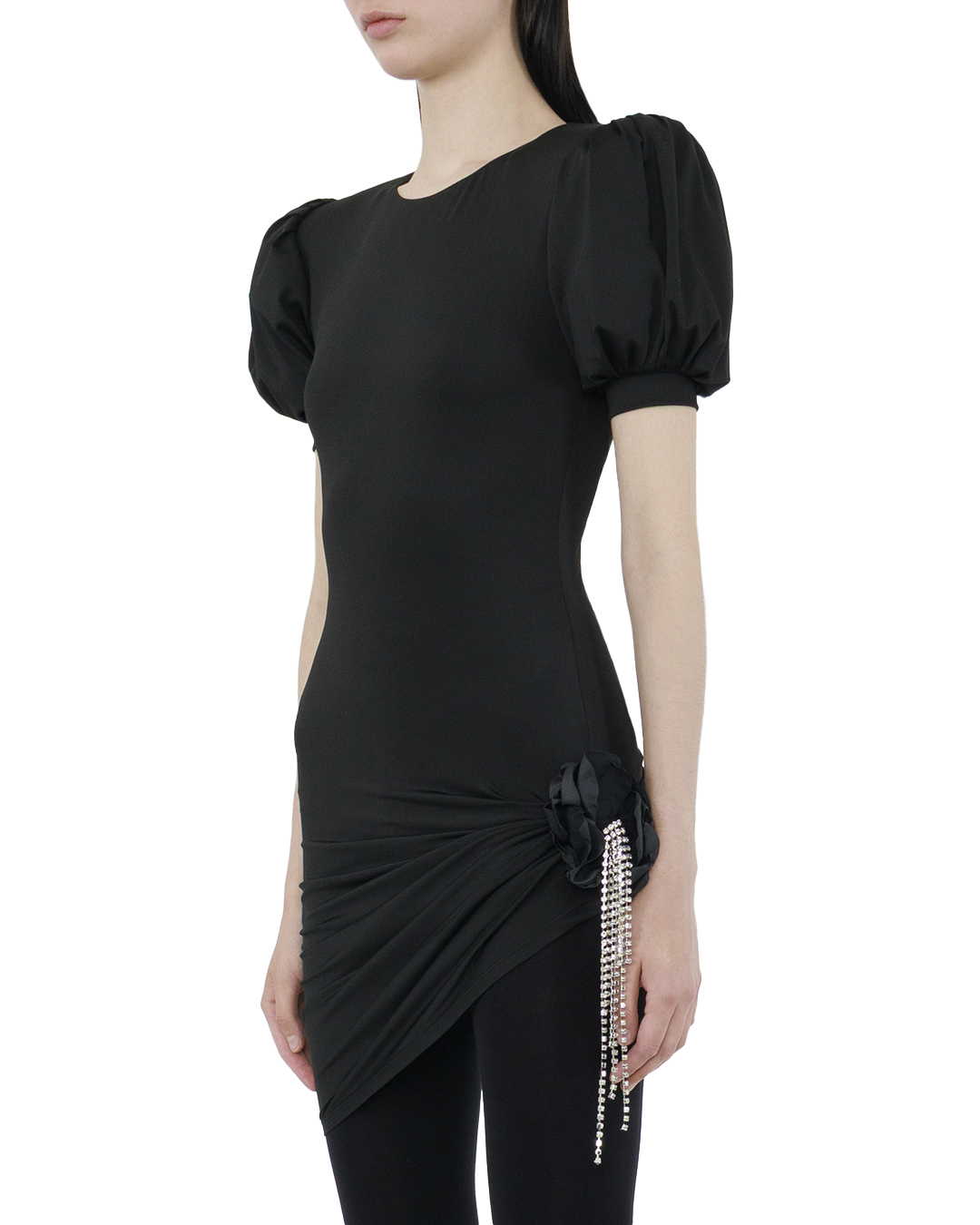 Это платье — воплощение сдержанной элегантности и утонченного вкуса. Выполненное из черной эластичной ткани, оно идеально обрамляет силуэт, создавая изысканную фигуру и придавая образу универсальность, подходящую как для вечерних выходов, так и для особых событий. Акцент на рукавах выполнен в формате объемных буфов, которые добавляют трендовый элемент и придают романтичность и динамику всему образу. Такой дизайн создает интересный контраст с обтягивающим силуэтом, подчеркивая женственность и грацию. Легкая драпировка сбоку плавно переходит в асимметричный подол, создавая визуально стройные линии и добавляя нотку авангардности. Этот элемент подчеркивает индивидуальный стиль платья и позволяет добиться уникальной игры светотени на ткани. Сама по себе изюминка платья — декоративный цветочный элемент, украшенный ниспадающими кристальными нитями. Эти детали привносят элемент роскоши и блеска, привлекая внимание к каждому вашему движению. Это платье идеально подойдет для тех, кто чувствует стиль и стремится выразить свою индивидуальность через безупречные детали и качественный крой.