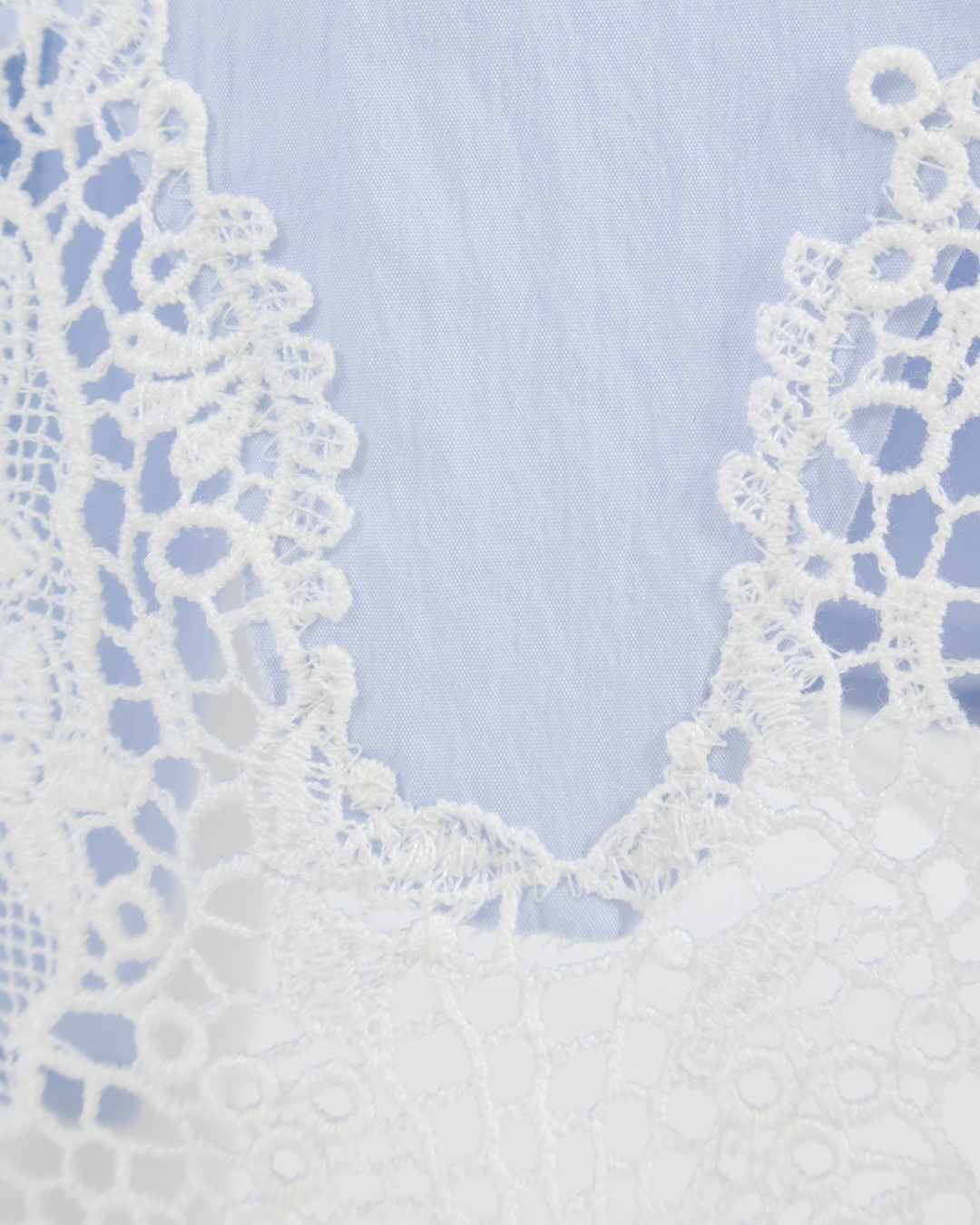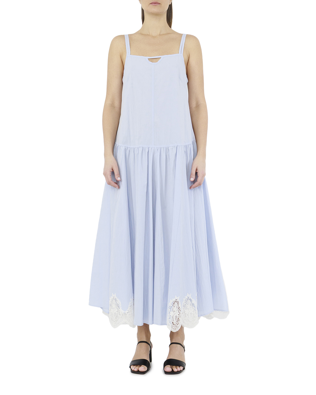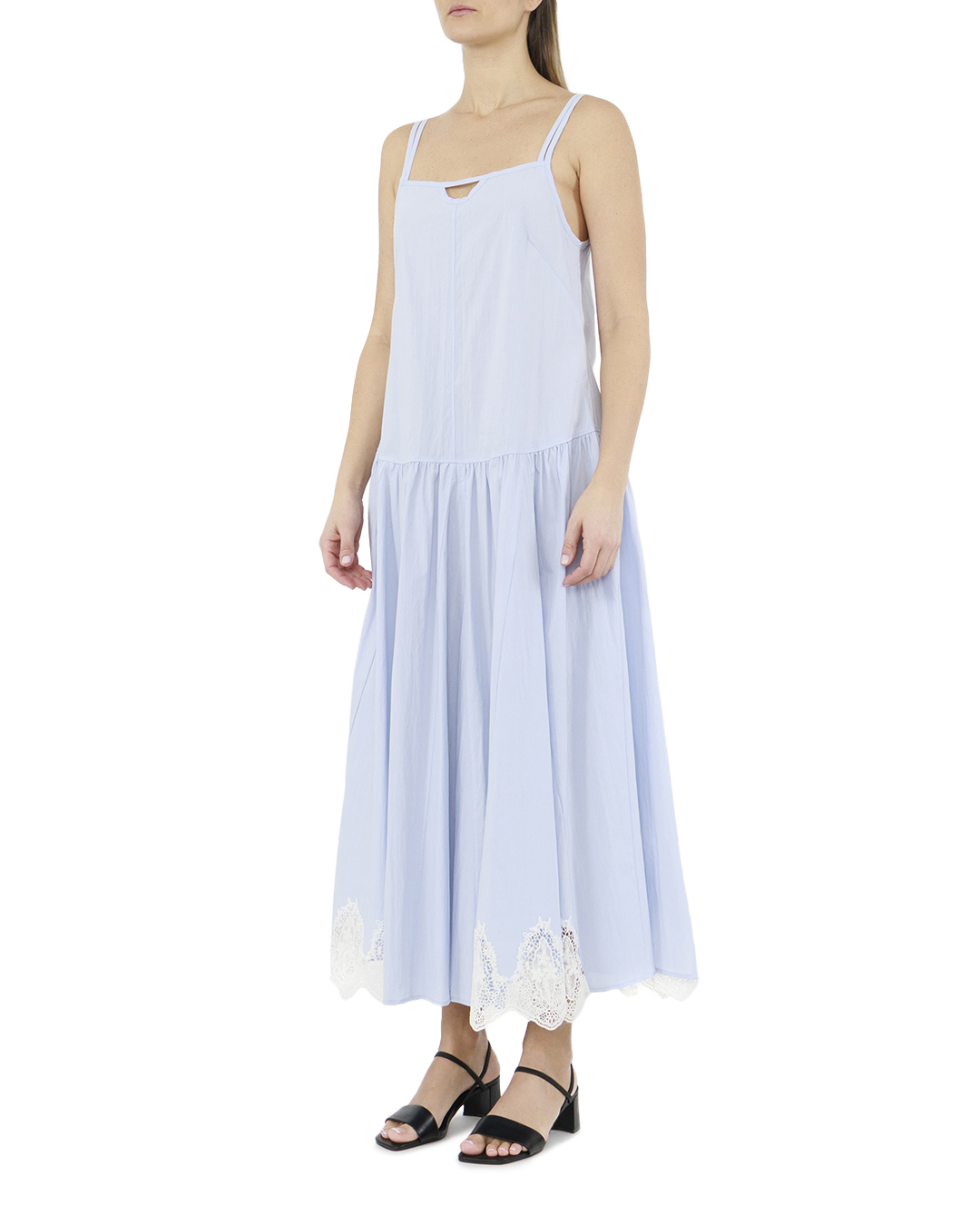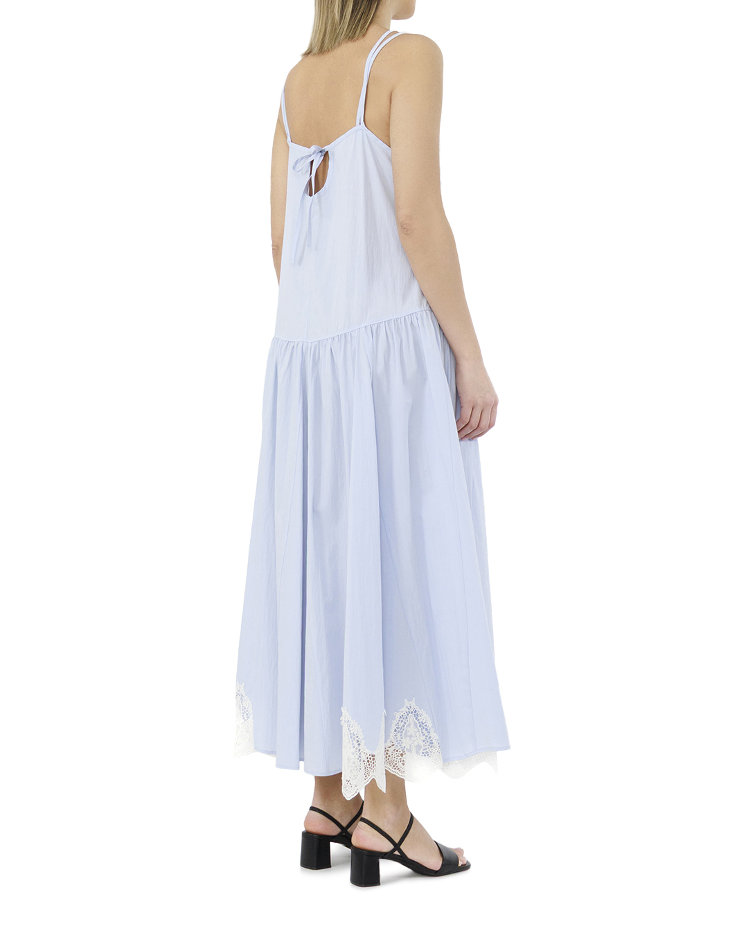 Платье нежно-голубого оттенка изготовили из органического хлопка и украсили белоснежным кружевом. Модель А-силуэта подходит любой фигуре, а длина до середины щиколодки позволяет носить платье как с каблуком, так и с обувью на плоском ходу.