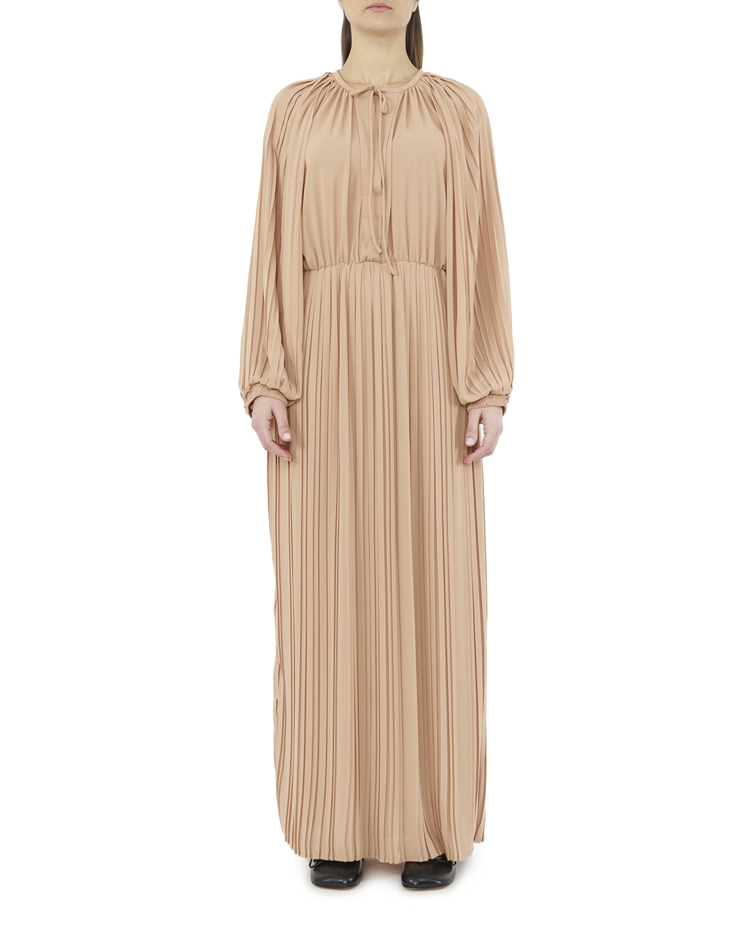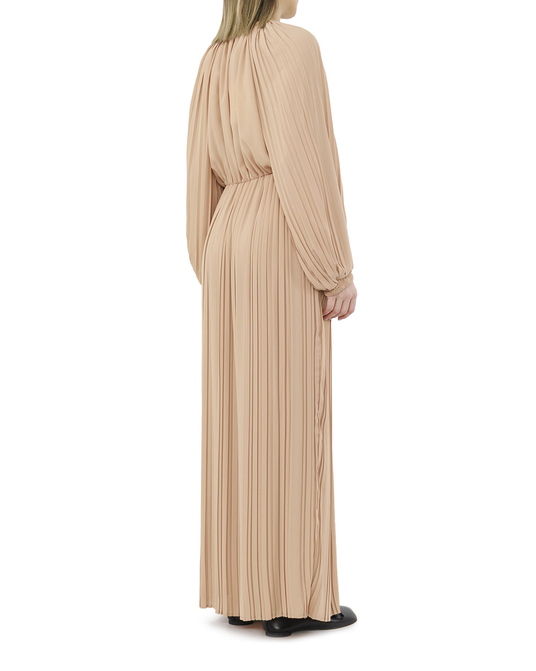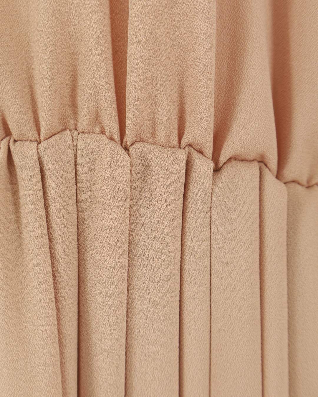 Это платье от BEATRICE — истинное отражение изысканной элегантности и современного шика. Выполненное в нежном бежевом цвете, оно излучает утонченность и благородство. Плиссированный дизайн добавляет динамику и текстурность, создавая впечатляющий эффект при каждом движении. Драпировка на линии талии подчёркивает фигуру и акцентирует внимание на женственном силуэте, делая его визуально стройнее. Плавный вырез с тонкой завязкой и длинные объёмные рукава с мягкими манжетами придают образу романтичность и невесомость. Это создаёт ощущение плавности и воздушности, усиливая общий изысканный стиль платья. Платье идеально комбинируется с изящными аксессуарами и обувью, что делает его превосходным выбором как для вечернего выхода, так и для особых мероприятий. Этот наряд станет незаменимым элементом гардероба для ценителей утончённой красоты и комфорта.