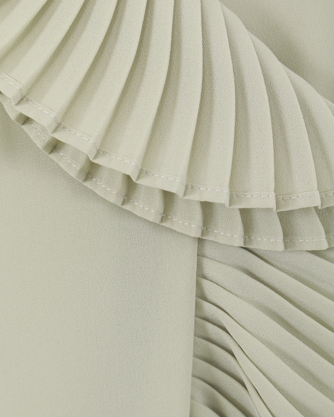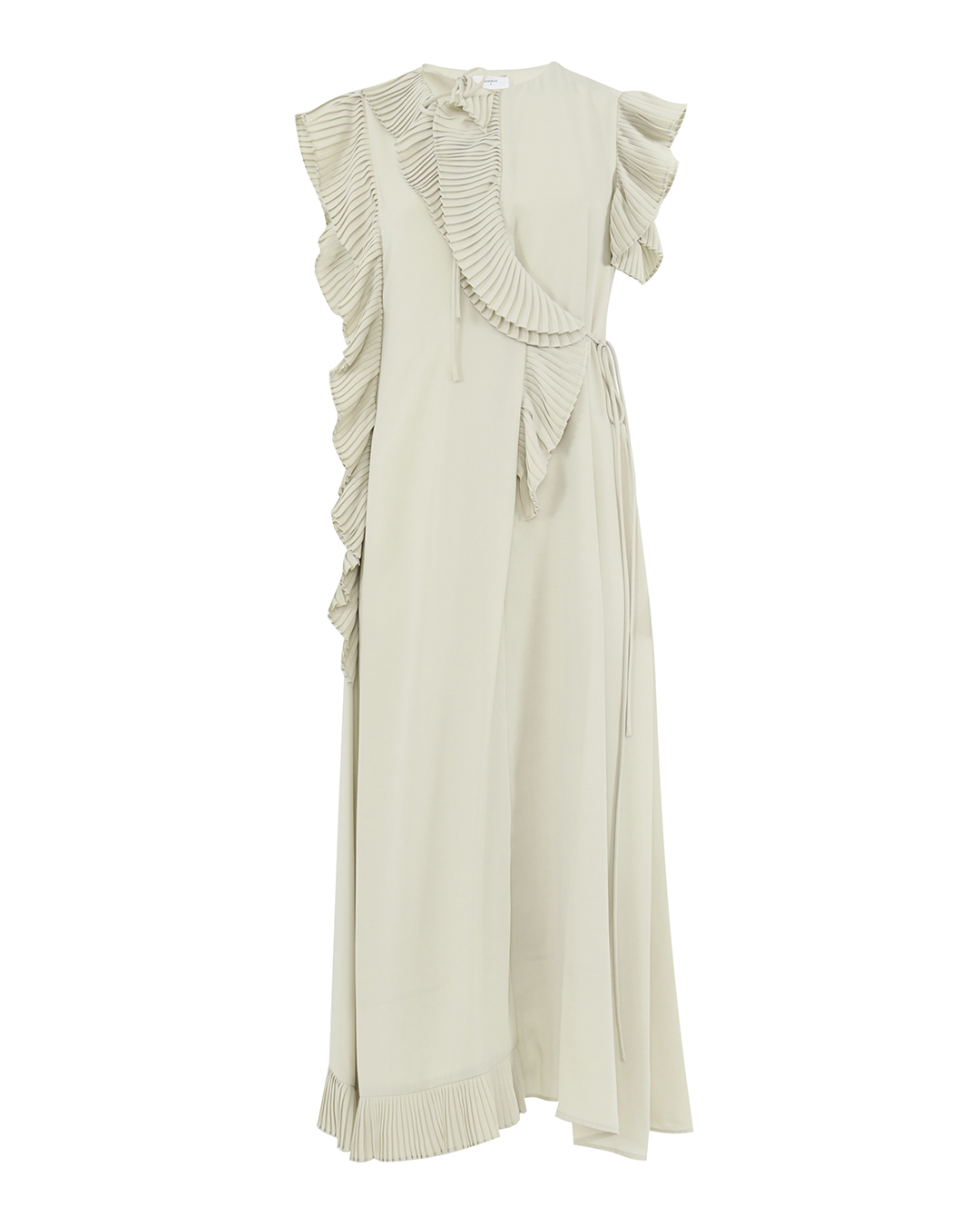 Платье оливкового оттенка с гофрированными рюшами на запах с завязками.