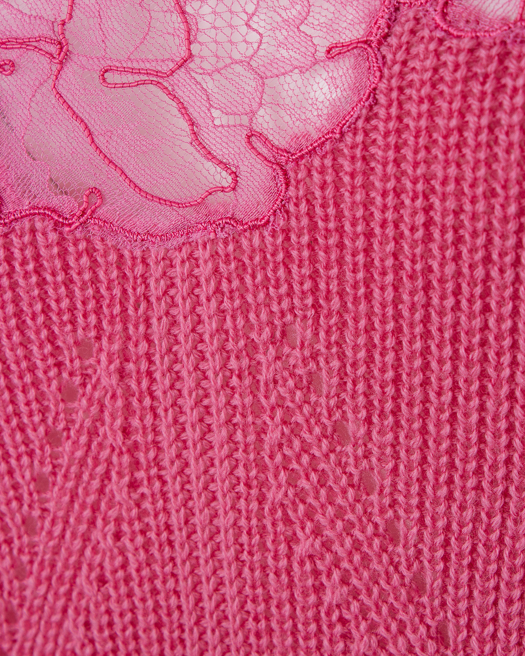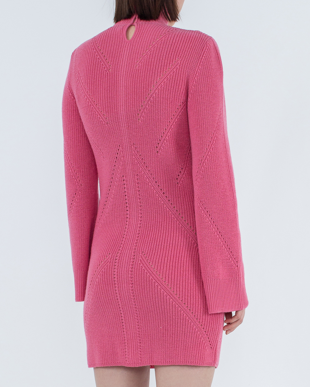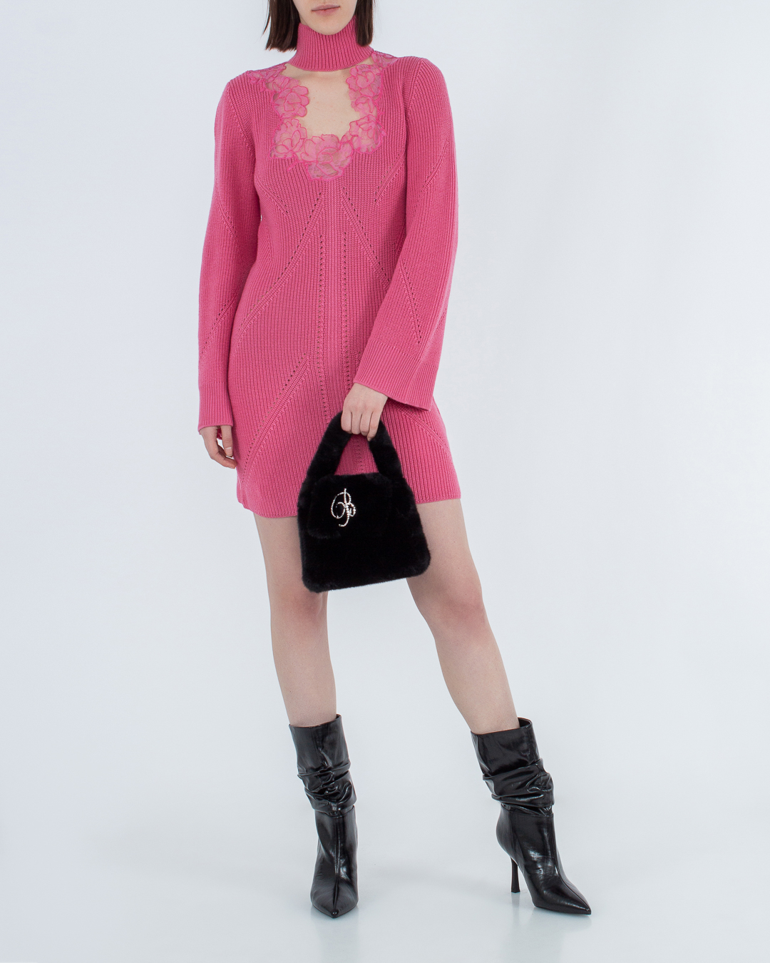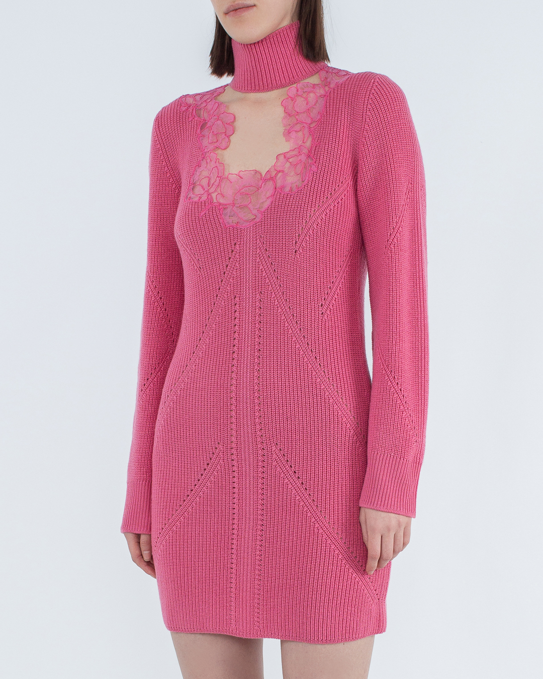 Вязаное платье из шерсти розового оттенка с отделкой гипюровыми розочками. Облегающее изделие длины мини с застежкой на спине.